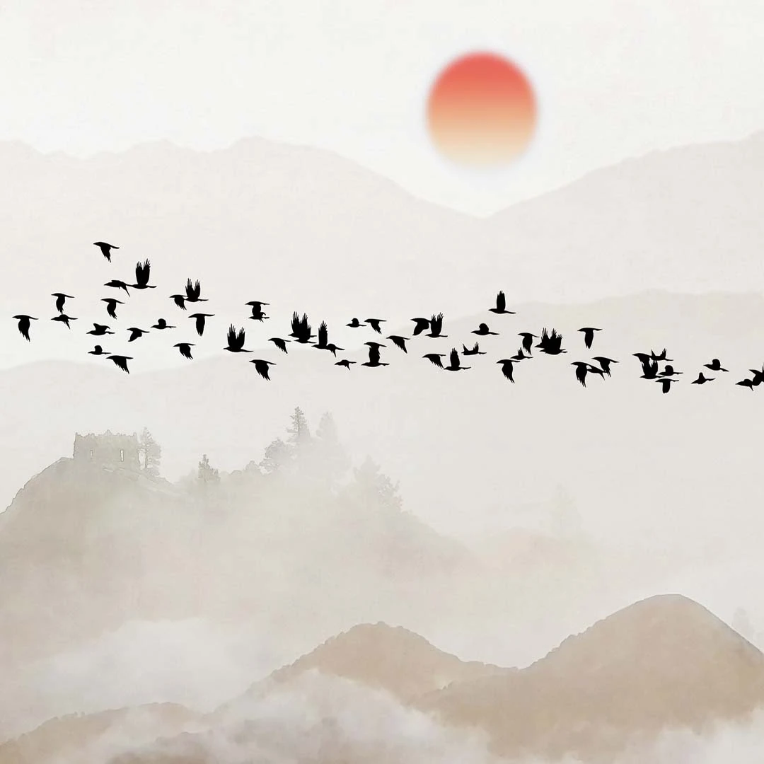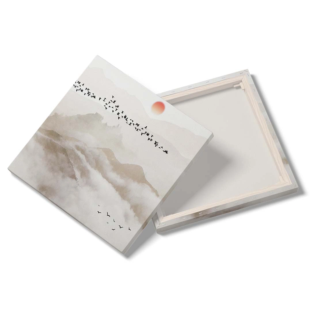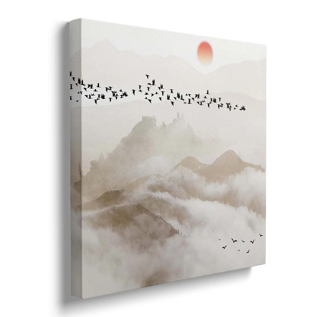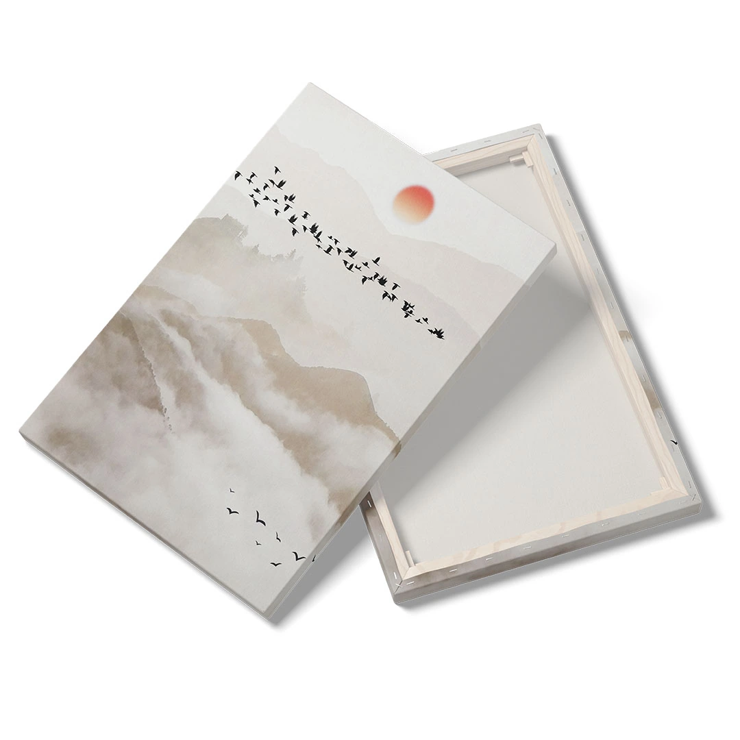 Obraz na płótnie - Pejzaż górski w odcieniach beżu z mgłą i ptakami