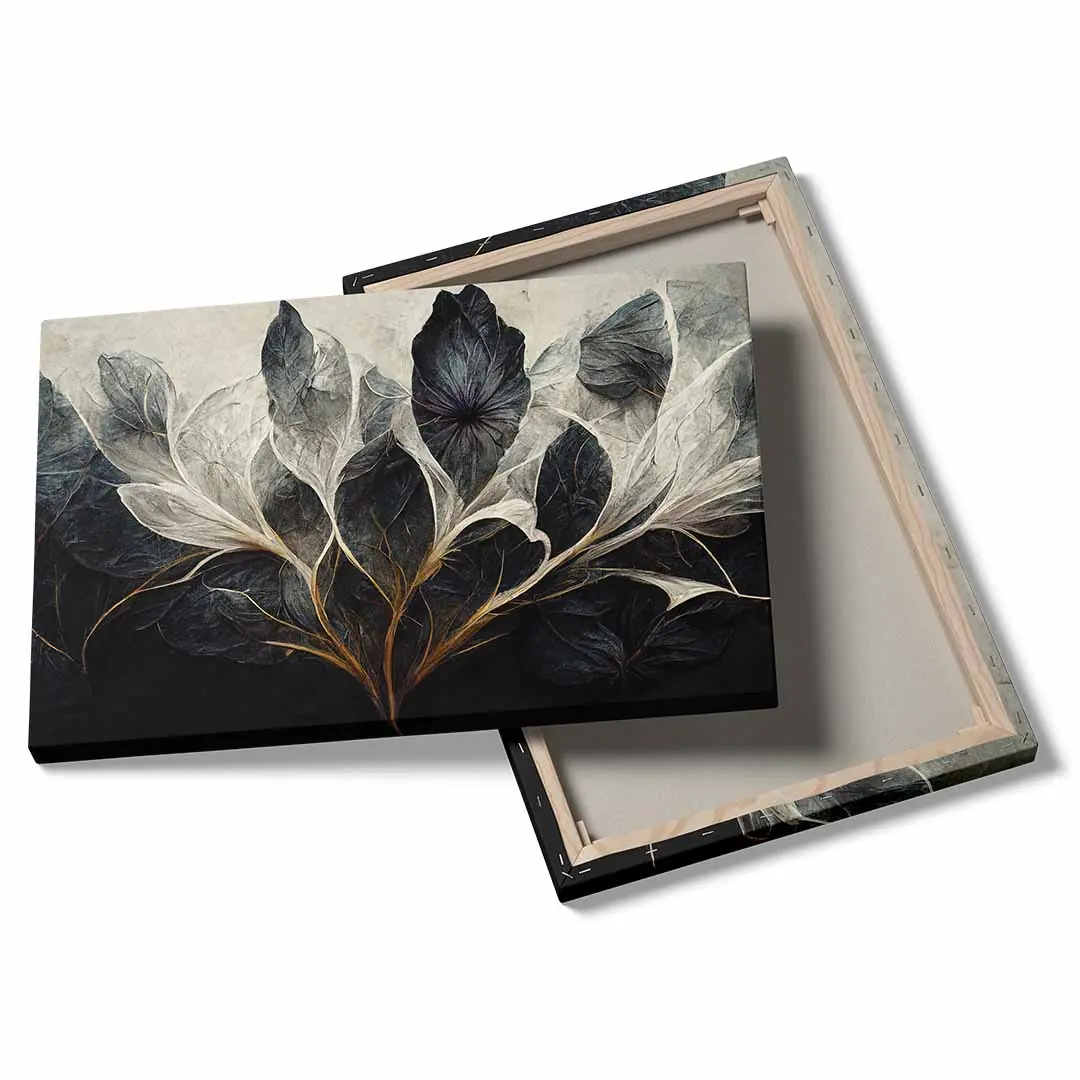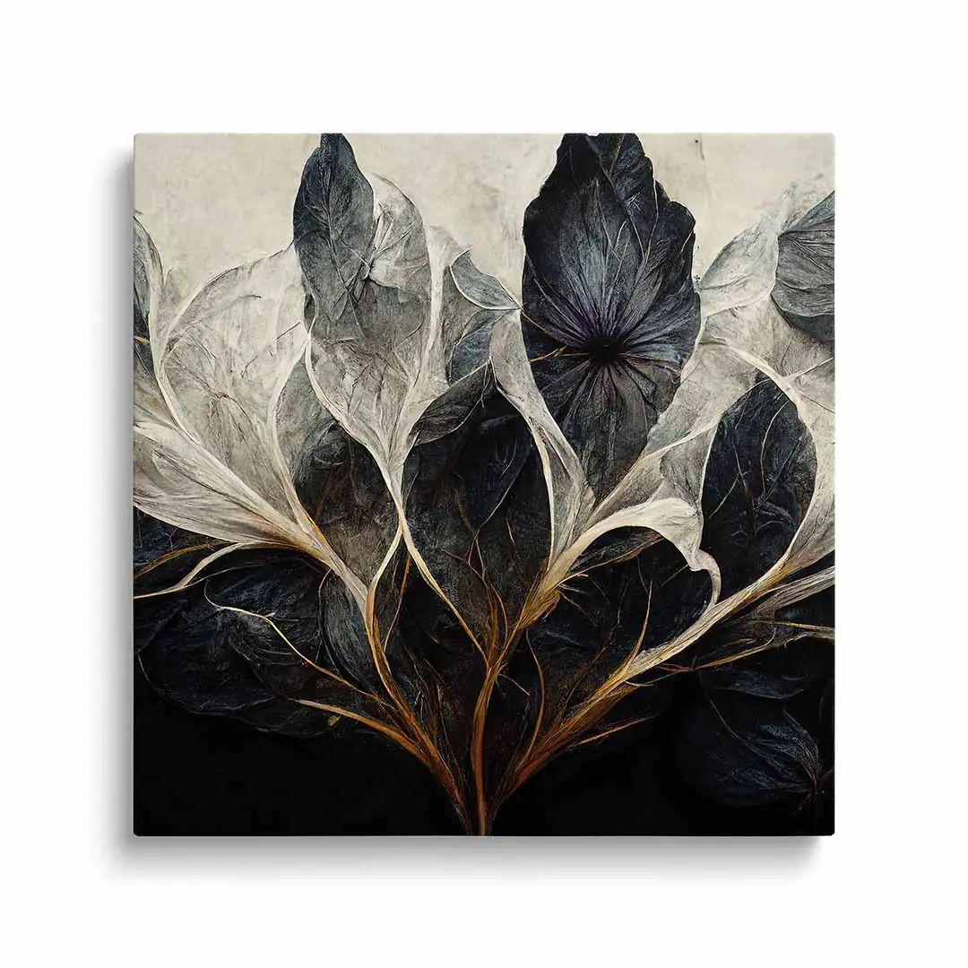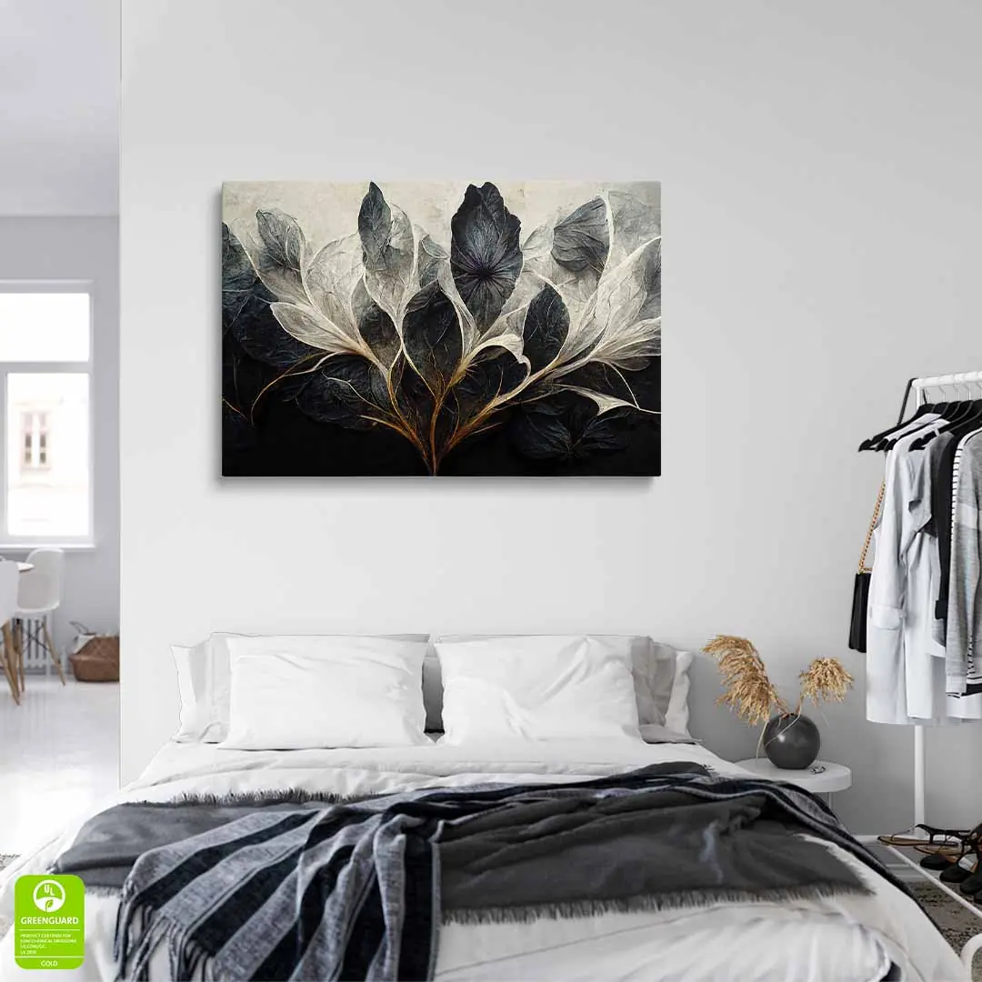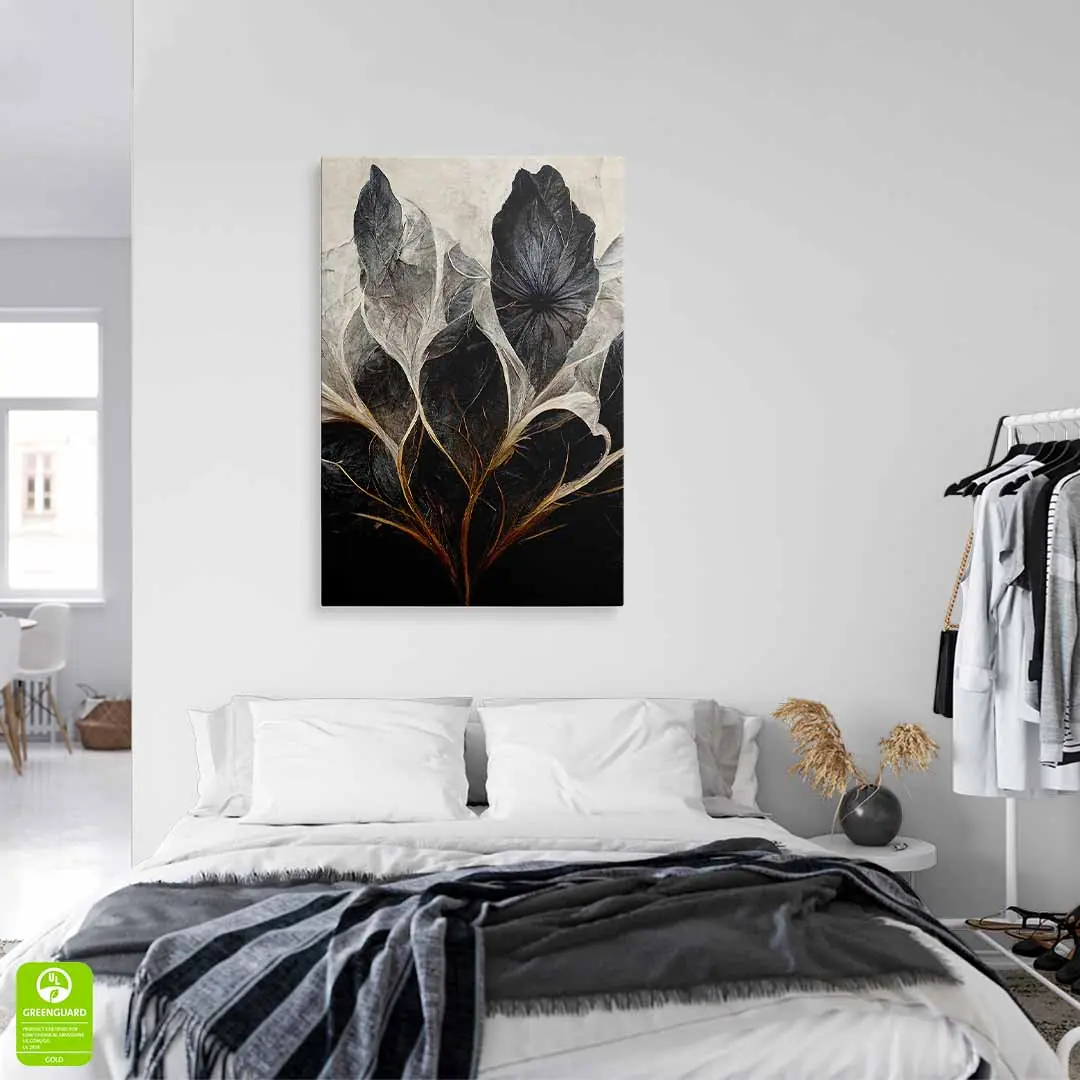 - techniką druku - proces drukowania wykorzystuje inne metody tworzenia kolorów (tzw. "przestrzeń barw") niż te, które stosowane są na ekranach komputera; kolory drukowane mogą wyglądać również nieco inaczej na różnych materiałach (np. canvasie, flizelinie, papierze czy szkle itp.) i przy użyciu różnych tuszy, w naszym przypadku tuszy do druku UV; złote elementy nie są wybiórczo metalizowane - efekt uzyskany jest poprzez wydruk tekstury w kolorze złota;
