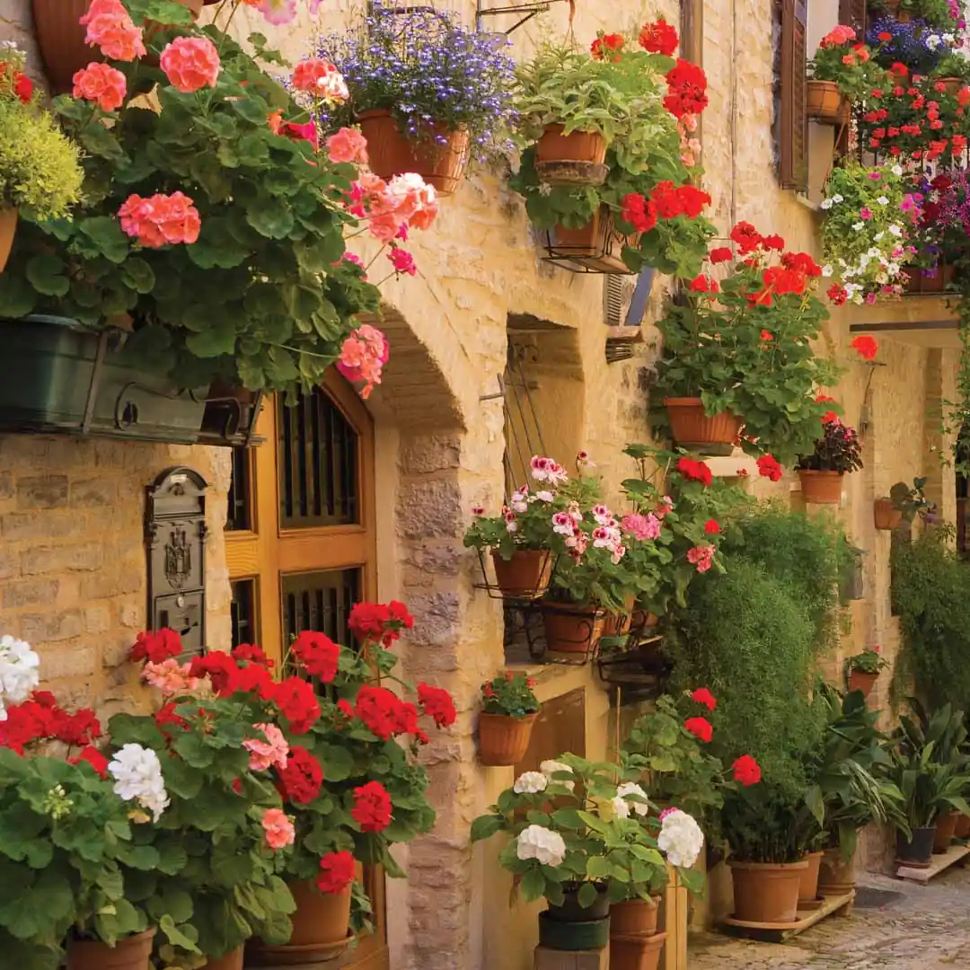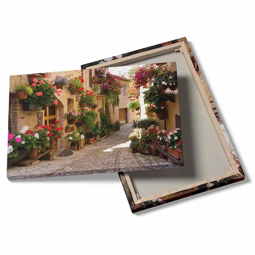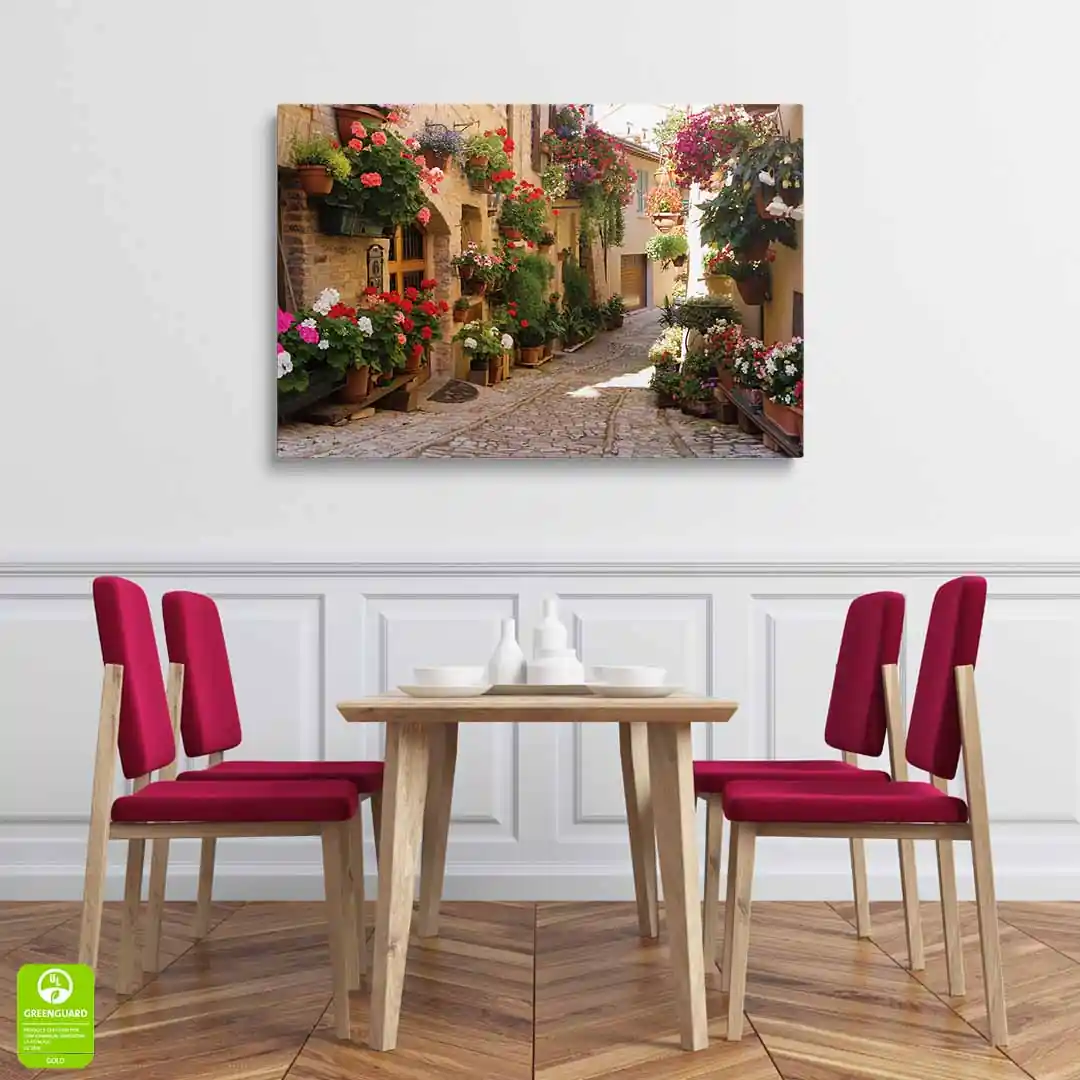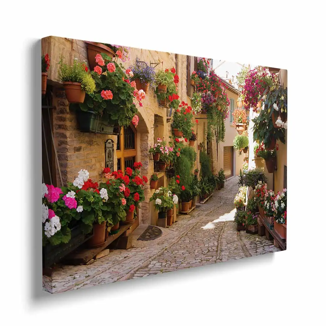 Obraz na płótnie - Urokliwa włoska uliczka 3d w Spello to nasza propozycja dla miłośników podróży i pięknych krajobrazów. Piękno naturalnego włoskiego krajobrazu zatrzymany w obrazie. Któż z nas nie chciałby przejść się spacerkiem w takim otoczeniu! Dzięki takiemu kadrowi mamy wrażenie, iż tylko jeden krok dzieli nas od przeniesienia się do Włoch! Przy niewielkich wnętrzach to świetne rozwiązanie, które daje nam wrażenie głębi i przestrzeni. Dzięki efektowi 3d mamy wrażenie, że pomieszczenie jest o kilka metrów dłuższe. Uroku dodają barwne kwiaty rozmieszczone wzdłuż ulicy w donicach, jak i zawieszone na kwietnikach. Piękne pelargonie, kwitnące surfinie: czerwień, róż, biel, fiolet, lawenda i soczysta zieleń. A do tego słoneczny, pogodny klimat. Jak nie czuć się dobrze w takim otoczeniu!