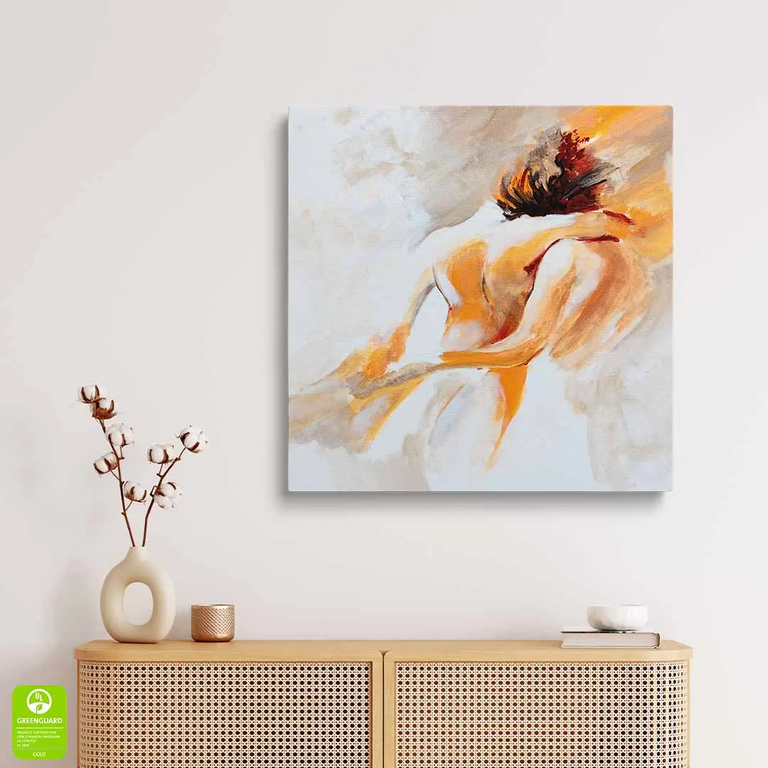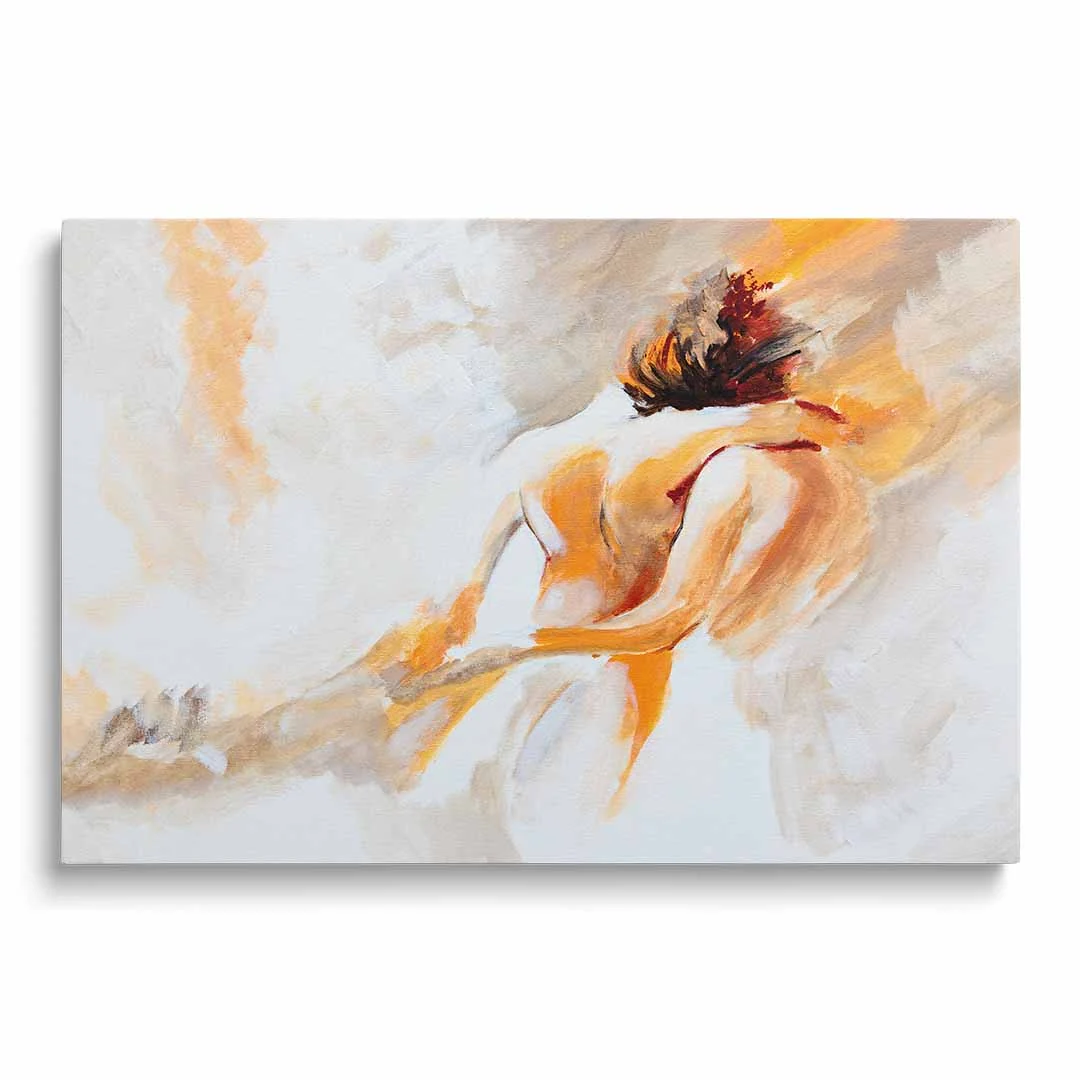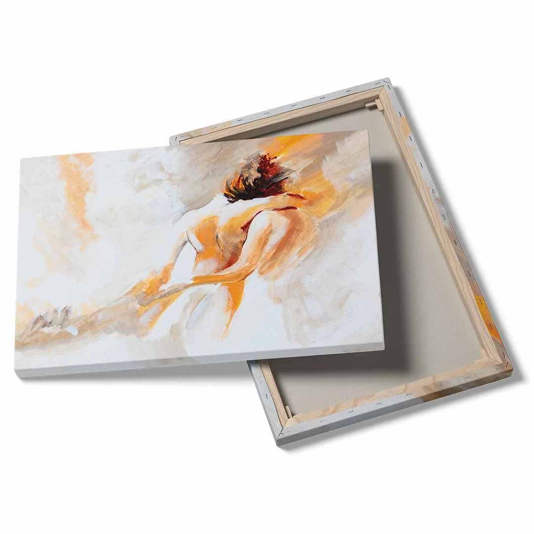 Obraz na płótnie - W objęciach bliskości - Kochankowie to doskonała propozycja dla osób ceniących piękne i zmysłowe wzory. Grafika utrzymana jest w delikatnych, jasnych barwach z odrobiną mocniejszych dodatków kolorystycznych. Możemy tutaj dostrzec kolor żółty, pomarańczowy, beżowy, brązowy, kremowy, a nawet odrobinę ognistego rudego koloru. Wzór nie jest zupełnie gładki, posiada delikatną "fakturę", bardziej widoczną przy znacznym powiększeniu wzoru, przypominającą płótno malarskie, dlatego doskonale prezentuje się na obrazie drukowanym właśnie na materiale canvas o strukturze płótna. Obraz na płótnie - W objęciach bliskości - Kochankowie będzie pasować do wielu stylów wykończenia wnętrz od skandynawskiego po nowoczesny. Jeśli marzy Ci się drobny lifting nudnej ściany, to nasz obraz z pewnością w tym pomoże. Obraz polecamy szczególnie do dekoracji sypialni.