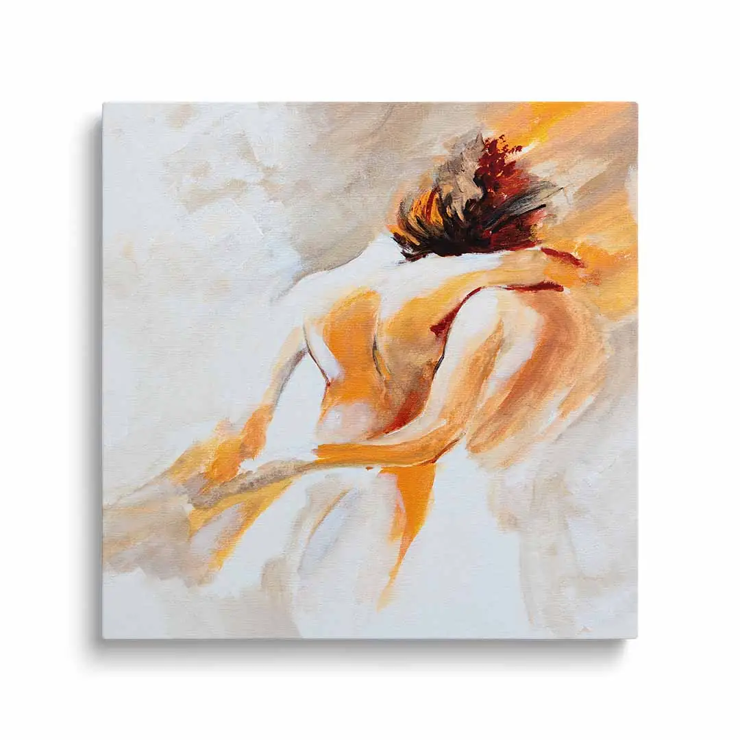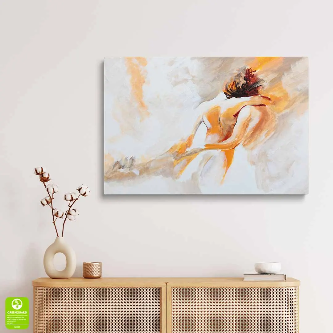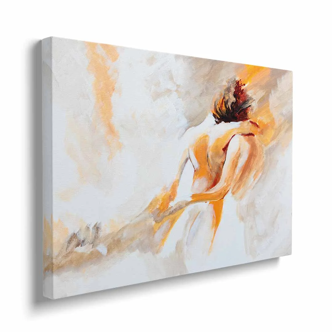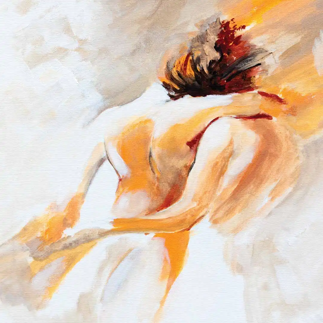 Obraz na płótnie - W objęciach bliskości - Kochankowie to doskonała propozycja dla osób ceniących piękne i zmysłowe wzory. Grafika utrzymana jest w delikatnych, jasnych barwach z odrobiną mocniejszych dodatków kolorystycznych. Możemy tutaj dostrzec kolor żółty, pomarańczowy, beżowy, brązowy, kremowy, a nawet odrobinę ognistego rudego koloru. Wzór nie jest zupełnie gładki, posiada delikatną "fakturę", bardziej widoczną przy znacznym powiększeniu wzoru, przypominającą płótno malarskie, dlatego doskonale prezentuje się na obrazie drukowanym właśnie na materiale canvas o strukturze płótna. Obraz na płótnie - W objęciach bliskości - Kochankowie będzie pasować do wielu stylów wykończenia wnętrz od skandynawskiego po nowoczesny. Jeśli marzy Ci się drobny lifting nudnej ściany, to nasz obraz z pewnością w tym pomoże. Obraz polecamy szczególnie do dekoracji sypialni.