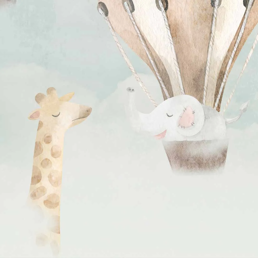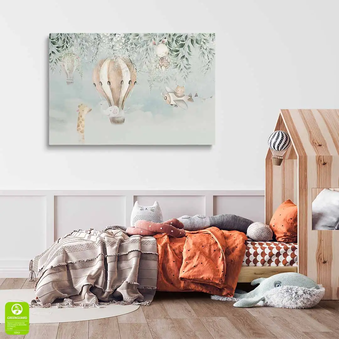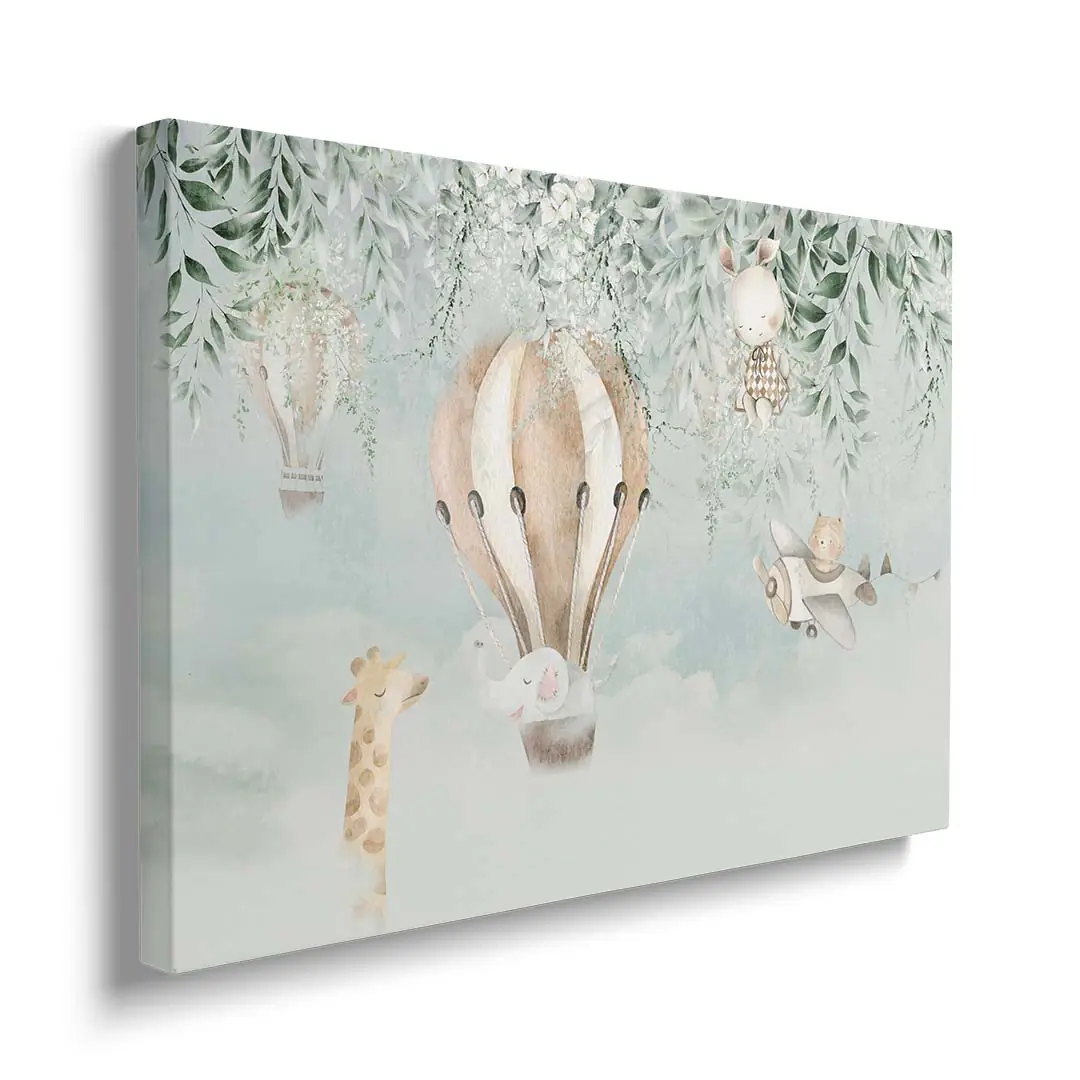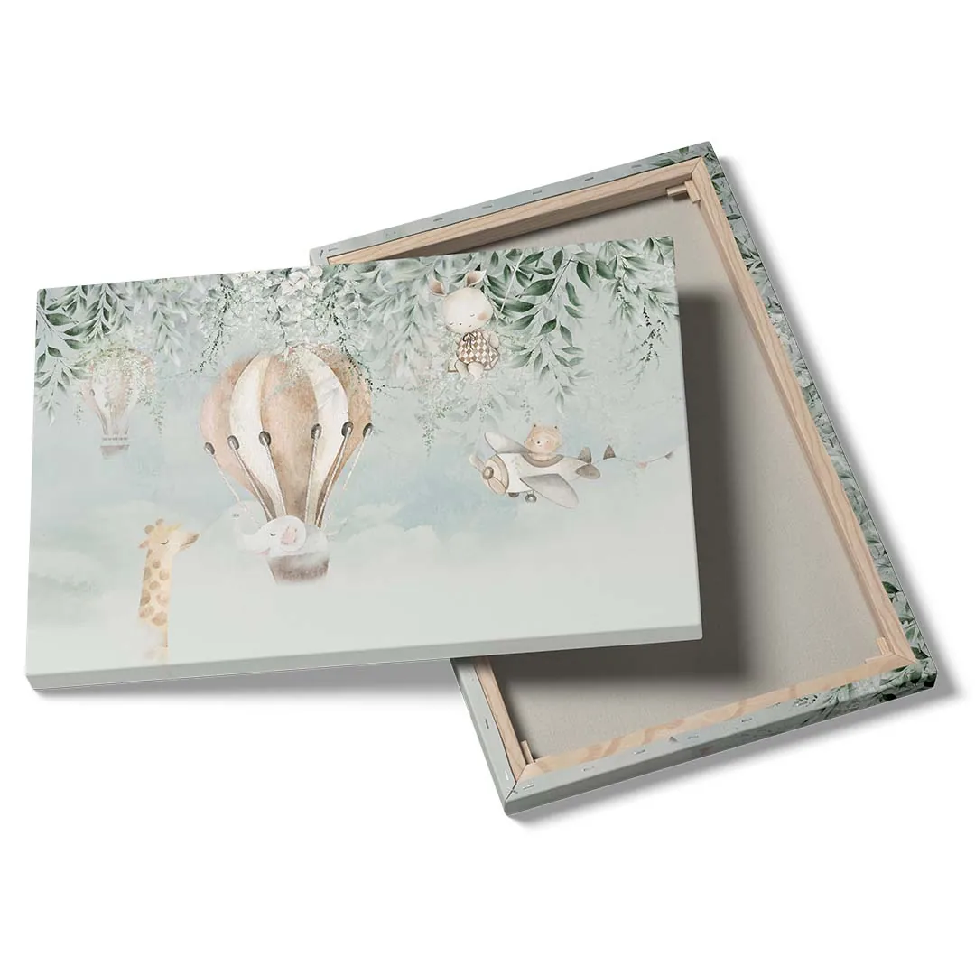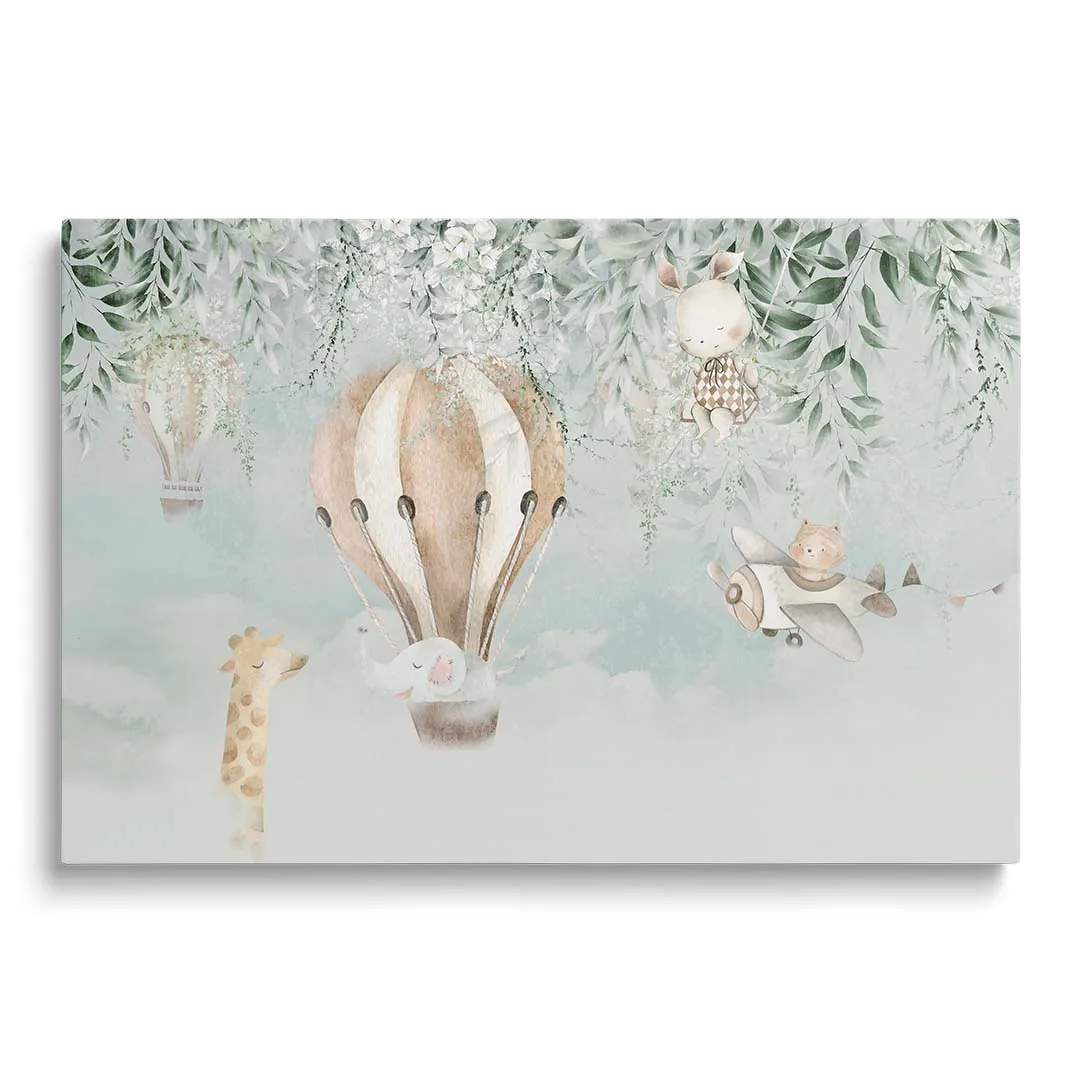 Obraz na płótnie - Zwierzęta w chmurach - to propozycja dekoracji ściennej dla naszych milusińskich. Uroczy obrazek pięknie wkomponuje się w wystój dziecięcego pokoju. Barwy są pastelowe, spokojne, a całość utrzymana jest w delikatnych odcieniach zieleni. Mamy tutaj kilka zwierząt: słonia w brązowym pasiastym balonie, stanowiącym pierwszy plan tego obrazu. Po prawej stronie mały zwierzak w samolocie, a nad nimi kolejny bujający się na huśtawce. W lewym dolnym rogu widoczna jest również urocza żyrafa wystawiająca swoją długą szyję zza chmur. Dzięki pastelowym neutralnym barwom obraz będzie dobrze komponował się w różnej kolorystyce i stylu wykończenia pokoju.