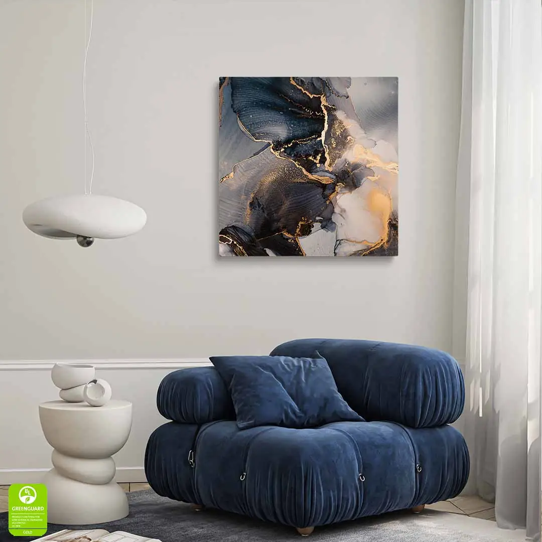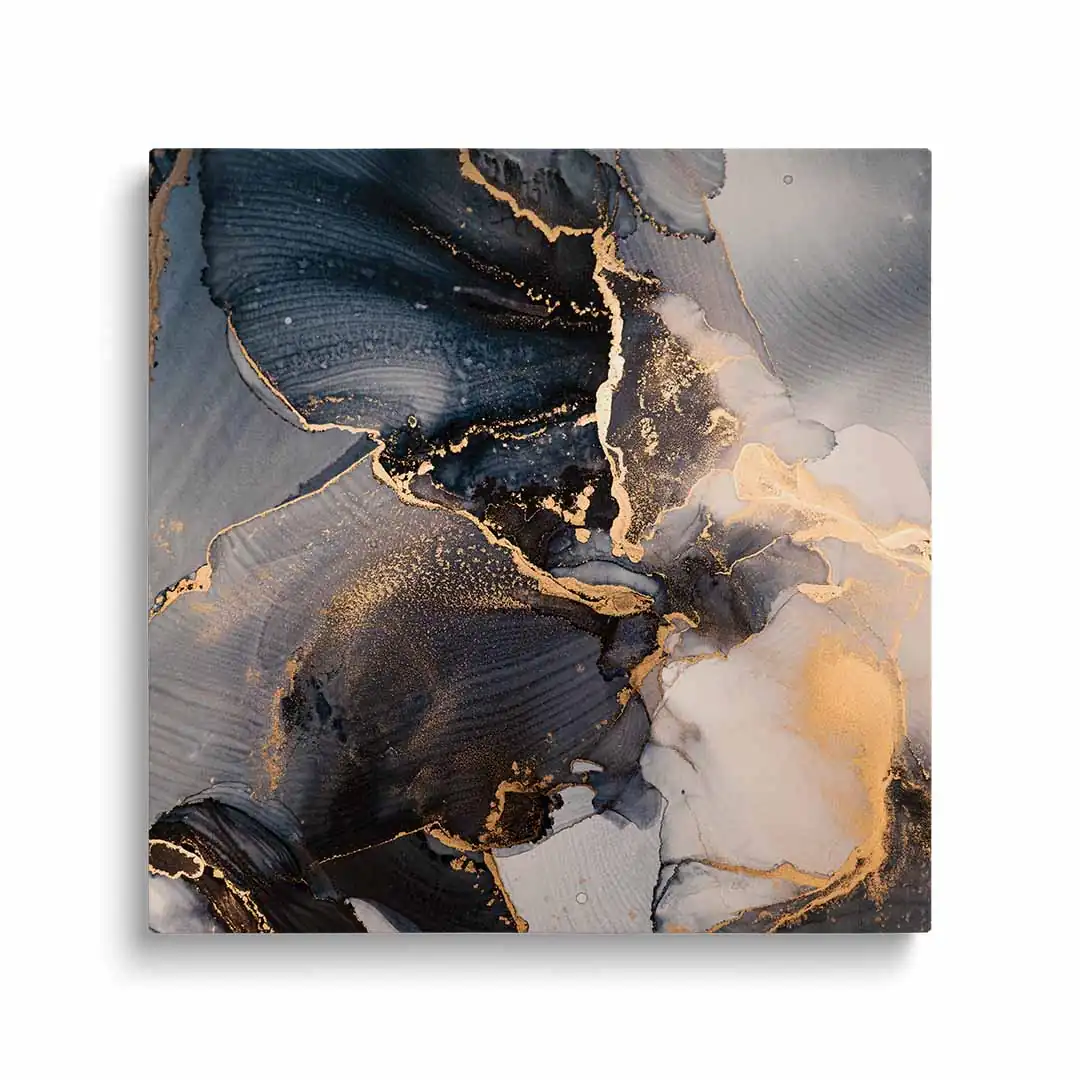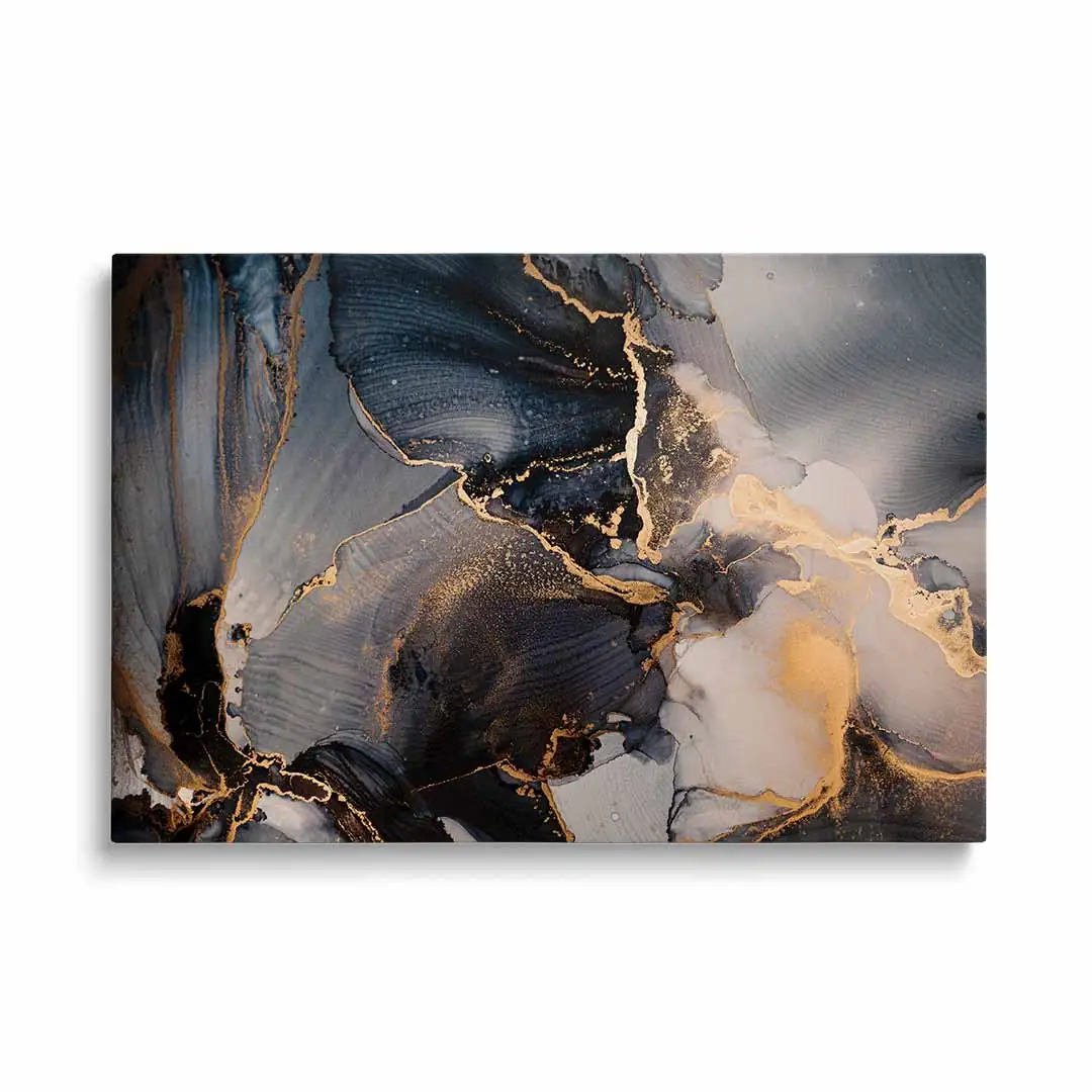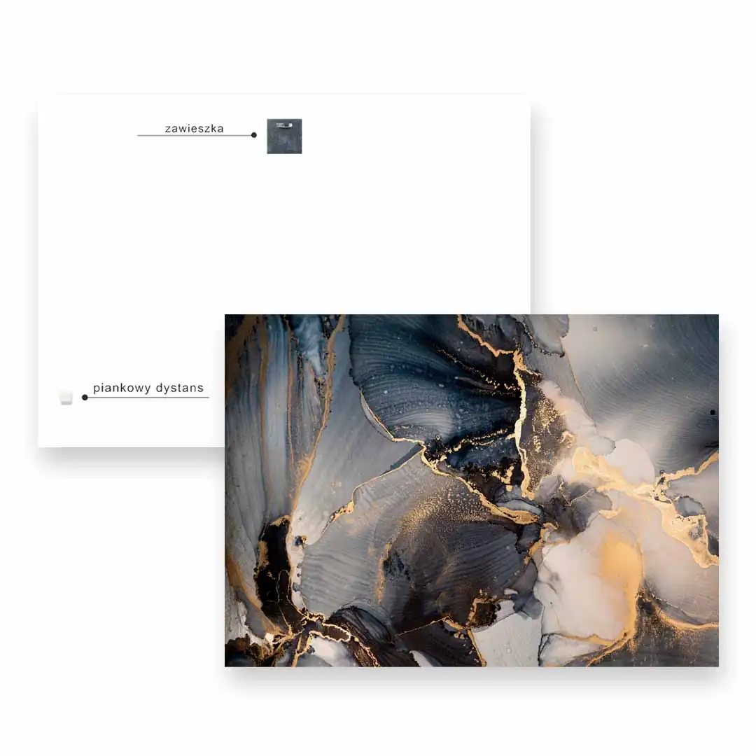 - techniką druku - proces drukowania wykorzystuje inne metody tworzenia kolorów (tzw. "przestrzeń barw") niż te, które stosowane są na ekranach komputera; kolory drukowane mogą wyglądać również nieco inaczej na różnych materiałach (np. canvasie, flizelinie, papierze czy szkle itp.) i przy użyciu różnych tuszy, w naszym przypadku tuszy do druku UV; złote elementy nie są wybiórczo metalizowane - efekt uzyskany jest poprzez wydruk tekstury w kolorze złota;