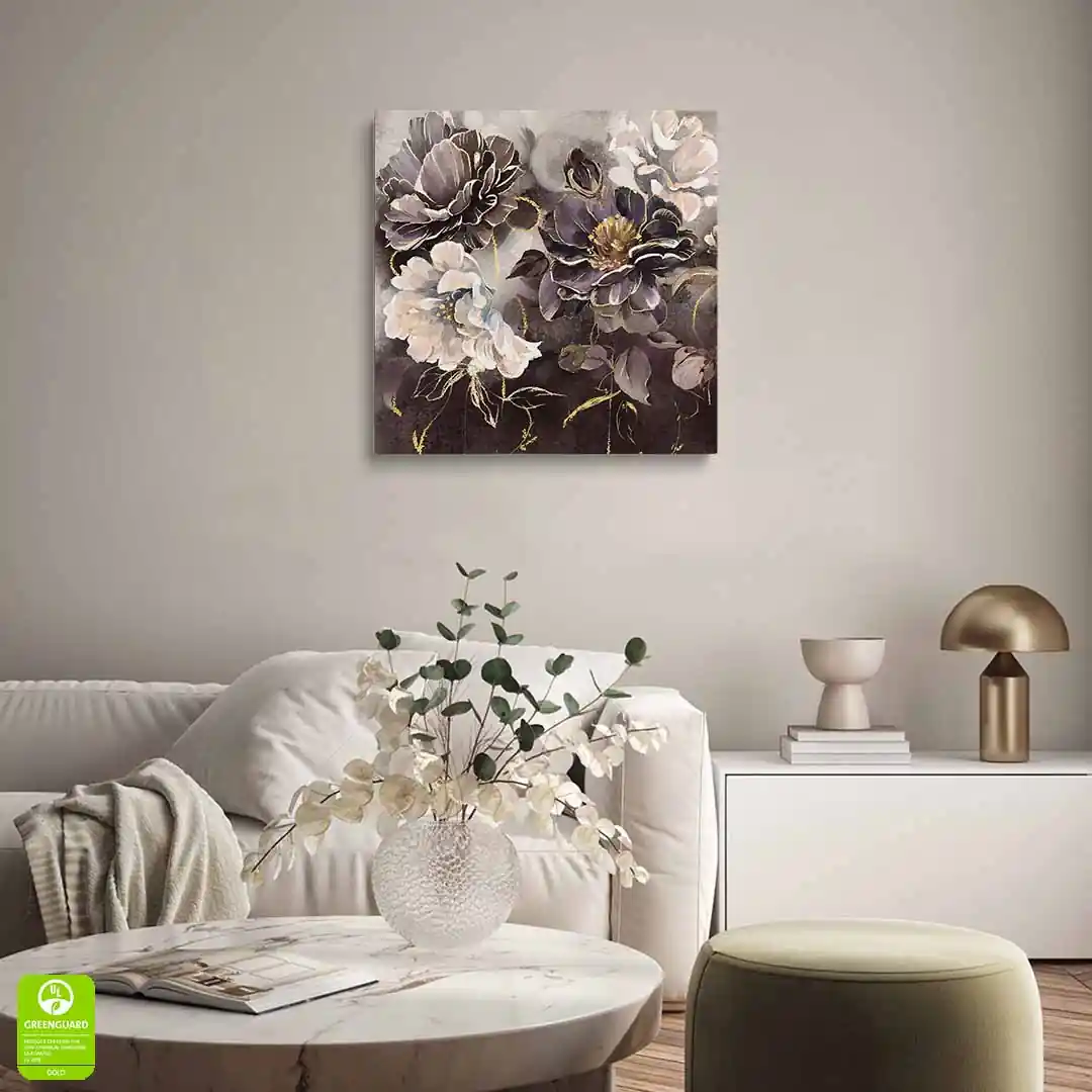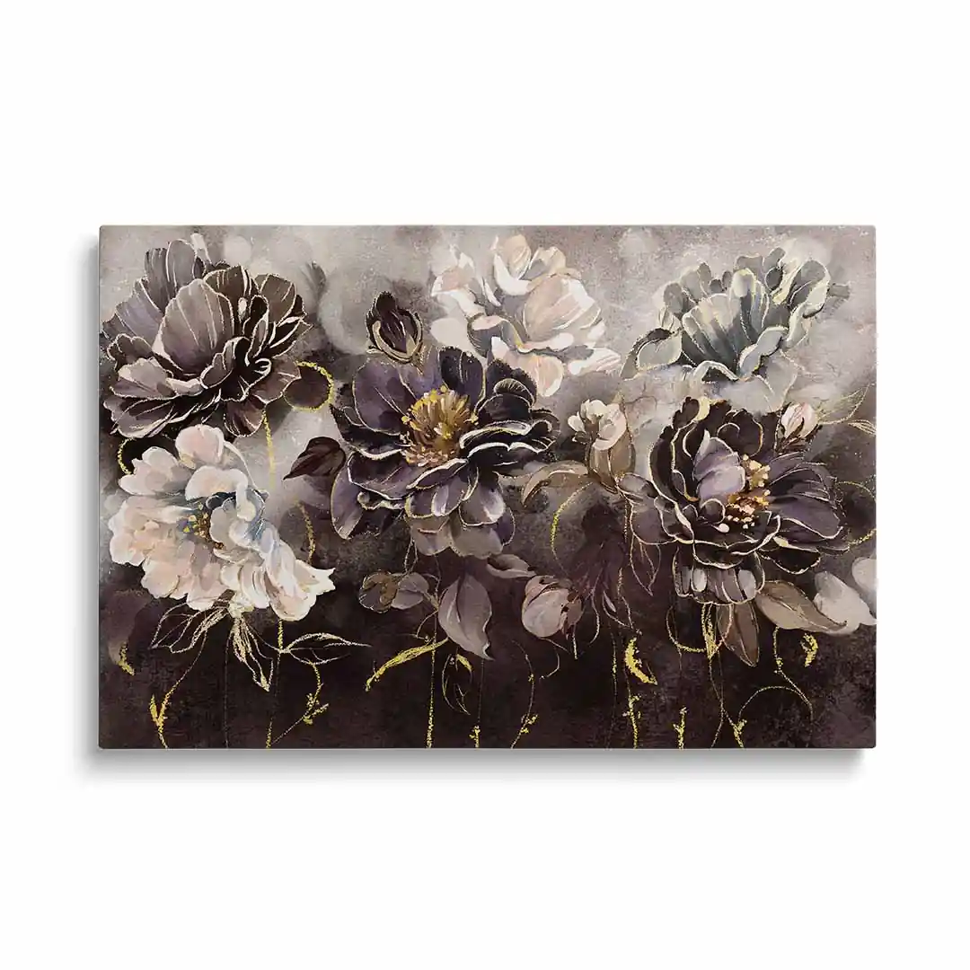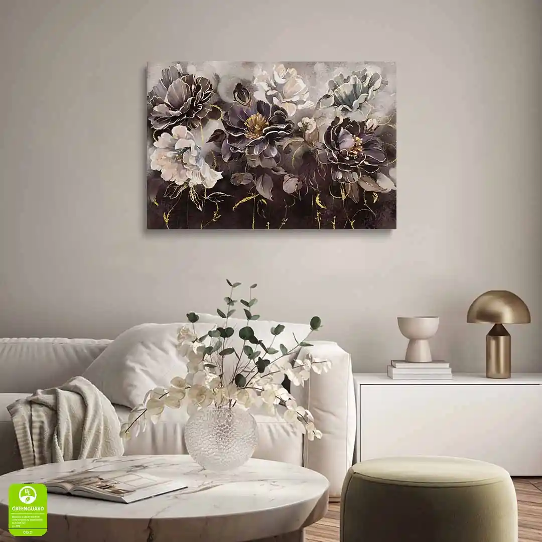 - techniką druku - proces drukowania wykorzystuje inne metody tworzenia kolorów (tzw. "przestrzeń barw") niż te, które stosowane są na ekranach komputera; kolory drukowane mogą wyglądać również nieco inaczej na różnych materiałach (np. canvasie, flizelinie, papierze czy szkle itp.) i przy użyciu różnych tuszy, w naszym przypadku tuszy do druku UV; złote elementy nie są wybiórczo metalizowane - efekt uzyskany jest poprzez wydruk tekstury w kolorze złota;