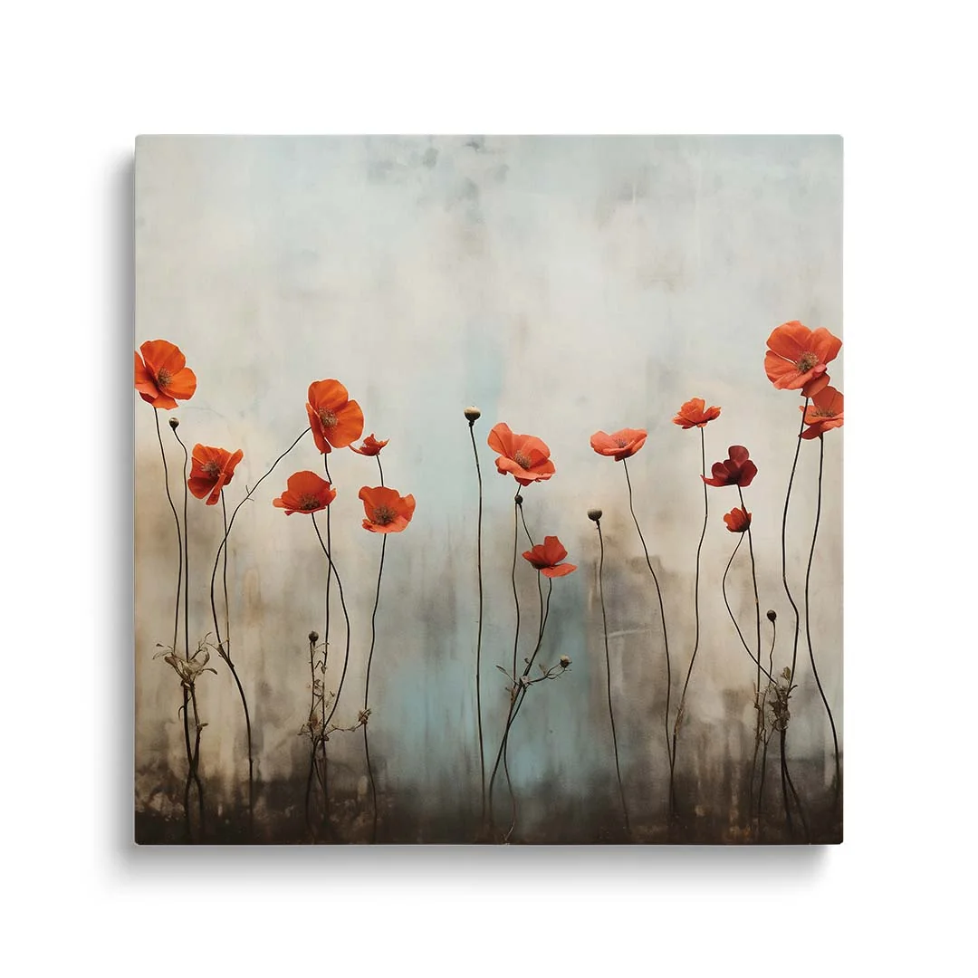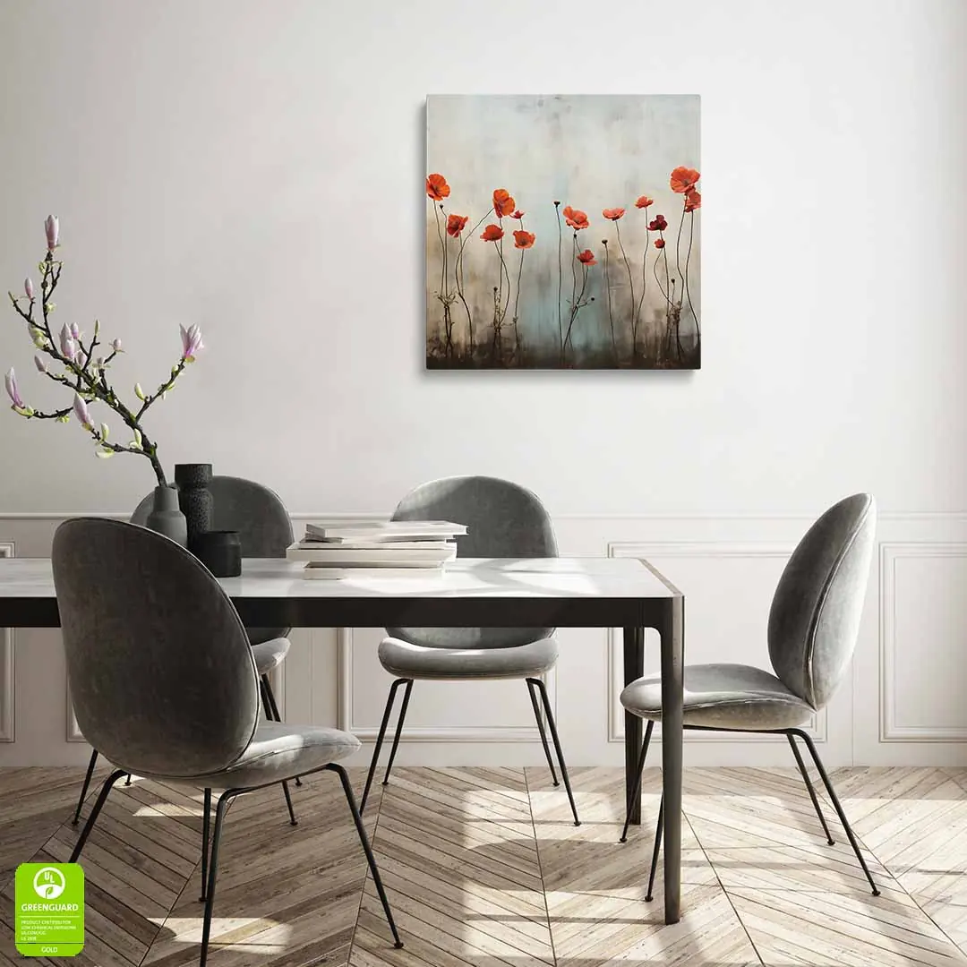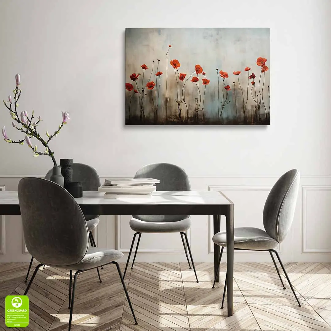Obraz na szkle - Czerwone maki - to nasza propozycja dla miłośników oryginalnych i kwiatowych motywów. Obraz prezentuje czerwone maki w nowoczesnej delikatnej, subtelnej formie. Pierwszy plan to pojedyncze maki zaprezentowane w pełnym rozkwicie. Maki sprawiają wrażenie przestrzennych, z efektem 3d, co podkreśla jeszcze lekko rozmyte, niejednorodne tło. Kolorystyka tego obrazu to przeróżne odcienie szarości, z mocniejszymi akcentami kolorystycznymi płatków kwiatowych, chociaż nie jest to również "ognista" czerwień. Całość obrazu, pomimo ciemniejszych odcieni, zwłaszcza w dolnej partii obrazu, stanowi bardzo pogodną grafikę, która będzie pasować do wielu pomieszczeń w naszym domu. Kompozycję można uzupełnić o jednolitą kolorystykę, nawiązującą do barw obrazu, wprowadzając szarości, biele i czerwone dodatki np. w formie poduszek. Szklana tafla szkła na tym obrazie pięknie podkreśla nowoczesny charakter tej dekoracji ściennej.