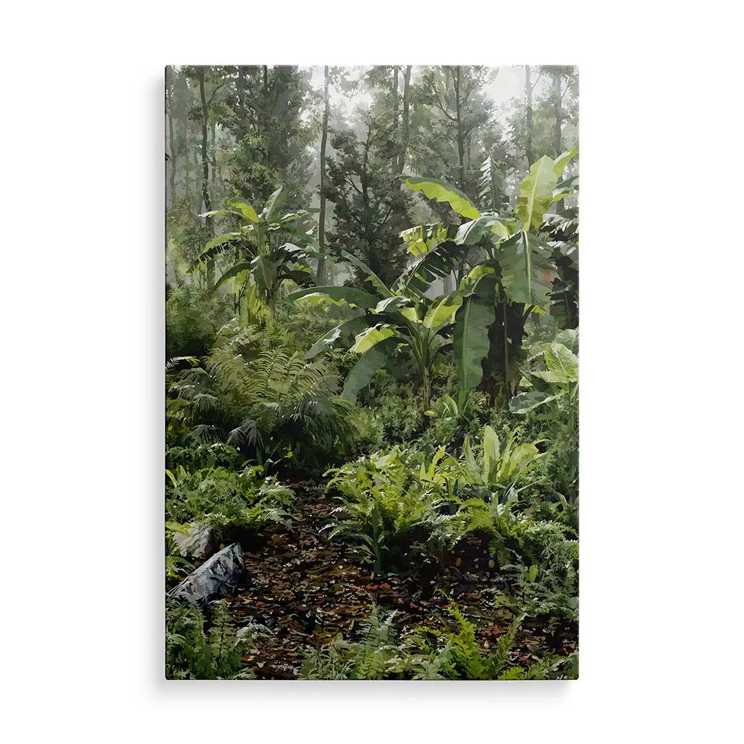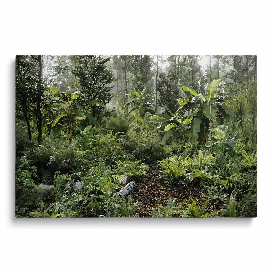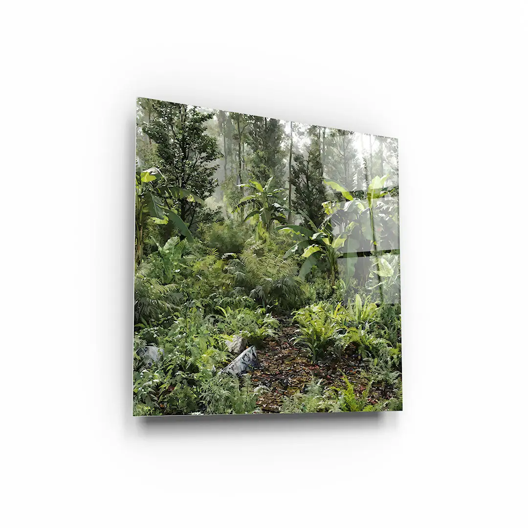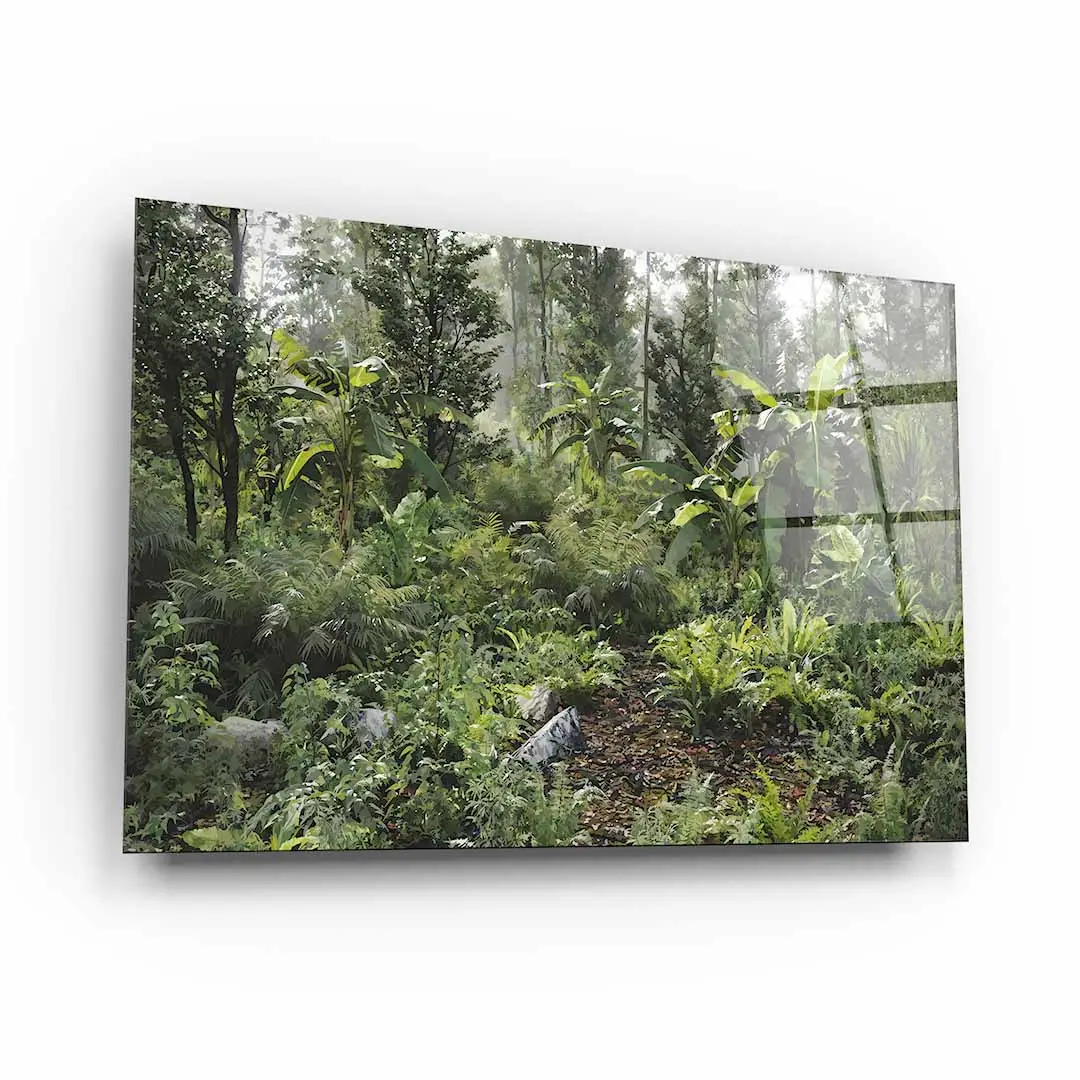 Obraz na szkle - Dzika Dżungla – Soczysta zielona dekoracja do salonu, styl tropikalny i nowoczesny, gęsty las deszczowy, egzotyczny ogród na ścianie