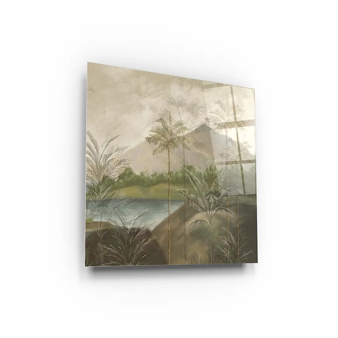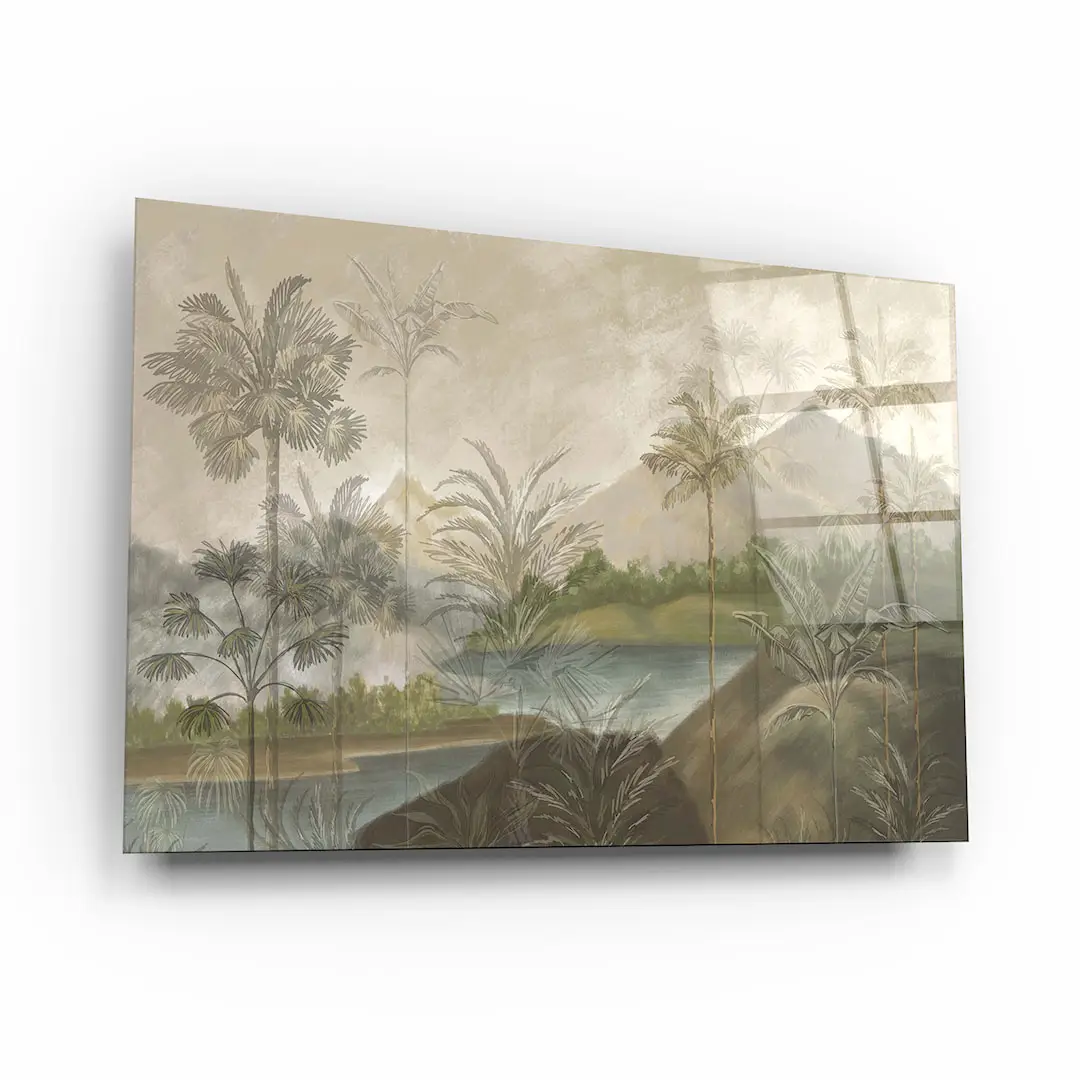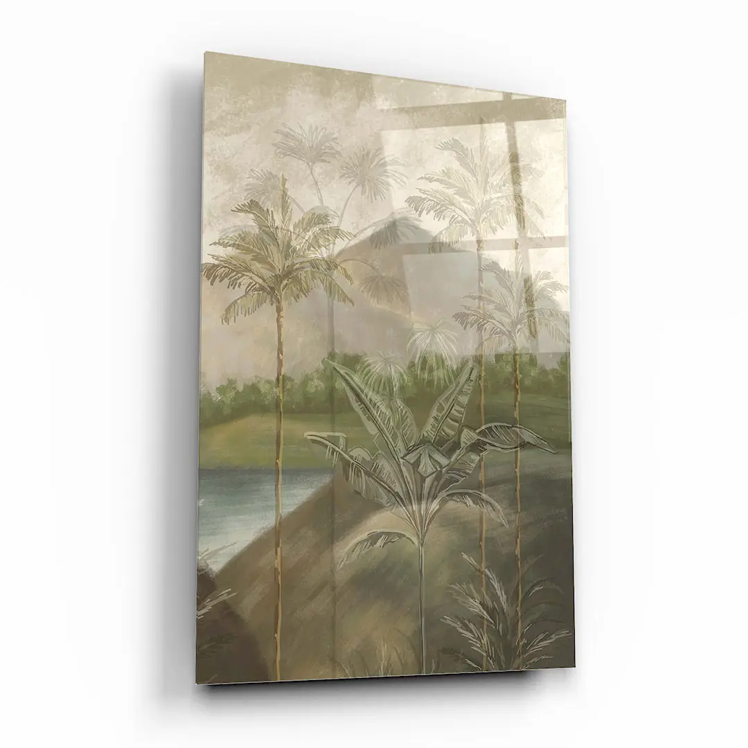 Obraz na szkle - Egzotyczna Dżungla Vintage – Naturalna dekoracja do salonu, styl tropikalny i boho, zielone palmy i góry, stonowany krajobraz
