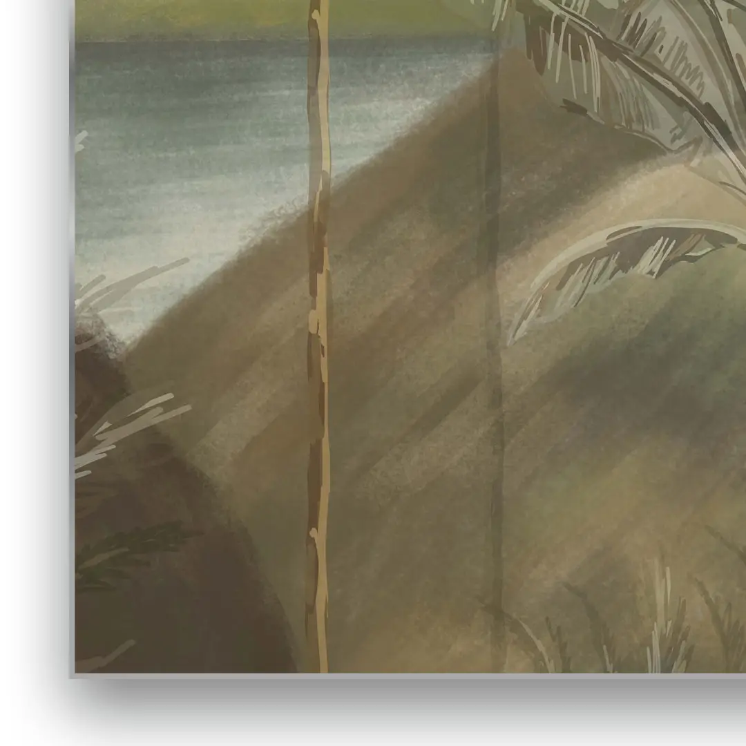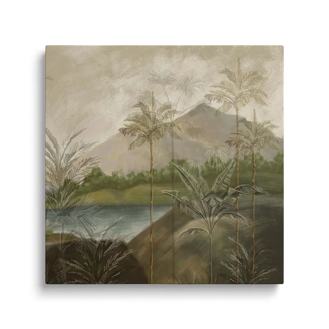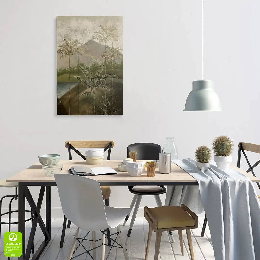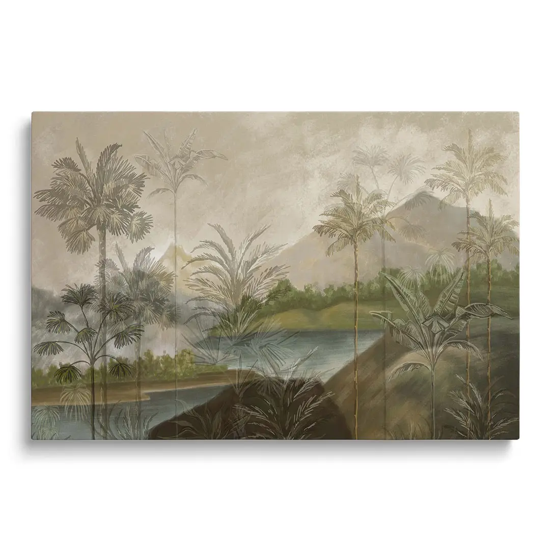 Obraz na szkle - Egzotyczna Dżungla Vintage – Naturalna dekoracja do salonu, styl tropikalny i boho, zielone palmy i góry, stonowany krajobraz