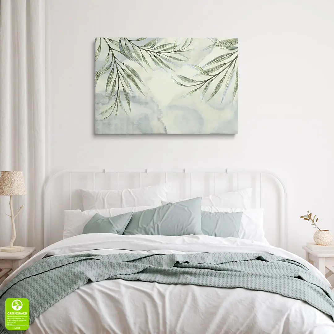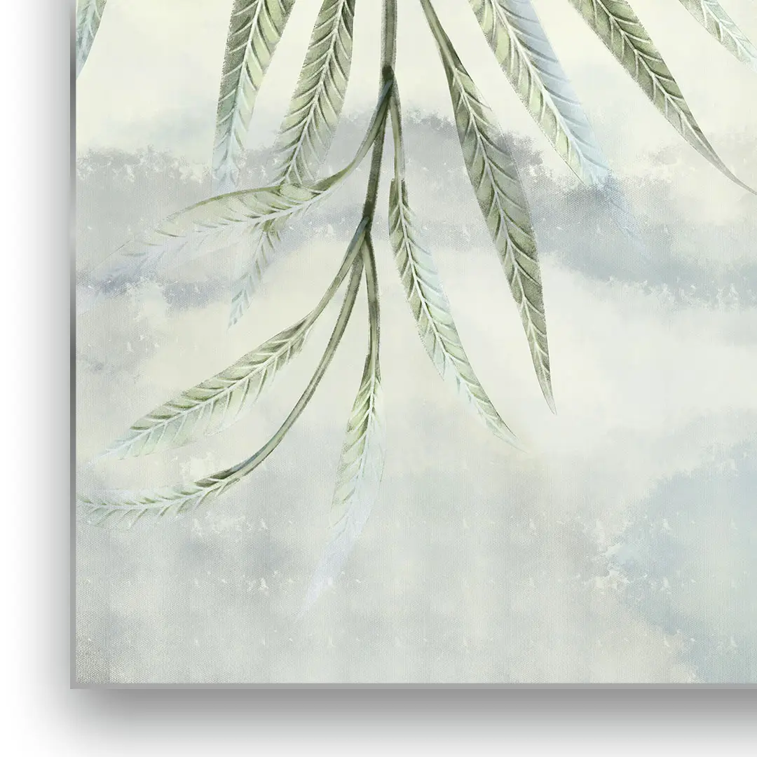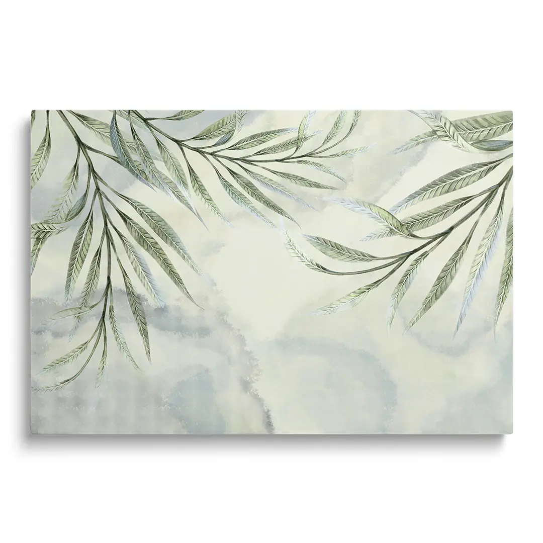 Obraz na szkle - Eteryczne Liście – Delikatna dekoracja do salonu, styl skandynawski i boho, akwarelowe chmury, pastelowa sypialnia w zieleni