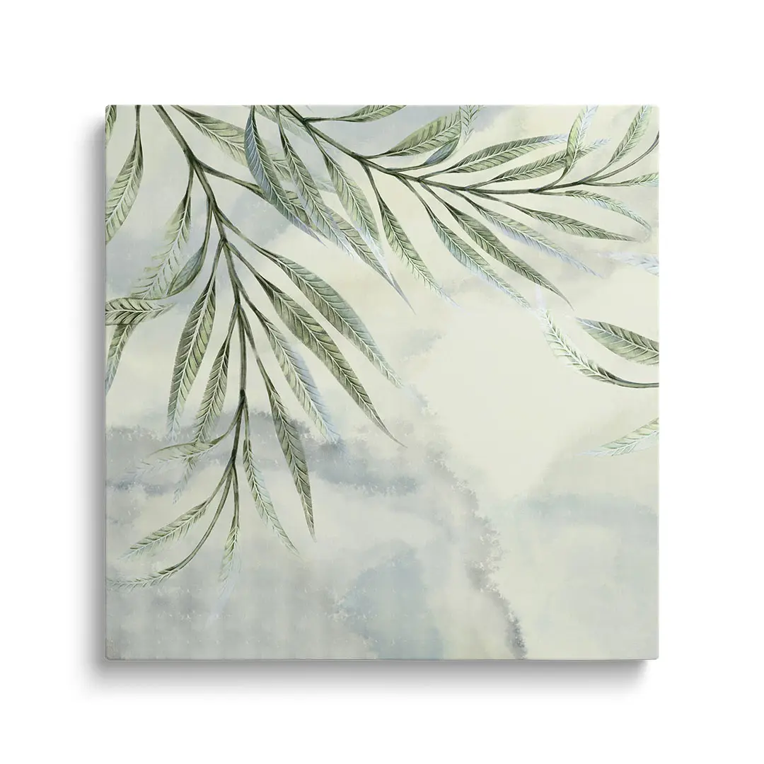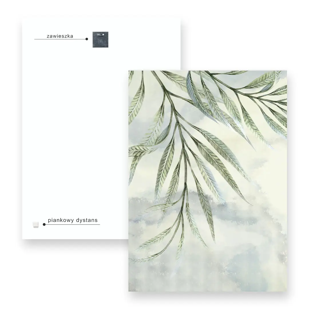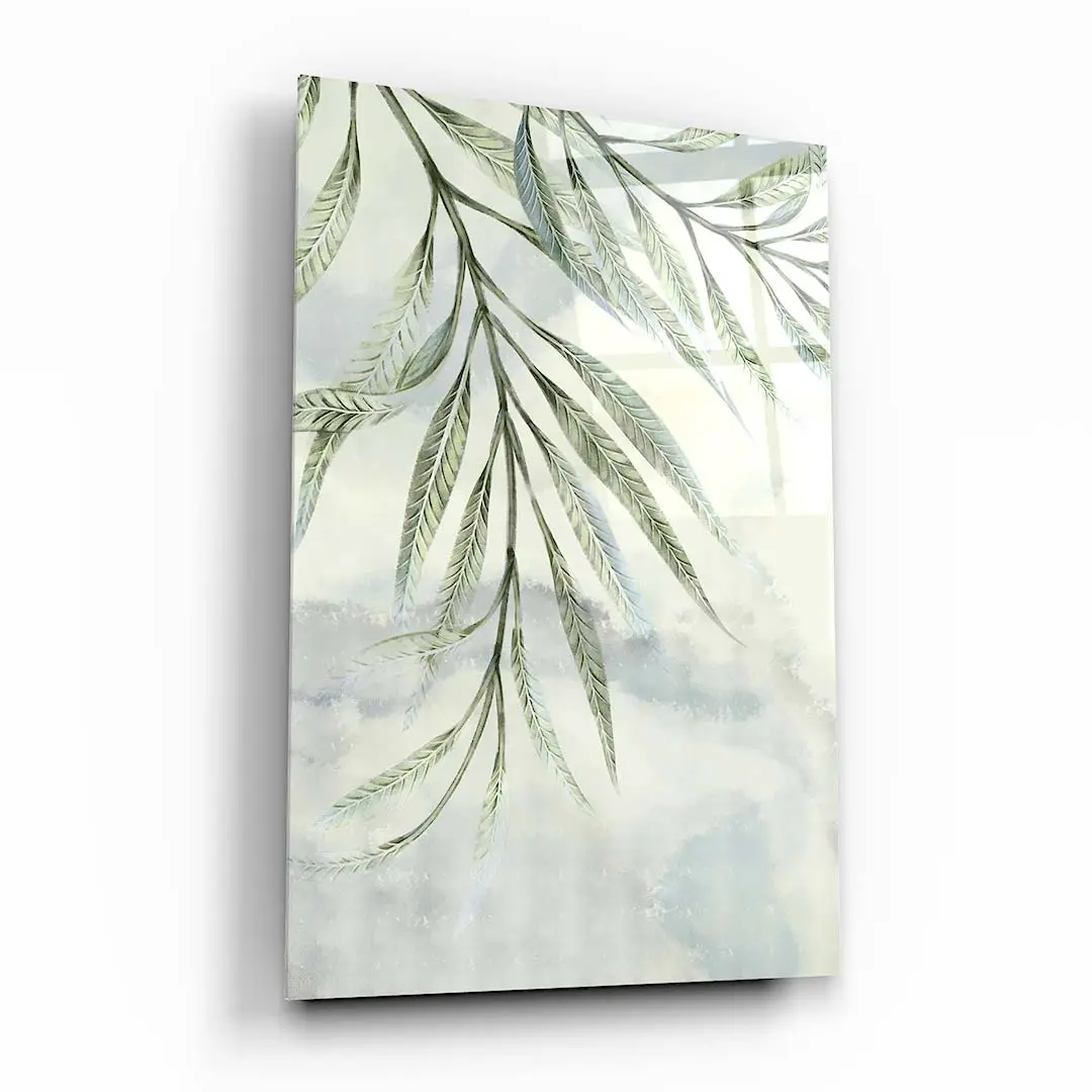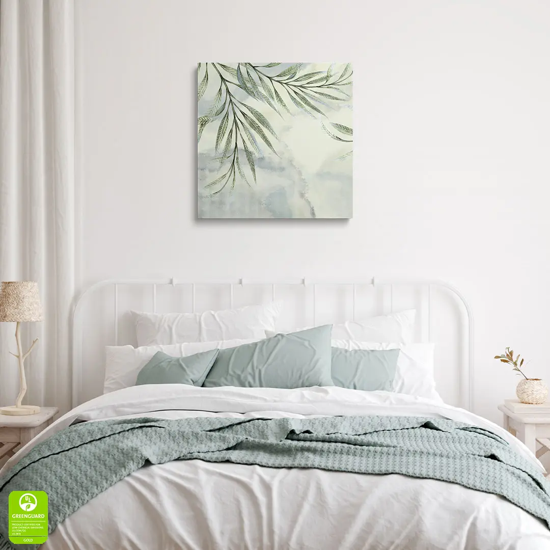 Obraz na szkle - Eteryczne Liście – Delikatna dekoracja do salonu, styl skandynawski i boho, akwarelowe chmury, pastelowa sypialnia w zieleni