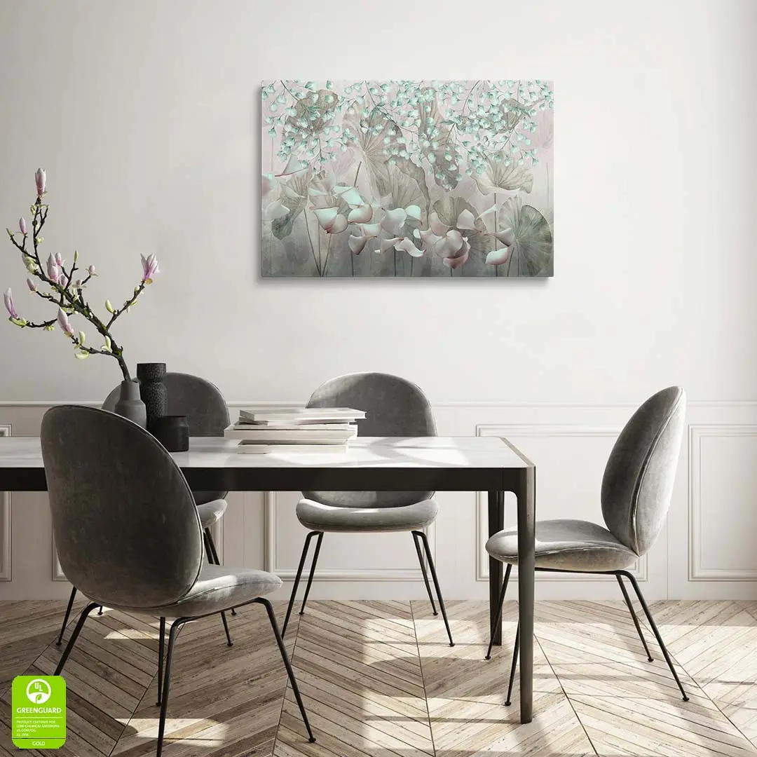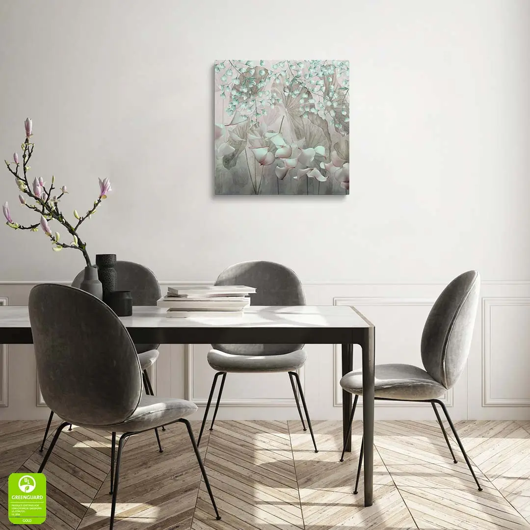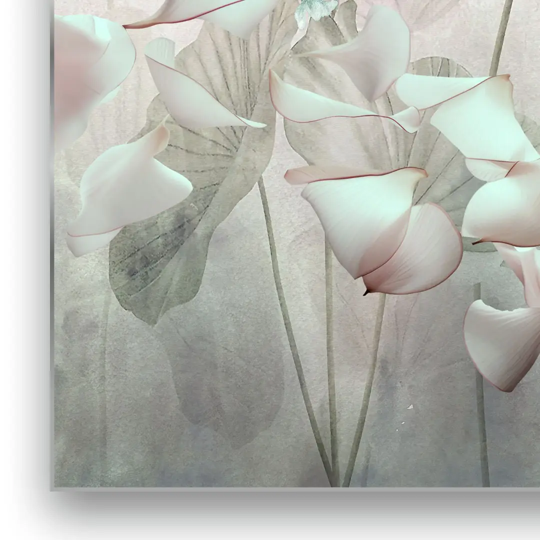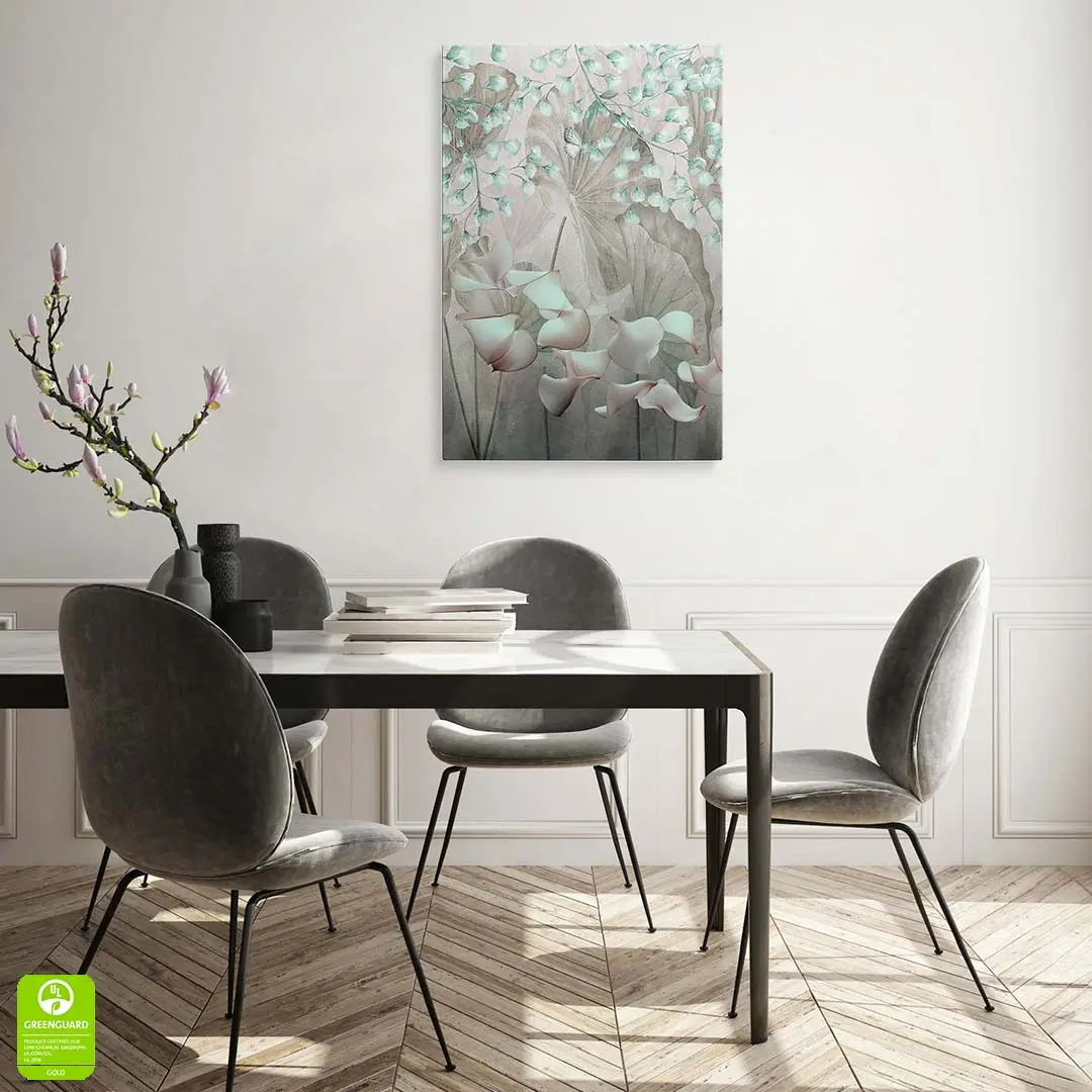 Obraz na szkle - Eteryczne Liście Lotosu – Delikatna dekoracja do sypialni, styl nowoczesny, pastelowa miętowa zieleń i szary, kojący motyw roślinny