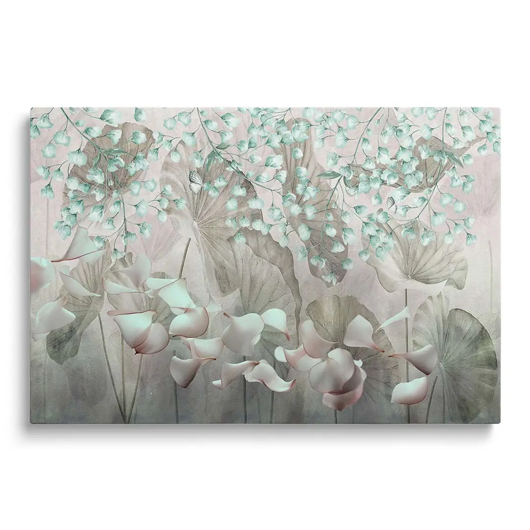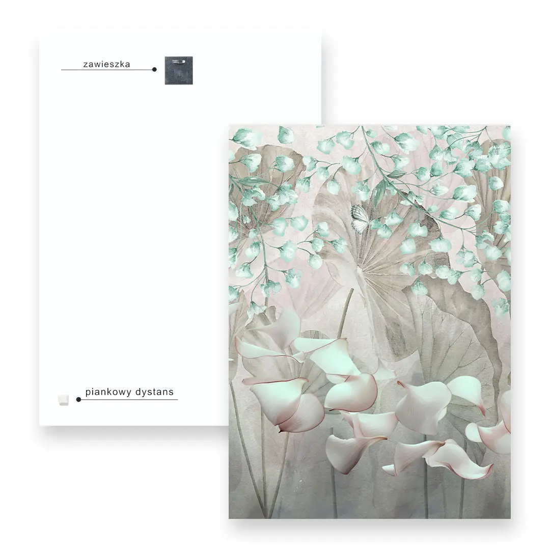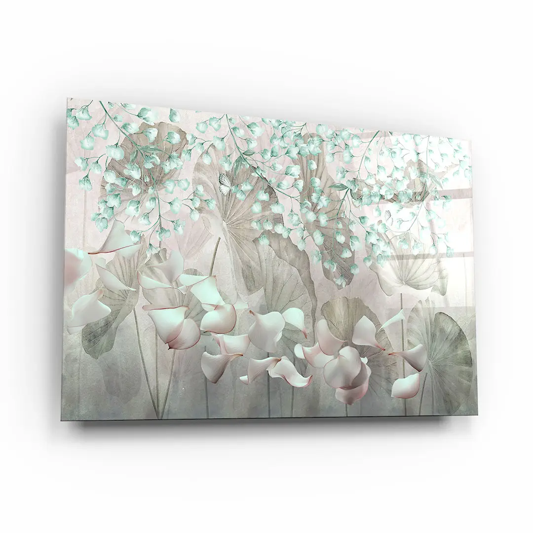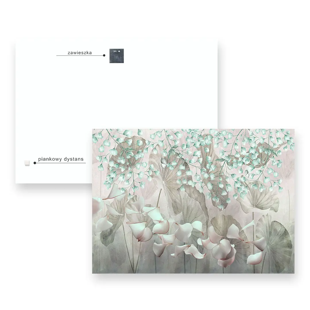 Obraz na szkle - Eteryczne Liście Lotosu – Delikatna dekoracja do sypialni, styl nowoczesny, pastelowa miętowa zieleń i szary, kojący motyw roślinny
