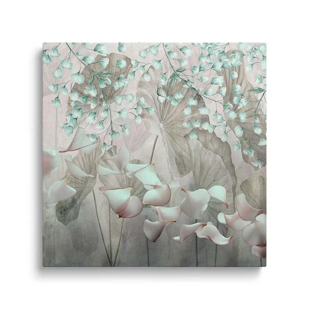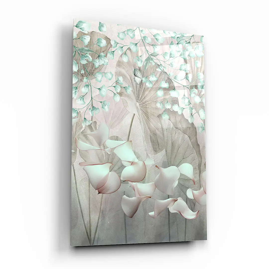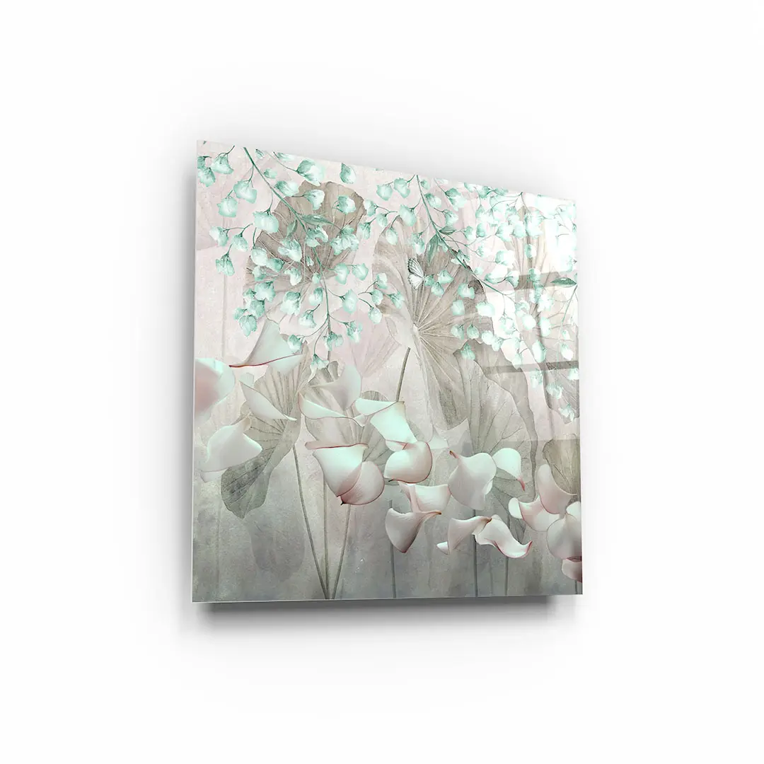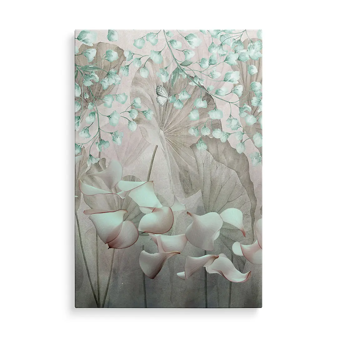 Obraz na szkle - Eteryczne Liście Lotosu – Delikatna dekoracja do sypialni, styl nowoczesny, pastelowa miętowa zieleń i szary, kojący motyw roślinny
