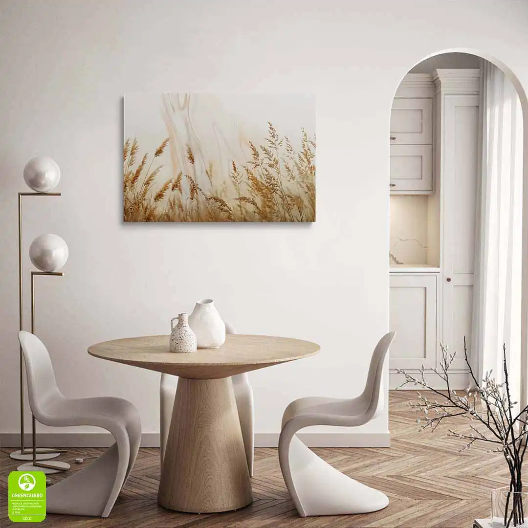 - techniką druku - proces drukowania wykorzystuje inne metody tworzenia kolorów (tzw. "przestrzeń barw") niż te, które stosowane są na ekranach komputera; kolory drukowane mogą wyglądać również nieco inaczej na różnych materiałach (np. canvasie, flizelinie, papierze czy szkle itp.) i przy użyciu różnych tuszy, w naszym przypadku tuszy do druku UV; złote elementy nie są wybiórczo metalizowane - efekt uzyskany jest poprzez wydruk tekstury w kolorze złota;