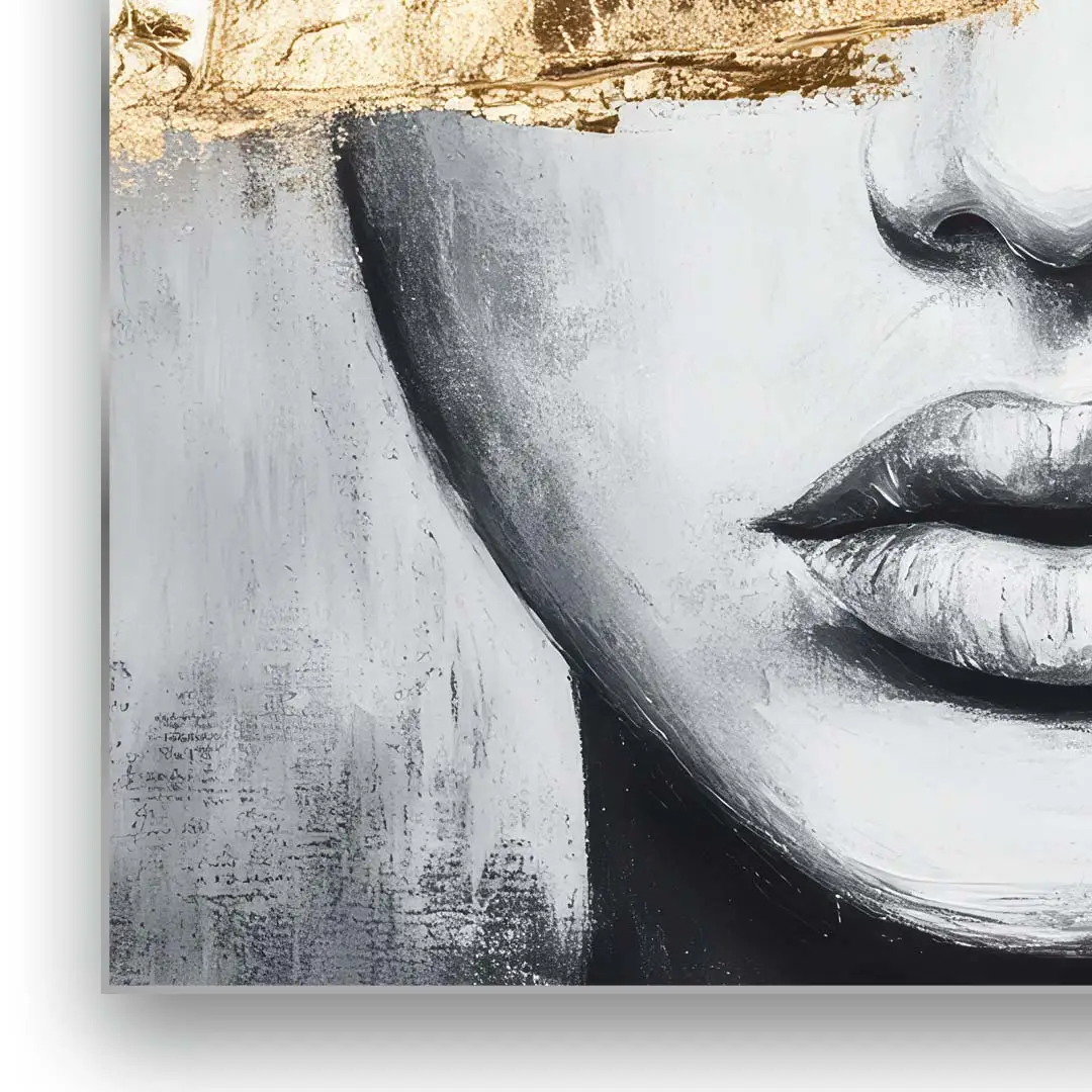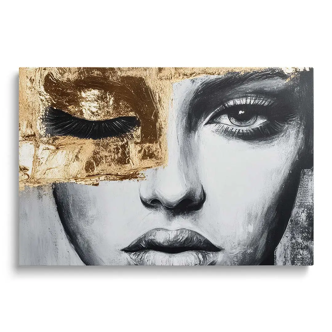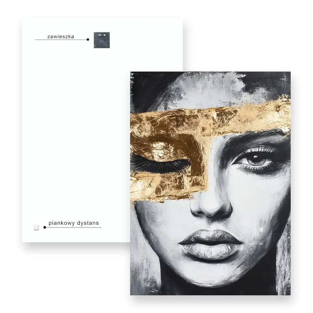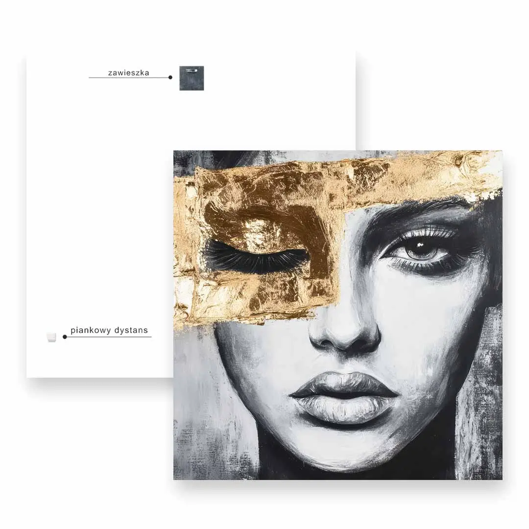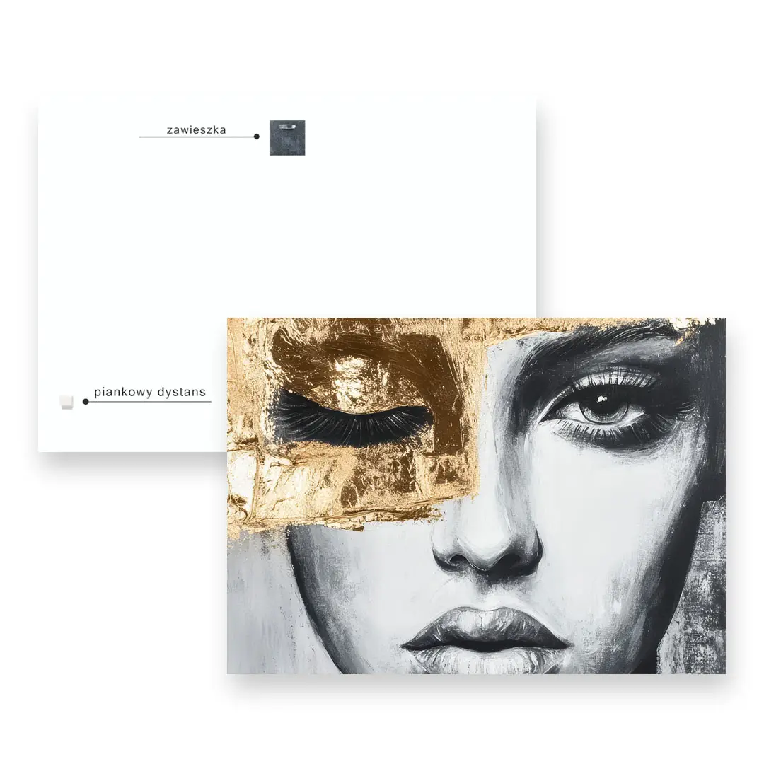 - techniką druku - proces drukowania wykorzystuje inne metody tworzenia kolorów (tzw. "przestrzeń barw") niż te, które stosowane są na ekranach komputera; kolory drukowane mogą wyglądać również nieco inaczej na różnych materiałach (np. canvasie, flizelinie, papierze czy szkle itp.) i przy użyciu różnych tuszy, w naszym przypadku tuszy do druku UV; złote elementy nie są wybiórczo metalizowane - efekt uzyskany jest poprzez wydruk tekstury w kolorze złota;