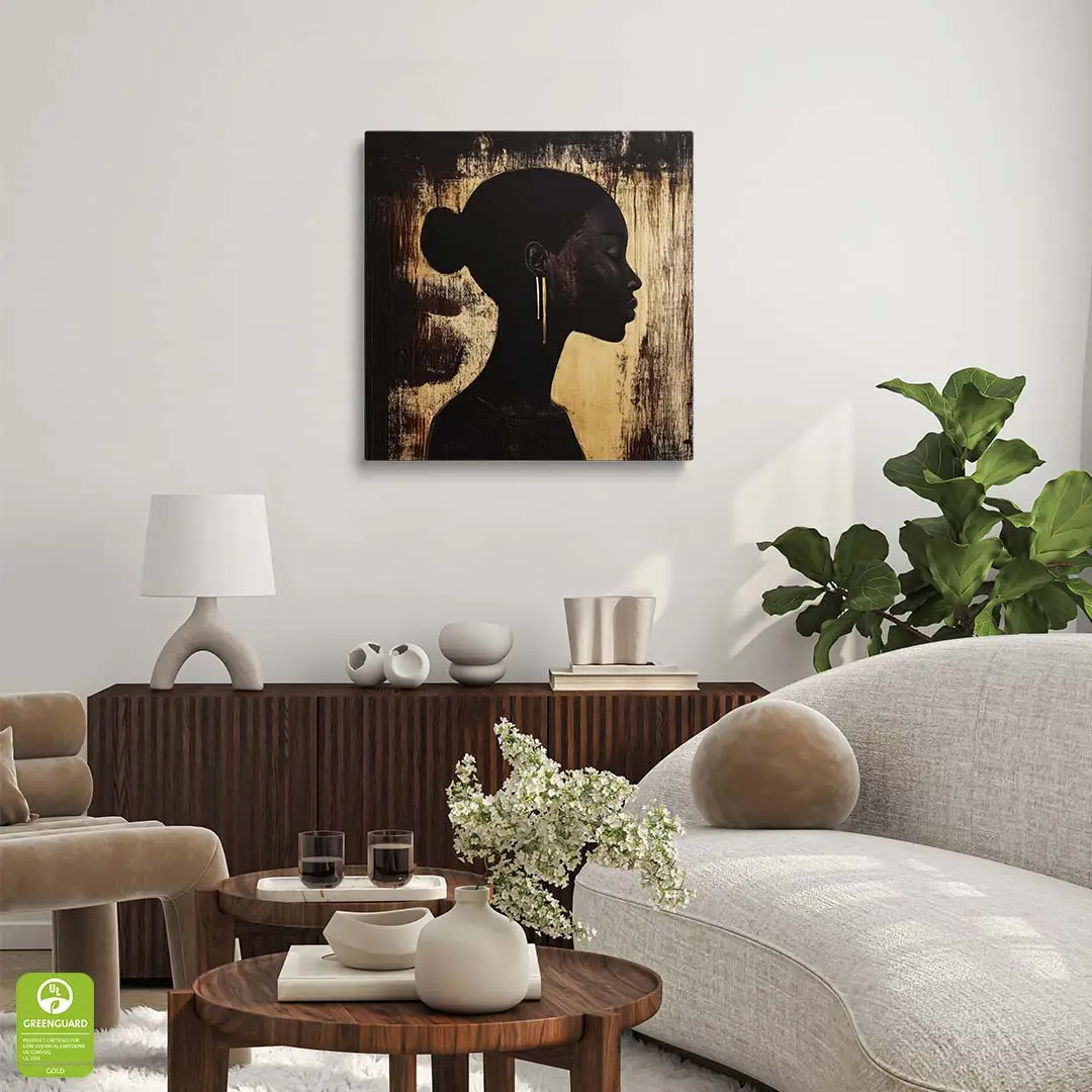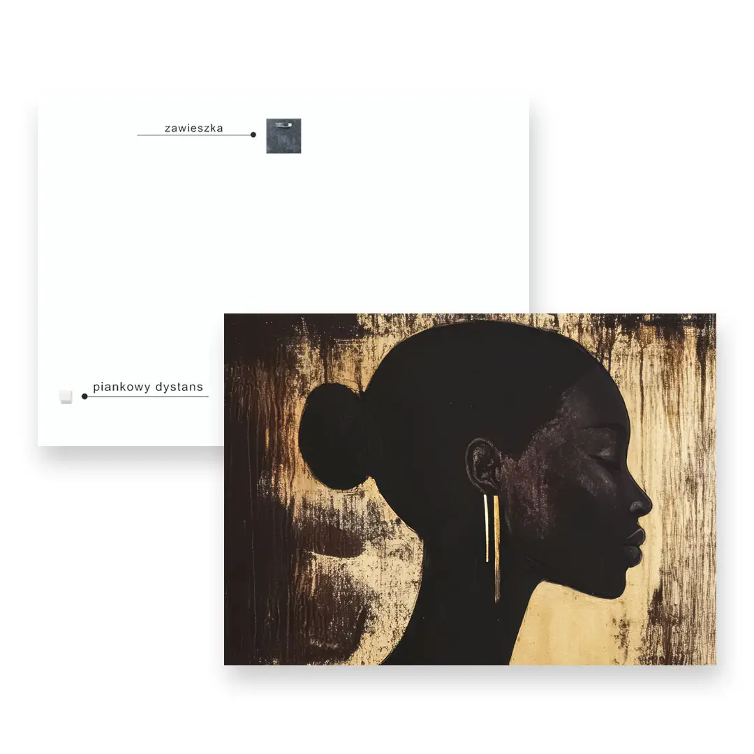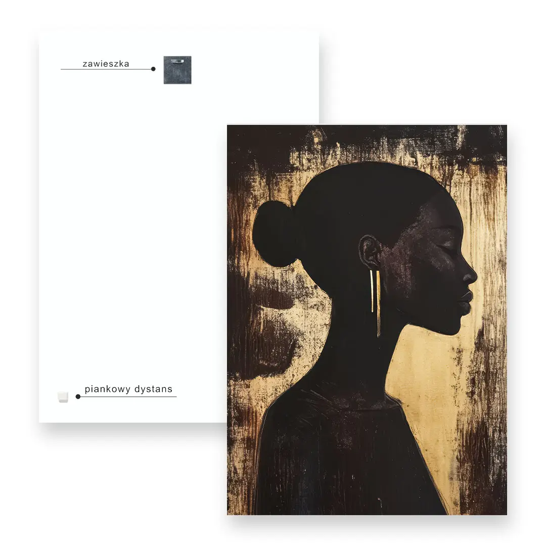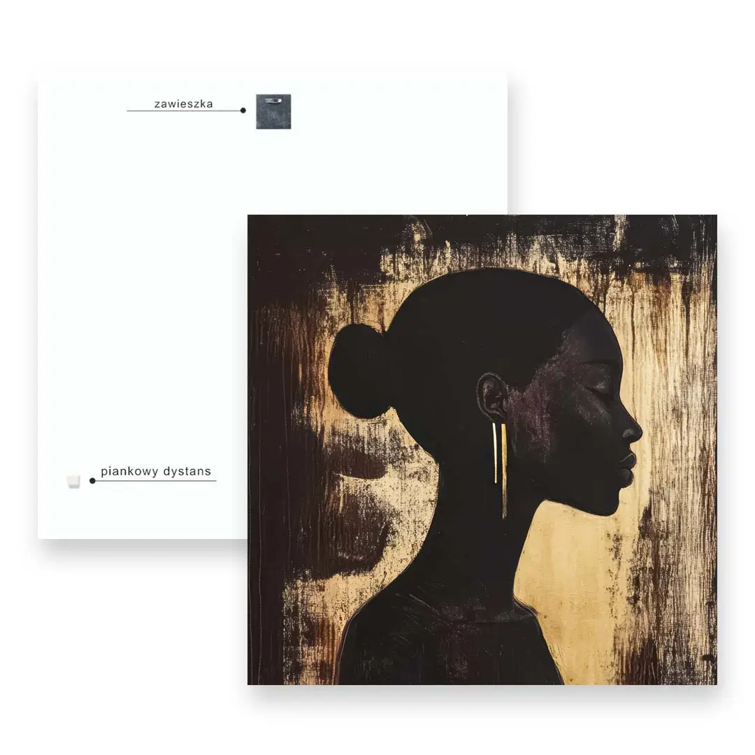 - techniką druku - proces drukowania wykorzystuje inne metody tworzenia kolorów (tzw. "przestrzeń barw") niż te, które stosowane są na ekranach komputera; kolory drukowane mogą wyglądać również nieco inaczej na różnych materiałach (np. canvasie, flizelinie, papierze czy szkle itp.) i przy użyciu różnych tuszy, w naszym przypadku tuszy do druku UV; złote elementy nie są wybiórczo metalizowane - efekt uzyskany jest poprzez wydruk tekstury w kolorze złota;