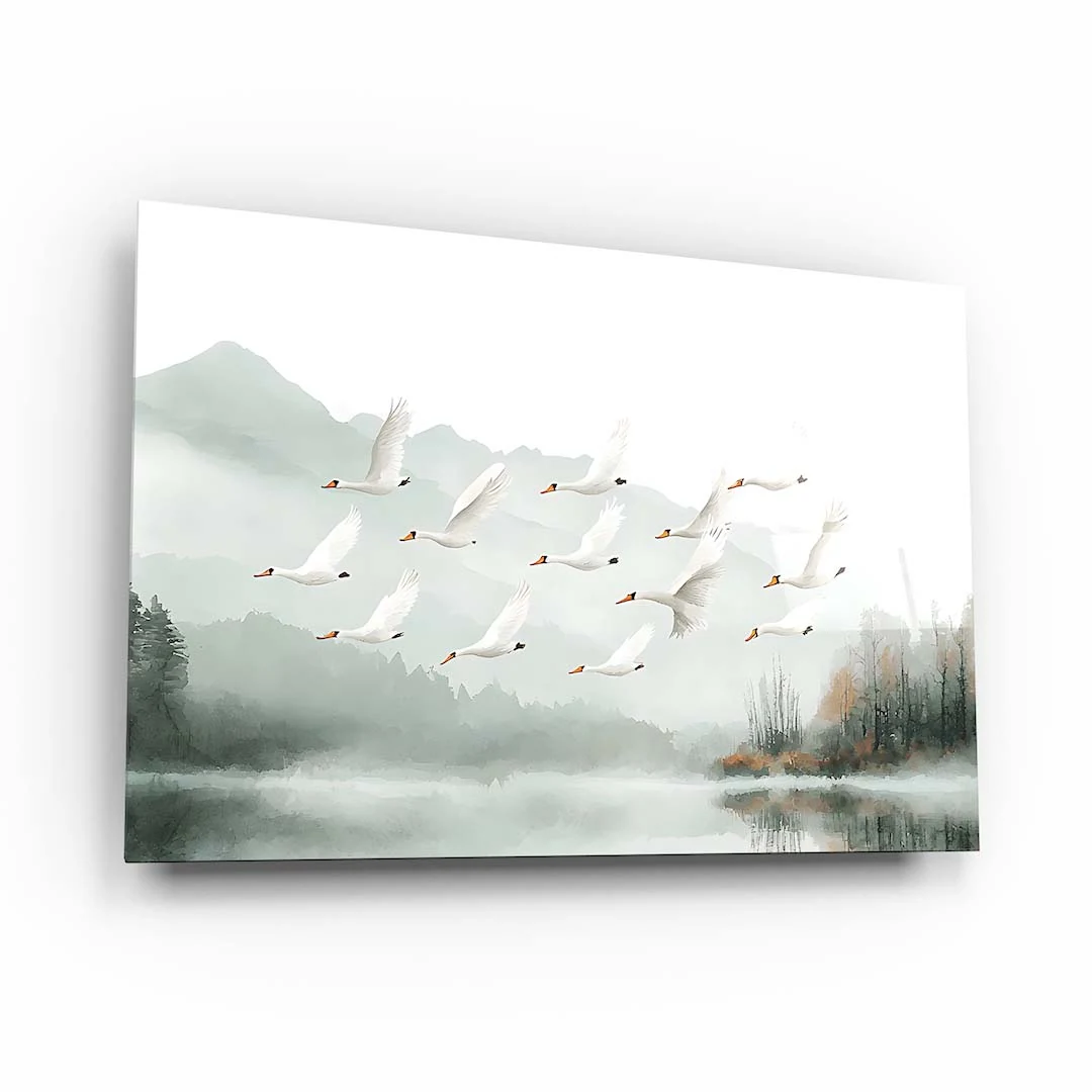Obraz na szkle - Łabędzie nad jeziorem - malowniczy krajobraz z ptakami do salonu, sypialni lub łazienki