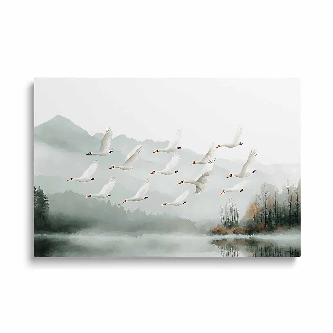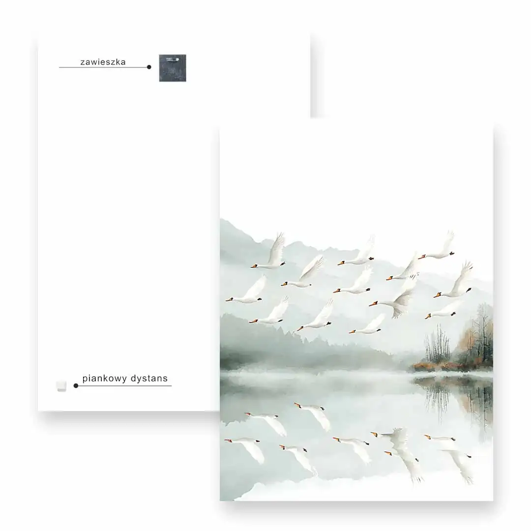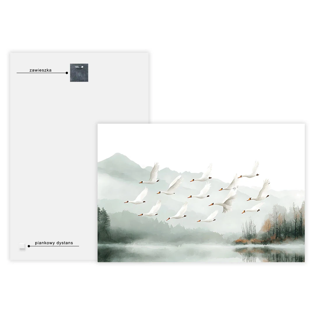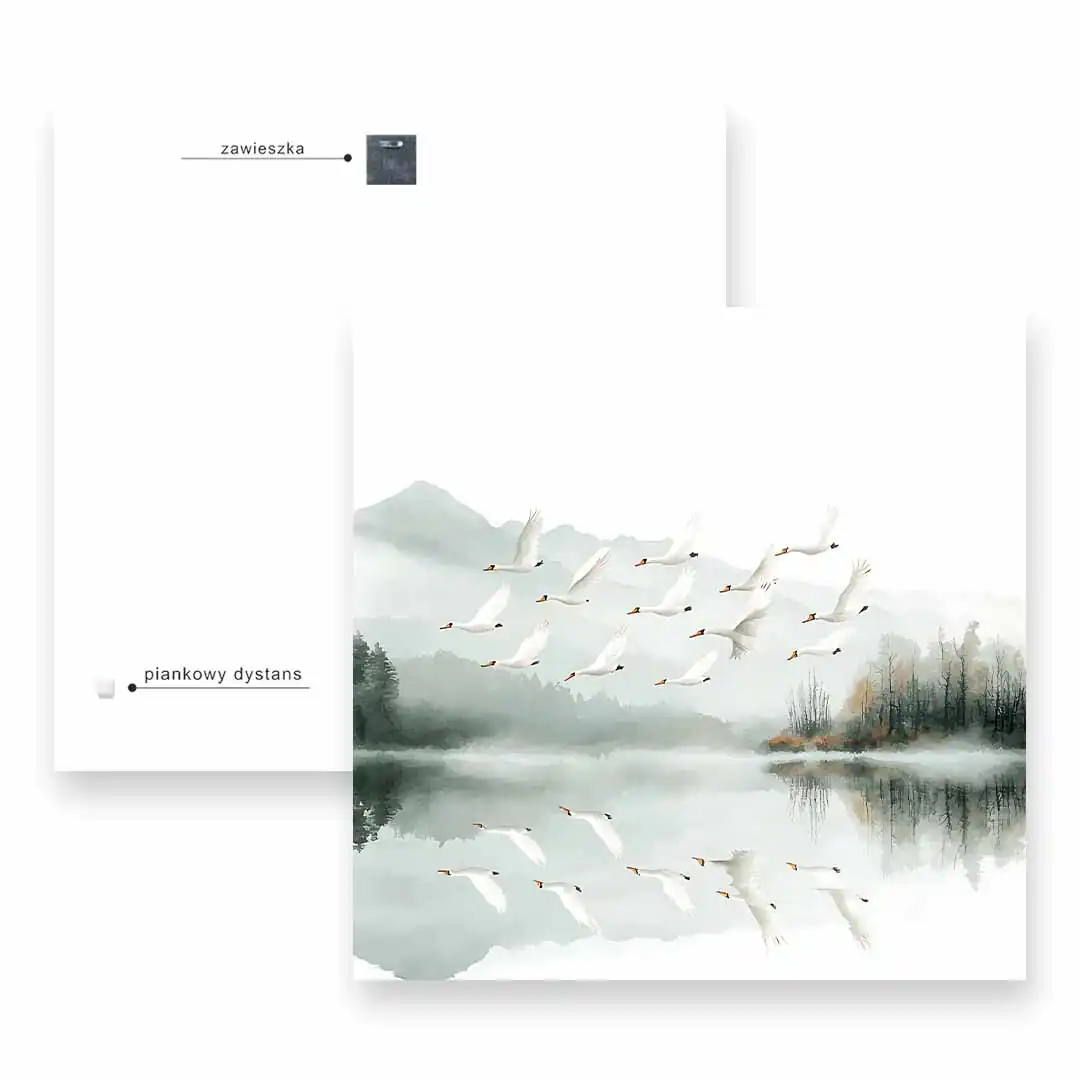Obraz na płótnie - Łabędzie nad jeziorem to piękna artystyczna ilustracja przedstawiająca stado wdzięcznych, białych łabędzi w locie nad spokojnym jeziorem. Jezioro zaprezentowane jest na tle widocznych w oddali gór spowitych mgłą i bezchmurnego nieba. Niezwykle elegancka kompozycja tworzy zdecydowanie bardzo spokojną atmosferę we wnętrzu, stwarzając warunki do refleksji i zadumy. Ciekawym efektem zastosowanym w tym motywie jest tafla jeziora odbijająca stado łabędzi w locie. Całość grafiki przedstawiona jest w zdecydowanie spokojnych barwach bieli, szarości i zieleni. Widoczne są drobne bardziej żywe dodatki kolorystyczne w postaci brązowych przebarwień lasu czy dziobów łabędzich. Motyw sprawdzi się w wielu wnętrzach jak i wielu stylach wykończenia.