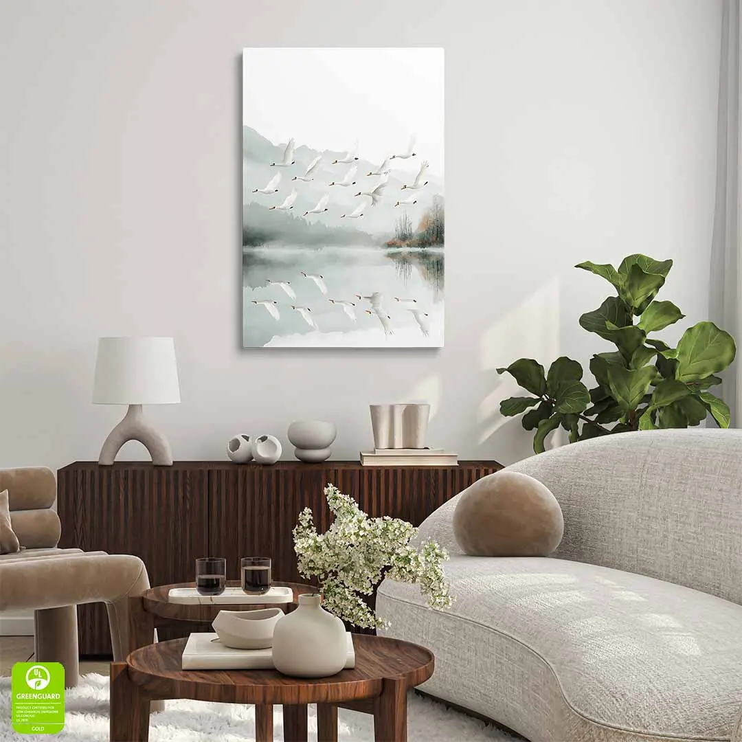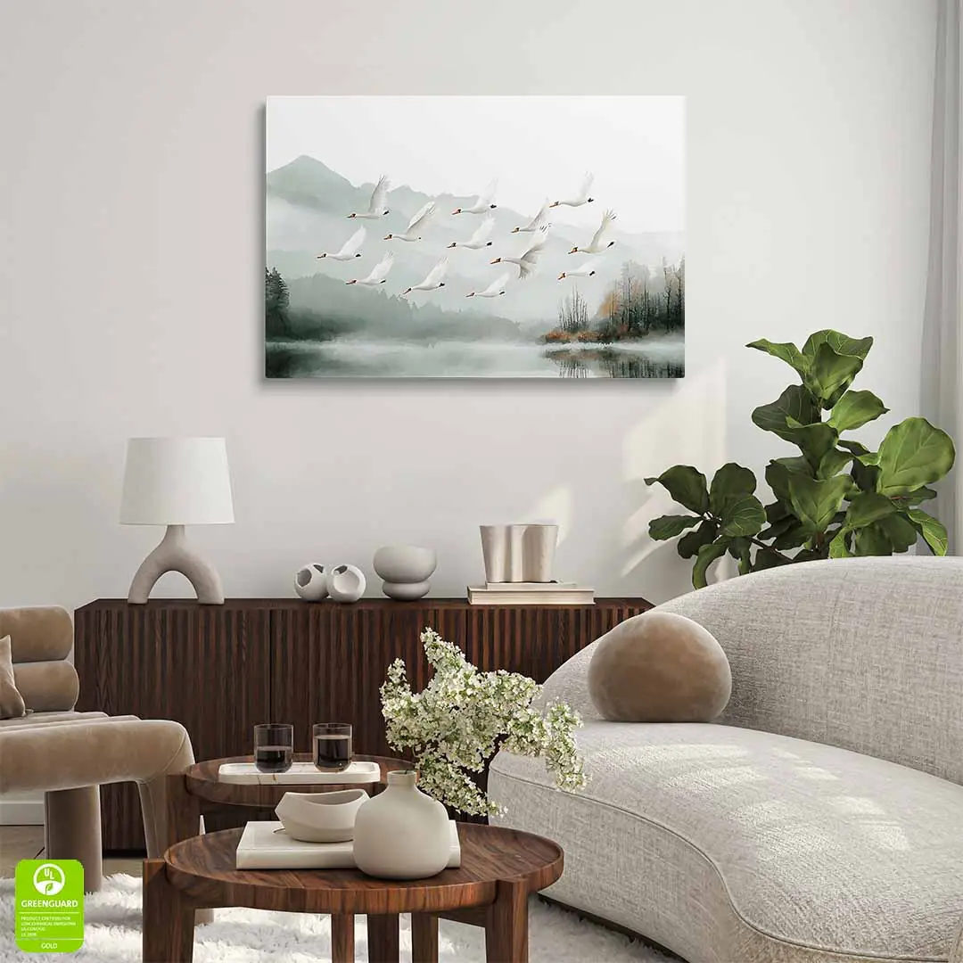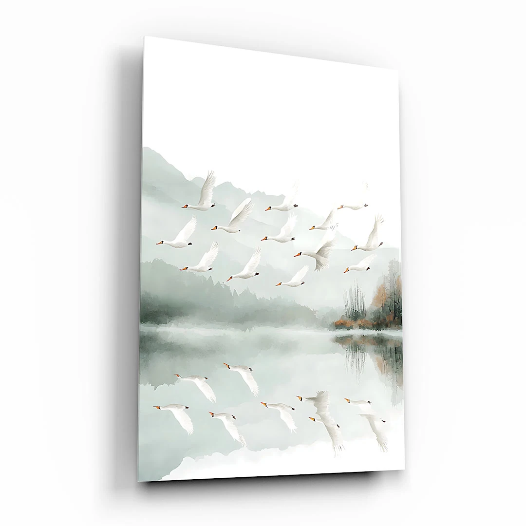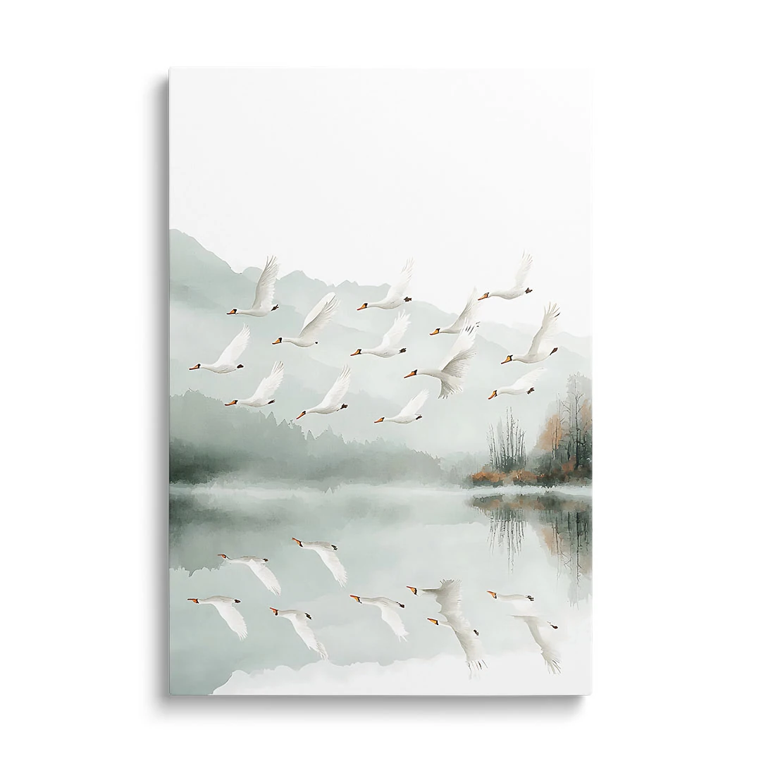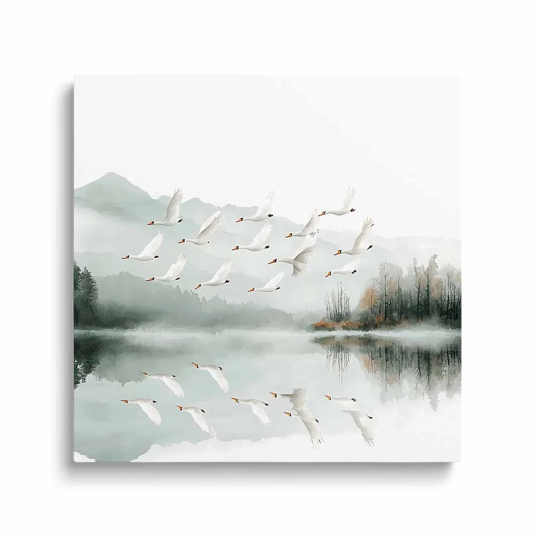 Obraz na płótnie - Łabędzie nad jeziorem to piękna artystyczna ilustracja przedstawiająca stado wdzięcznych, białych łabędzi w locie nad spokojnym jeziorem. Jezioro zaprezentowane jest na tle widocznych w oddali gór spowitych mgłą i bezchmurnego nieba. Niezwykle elegancka kompozycja tworzy zdecydowanie bardzo spokojną atmosferę we wnętrzu, stwarzając warunki do refleksji i zadumy. Ciekawym efektem zastosowanym w tym motywie jest tafla jeziora odbijająca stado łabędzi w locie. Całość grafiki przedstawiona jest w zdecydowanie spokojnych barwach bieli, szarości i zieleni. Widoczne są drobne bardziej żywe dodatki kolorystyczne w postaci brązowych przebarwień lasu czy dziobów łabędzich. Motyw sprawdzi się w wielu wnętrzach jak i wielu stylach wykończenia.