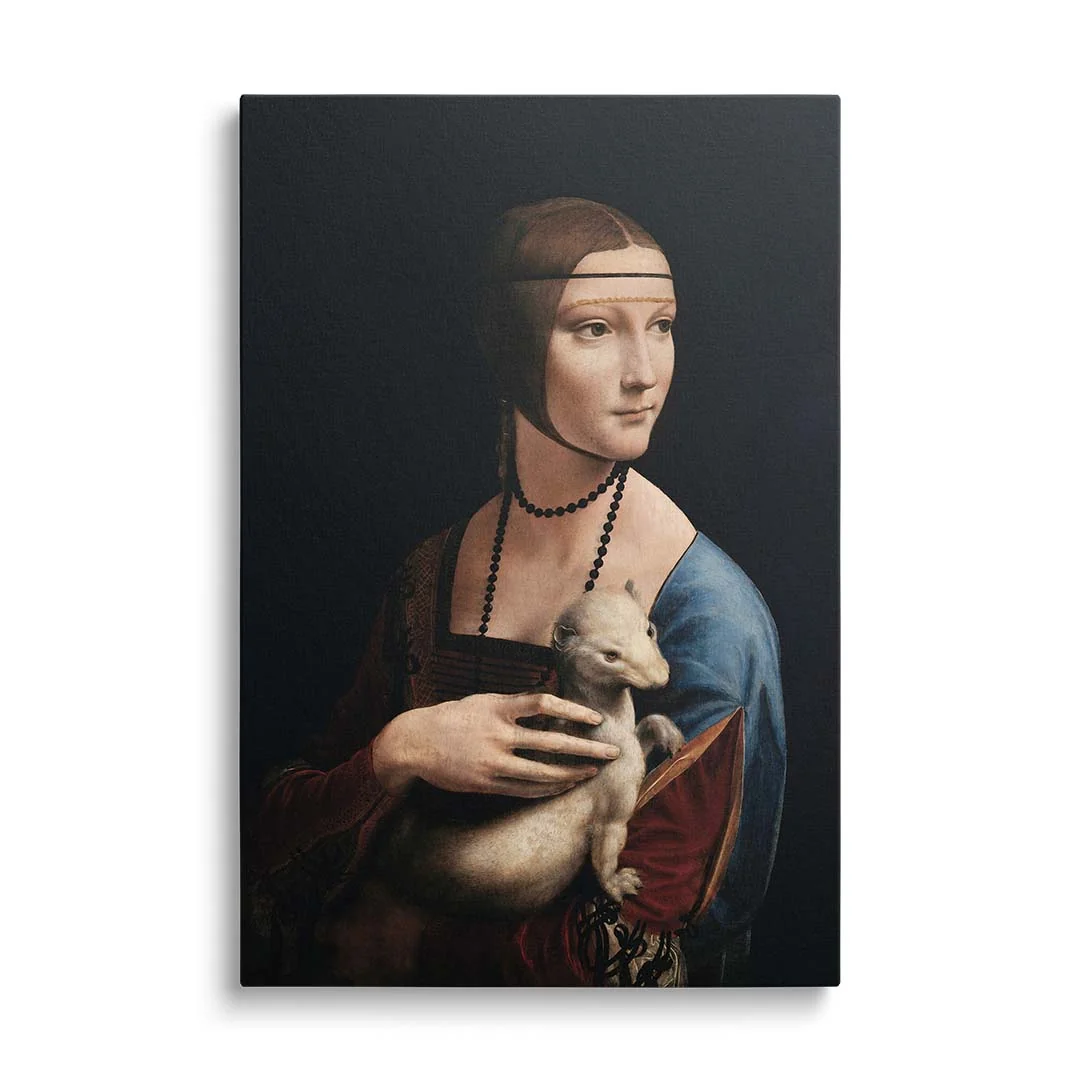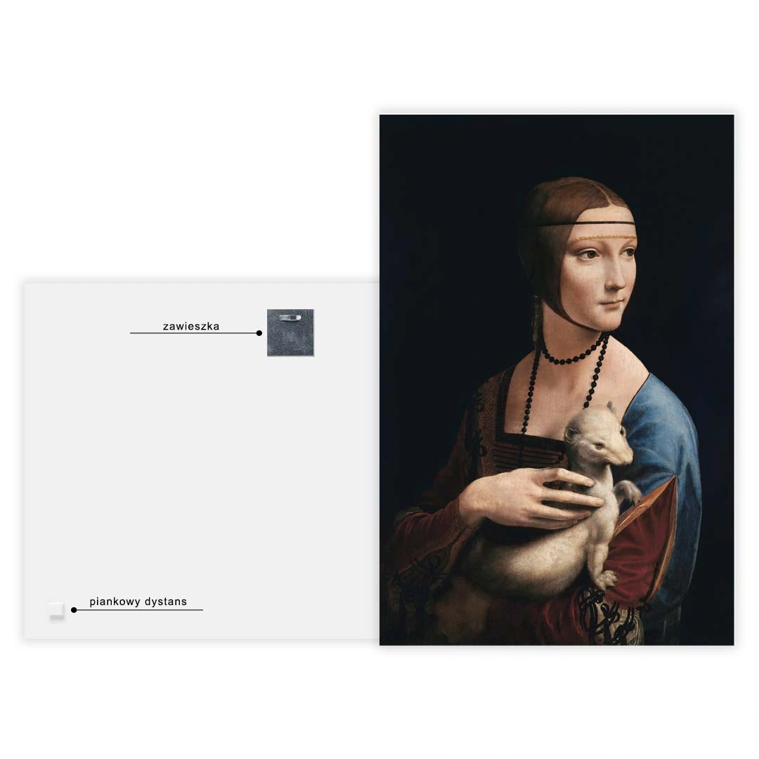Obraz na szkle - Leonardo da Vinci - Dama z gronostajem - to reprodukcja, w formie drukowanego obrazu na szkle hartowanym, jednego z najbardziej znanych dzieł malarza Leonarda da Vinci Lady with Ermine. Dama z gronostajem, zwana również, Damą z łasiczką przedstawia Cecylię Gallerani, kochankę księcia Mediolanu, Ludwika Sforzy. Na obrazie Cecylia uśmiecha się delikatnie, tajemniczo, spoglądając na coś, co wzbudziło jej zainteresowanie, podobnie jak trzymany na jej rękach gronostaj. Dzieło prezentowane jest raczej w ciemnej tonacji, a za czarnym tłem kryje się ciekawa historia, gdyż czarna farba pokrywa oryginalne tło, koloru ciemnoszarego. Obraz z lewej strony jest nieco ciemniejszy, z prawej zauważalne są nieco jaśniejsze barwy. Obraz ten jest jednym z najcenniejszych polskich dzieł sztuki i znajduje się w Muzeum Książąt Czartoryskich w Krakowie. Jeśli podobają Ci się światowej sławy dzieła sztuki we własnym wnętrzu to ta dekoracja ścienna jest znakomitym wyborem.