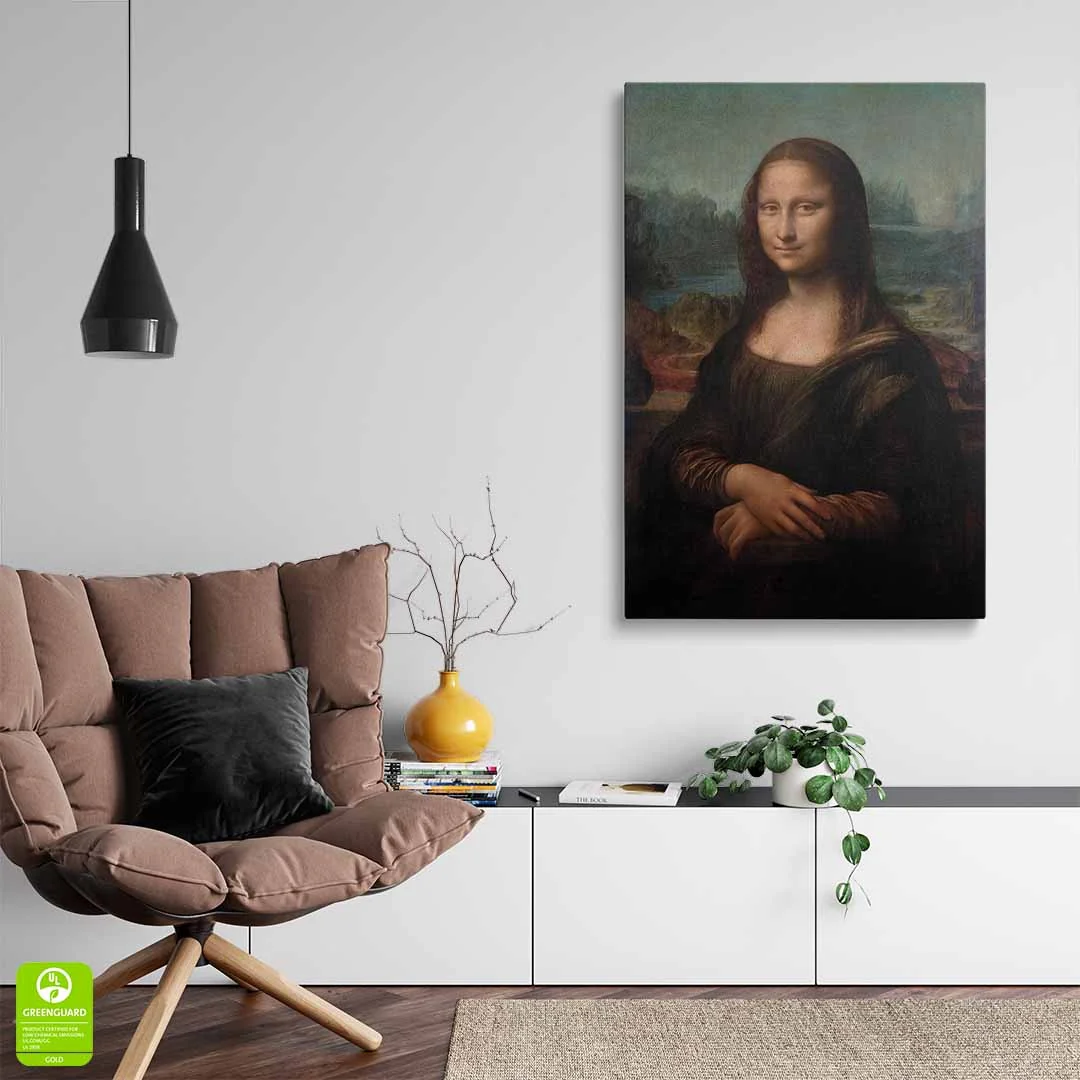 Obraz na szkle - Leonardo da Vinci - Mona Lisa - to reprodukcja, w formie obrazu na szkle hartowanym, jednego z najbardziej znanych obrazów olejnych Leonarda da Vinci. Mona Lisa, zwana również, "La Gioconda" przedstawia młodą, tajemniczo uśmiechniętą kobietę, prawdopodobnie Lisę Gherardini, żonę florentyńskiego kupca. Obraz wystawiany jest w Luwrze w Paryżu i jest niewątpliwie jednym z najsłynniejszych i najczęściej oglądanych na świecie dzieł sztuki. Codziennie w paryskim muzeum ustawiają się ogromne kolejki miłośników tego dzieła, by móc zobaczyć go z blisko, choć na chwilę. Kobieta ukazana jest w pozycji siedzącej na balkonie, a za nią widoczny jest krajobraz wijących się ścieżek i potoków. Jeśli podobają Ci się światowej sławy dzieła sztuki we własnym wnętrzu, a szczególnie Mona Lisa, to ten obraz jest znakomitym wyborem.