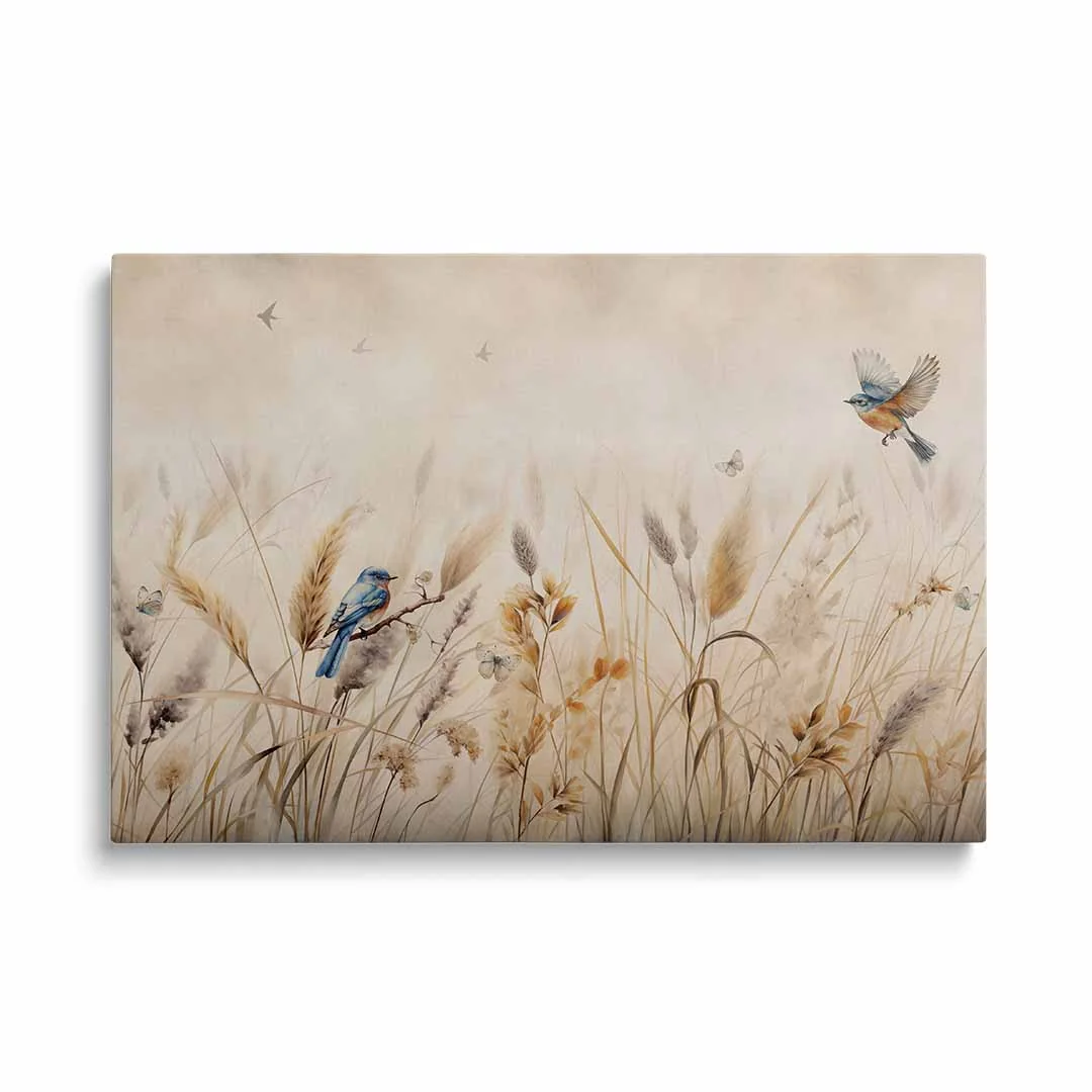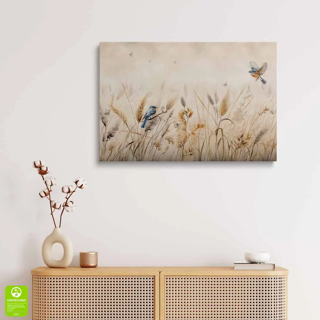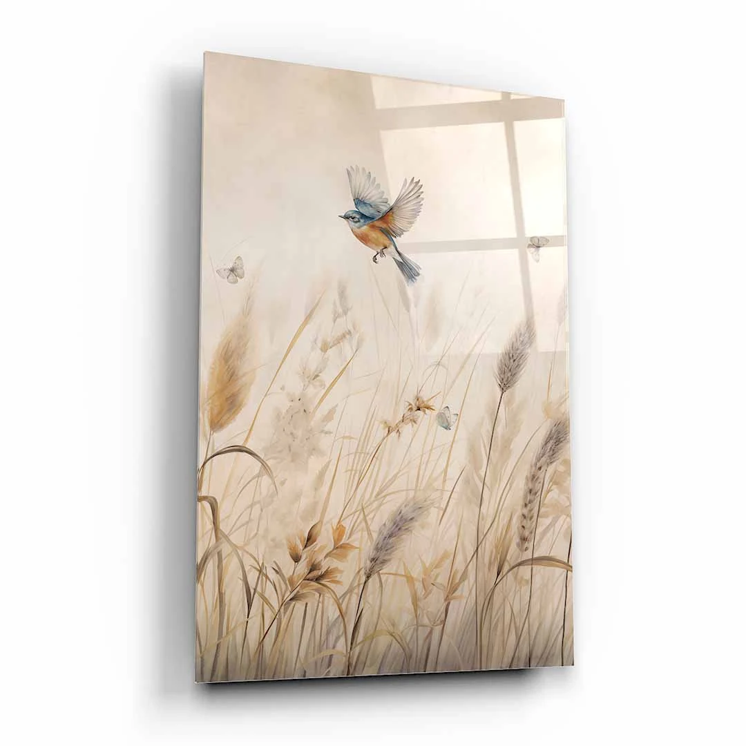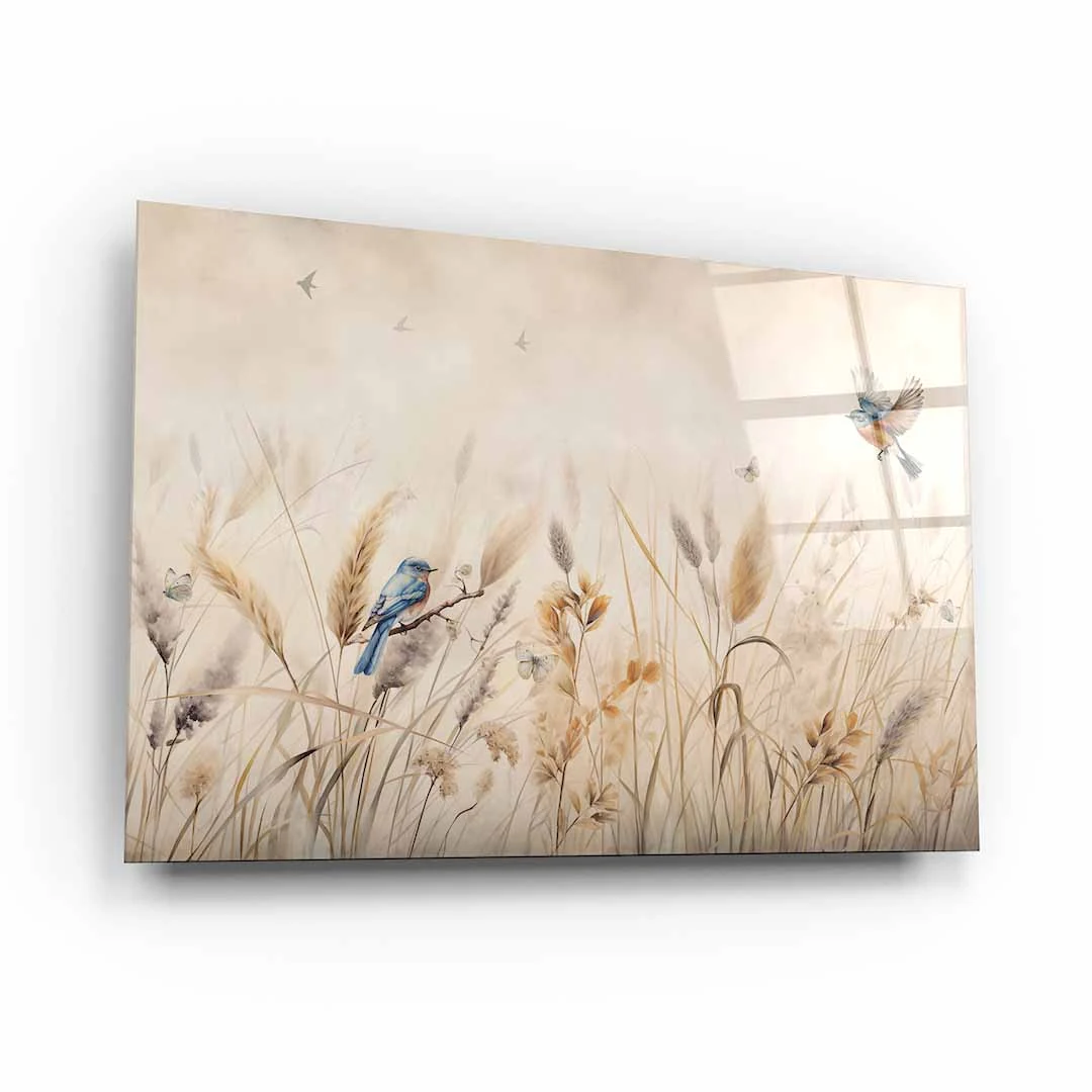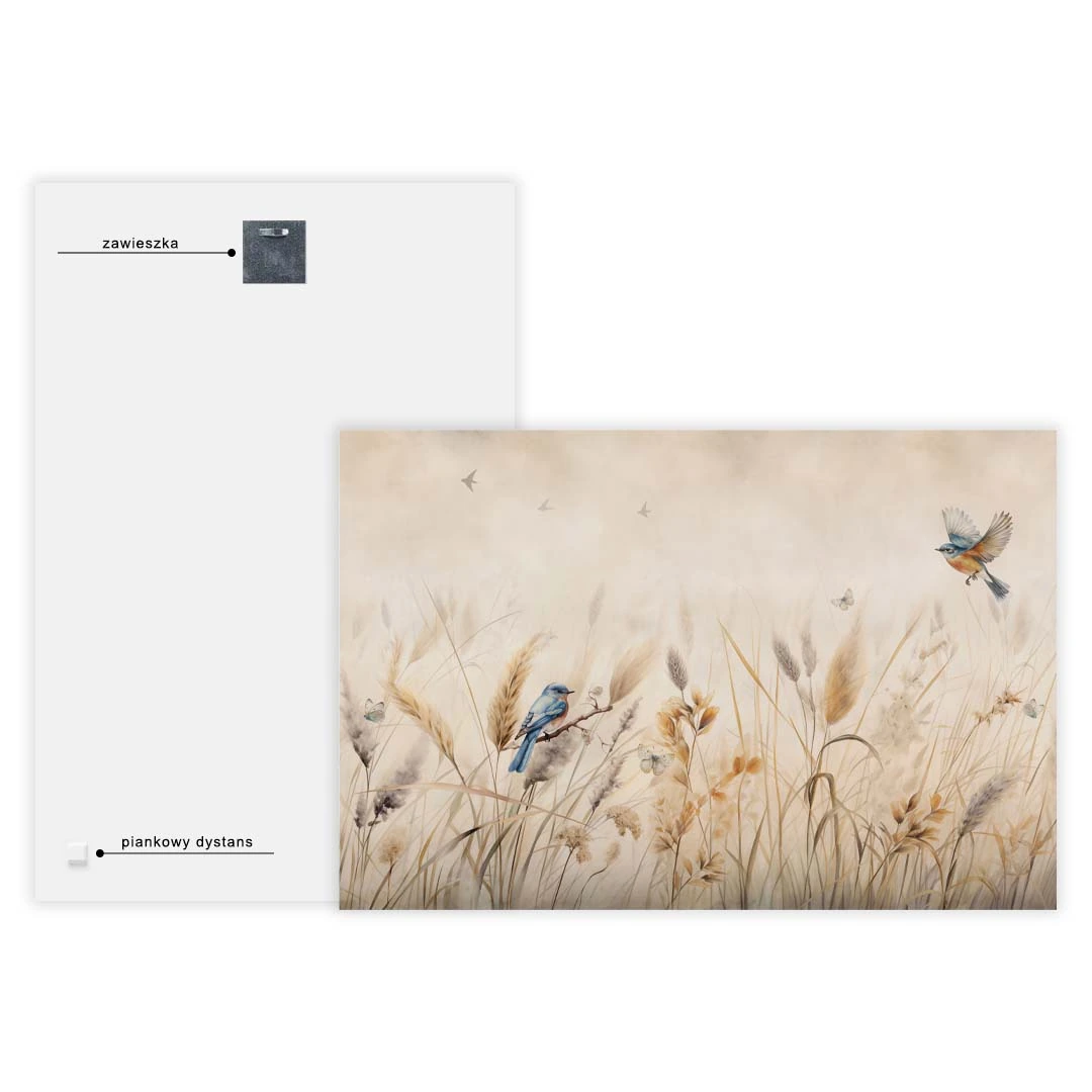 Obraz na szkle - Natura - Łąka z ptakami - Subtelna dekoracja do sypialni, salonu lub jadalni, styl rustykalny, boho