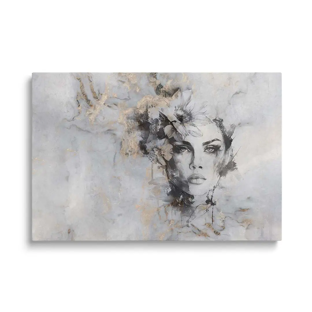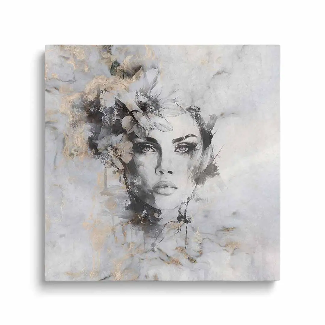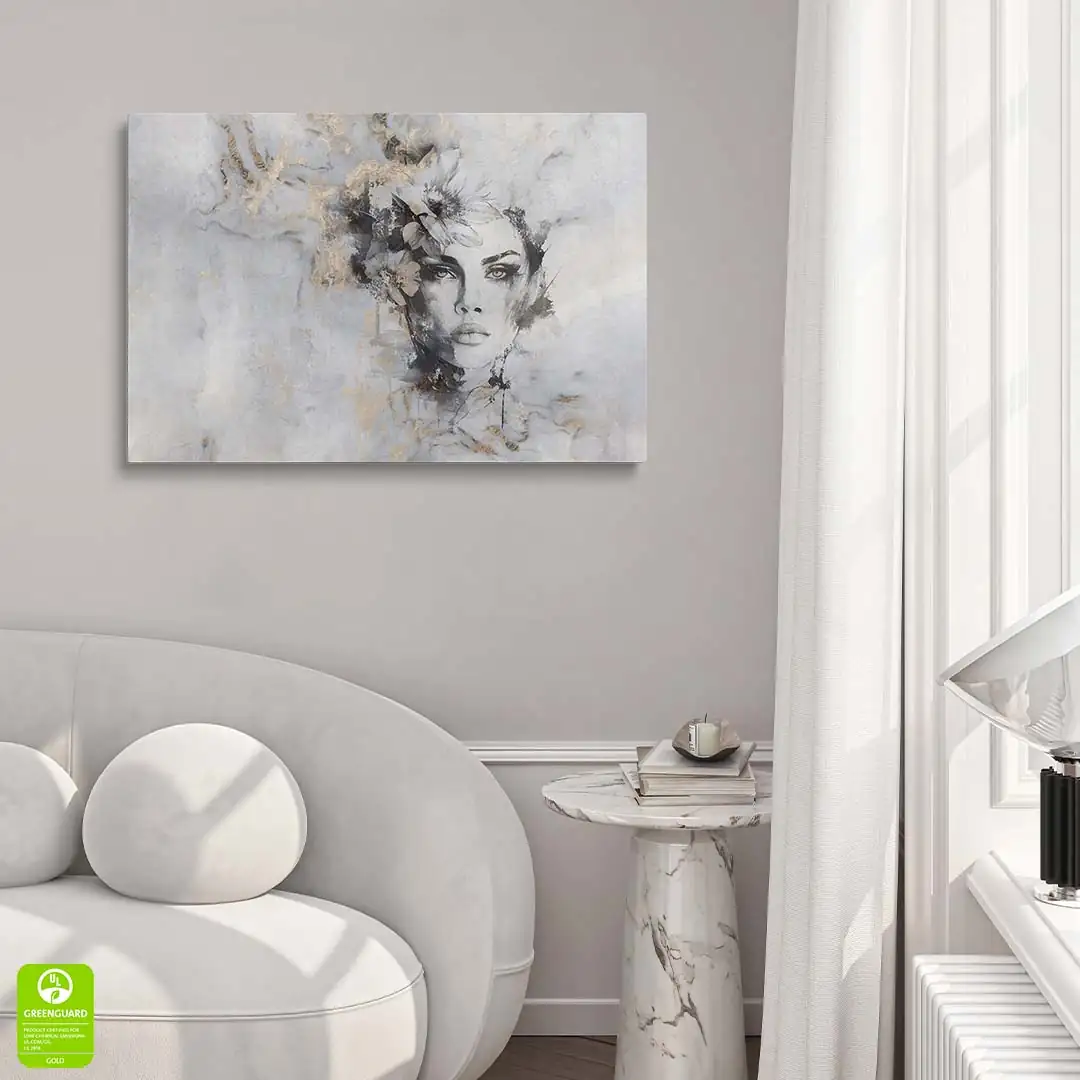 - techniką druku - proces drukowania wykorzystuje inne metody tworzenia kolorów (tzw. "przestrzeń barw") niż te, które stosowane są na ekranach komputera; kolory drukowane mogą wyglądać również nieco inaczej na różnych materiałach (np. canvasie, flizelinie, papierze czy szkle itp.) i przy użyciu różnych tuszy, w naszym przypadku tuszy do druku UV; złote elementy nie są wybiórczo metalizowane - efekt uzyskany jest poprzez wydruk tekstury w kolorze złota;