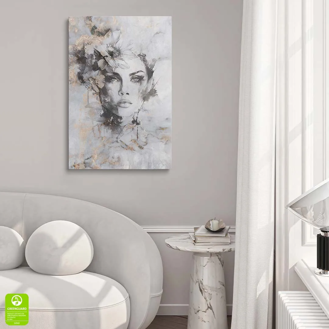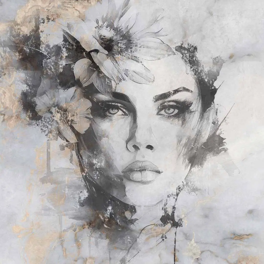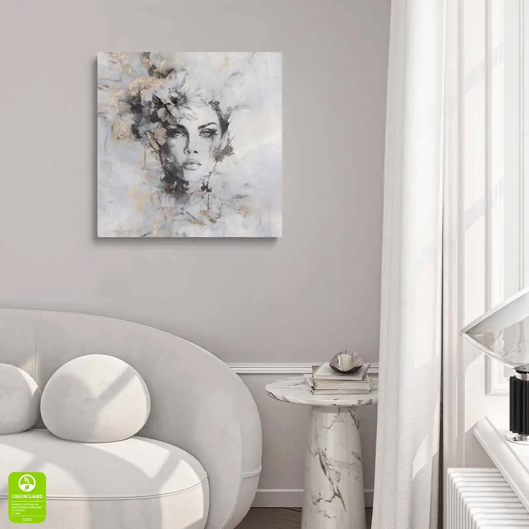 - techniką druku - proces drukowania wykorzystuje inne metody tworzenia kolorów (tzw. "przestrzeń barw") niż te, które stosowane są na ekranach komputera; kolory drukowane mogą wyglądać również nieco inaczej na różnych materiałach (np. canvasie, flizelinie, papierze czy szkle itp.) i przy użyciu różnych tuszy, w naszym przypadku tuszy do druku UV; złote elementy nie są wybiórczo metalizowane - efekt uzyskany jest poprzez wydruk tekstury w kolorze złota;