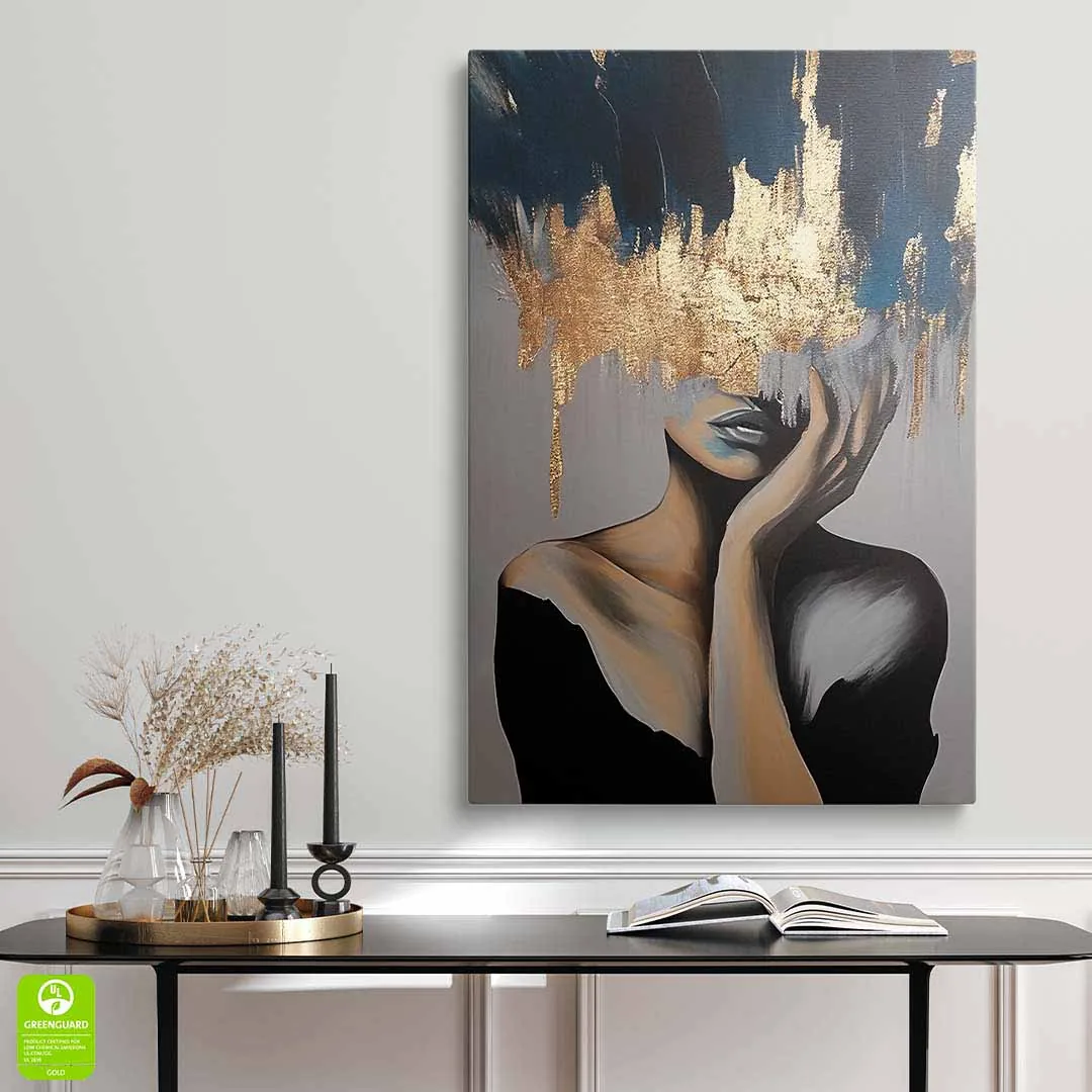 - techniką druku - proces drukowania wykorzystuje inne metody tworzenia kolorów (tzw. "przestrzeń barw") niż te, które stosowane są na ekranach komputera; kolory drukowane mogą wyglądać również nieco inaczej na różnych materiałach (np. canvasie, flizelinie, papierze czy szkle itp.) i przy użyciu różnych tuszy, w naszym przypadku tuszy do druku UV; złote elementy nie są wybiórczo metalizowane - efekt uzyskany jest poprzez wydruk tekstury w kolorze złota;