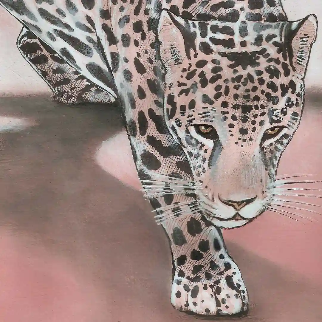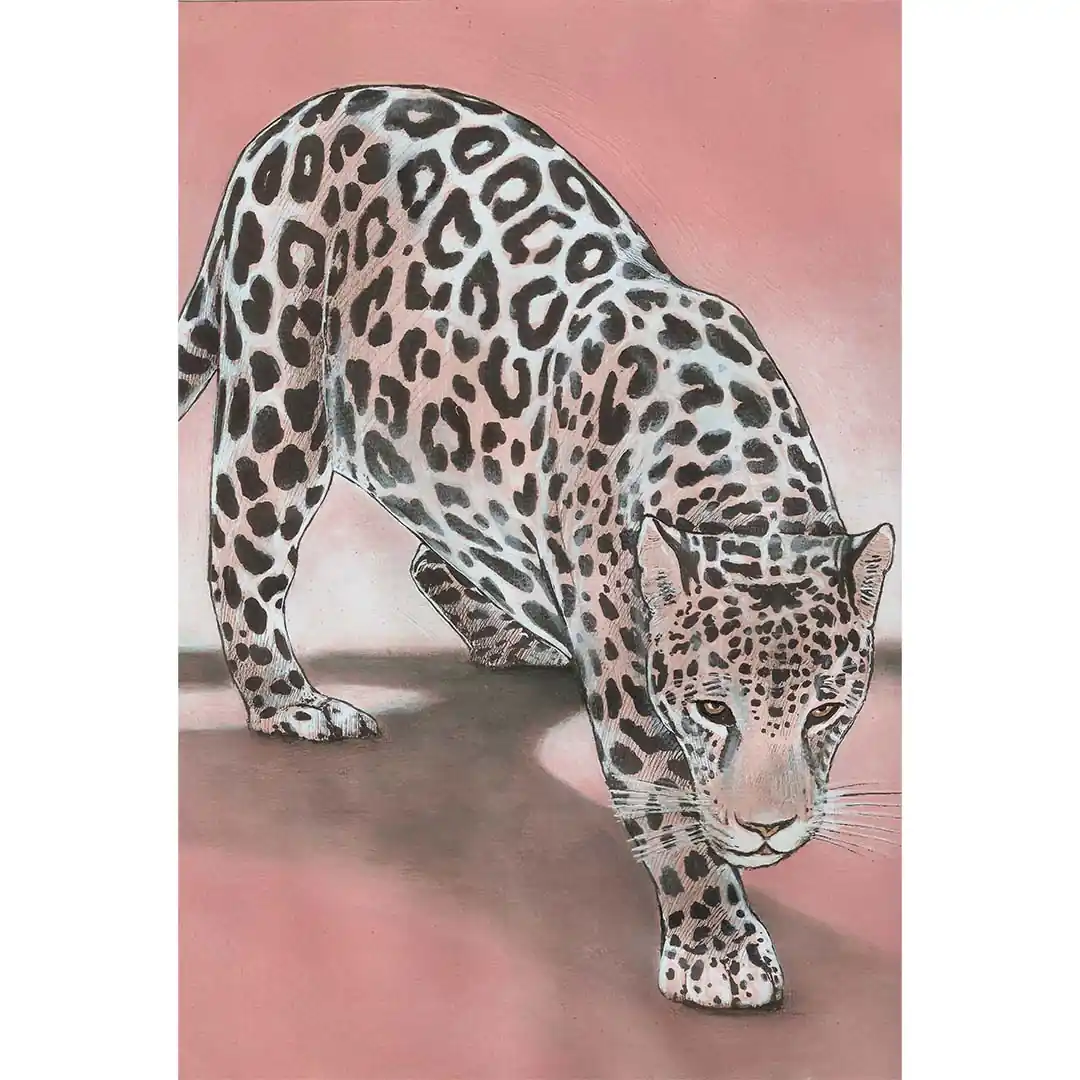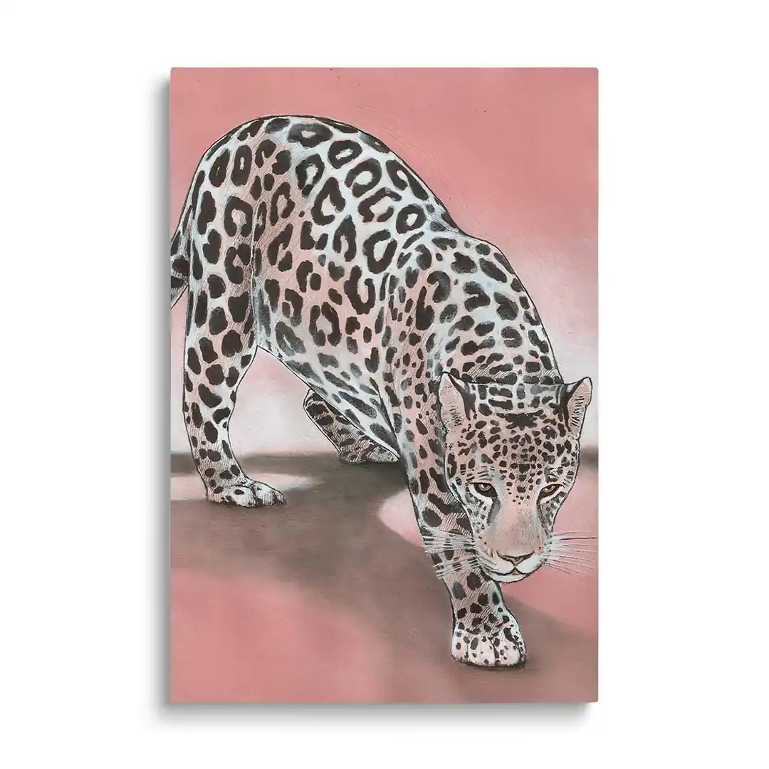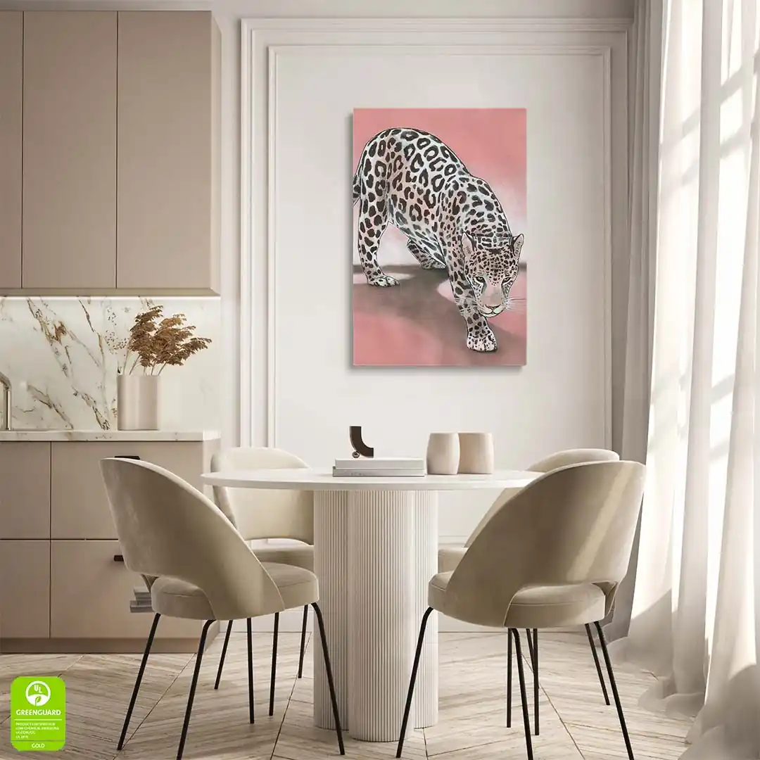 Obraz na szkle - Przyczajony lampart - Zwierzęta, Natura, Różowy, Drapieżnik, Pionowy