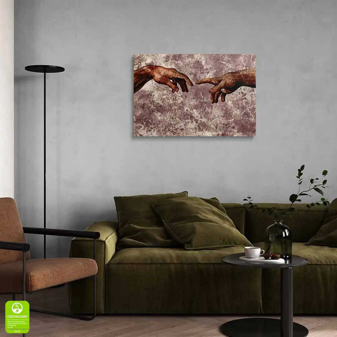 - techniką druku - proces drukowania wykorzystuje inne metody tworzenia kolorów (tzw. "przestrzeń barw") niż te, które stosowane są na ekranach komputera; kolory drukowane mogą wyglądać również nieco inaczej na różnych materiałach (np. canvasie, flizelinie, papierze czy szkle itp.) i przy użyciu różnych tuszy, w naszym przypadku tuszy do druku UV; złote elementy nie są wybiórczo metalizowane - efekt uzyskany jest poprzez wydruk tekstury w kolorze złota;
