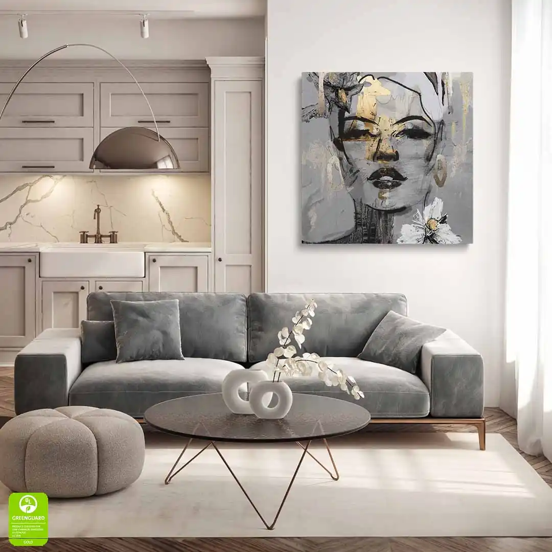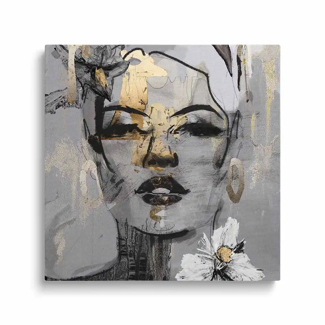 - techniką druku - proces drukowania wykorzystuje inne metody tworzenia kolorów (tzw. "przestrzeń barw") niż te, które stosowane są na ekranach komputera; kolory drukowane mogą wyglądać również nieco inaczej na różnych materiałach (np. canvasie, flizelinie, papierze czy szkle itp.) i przy użyciu różnych tuszy, w naszym przypadku tuszy do druku UV; złote elementy nie są wybiórczo metalizowane - efekt uzyskany jest poprzez wydruk tekstury w kolorze złota;