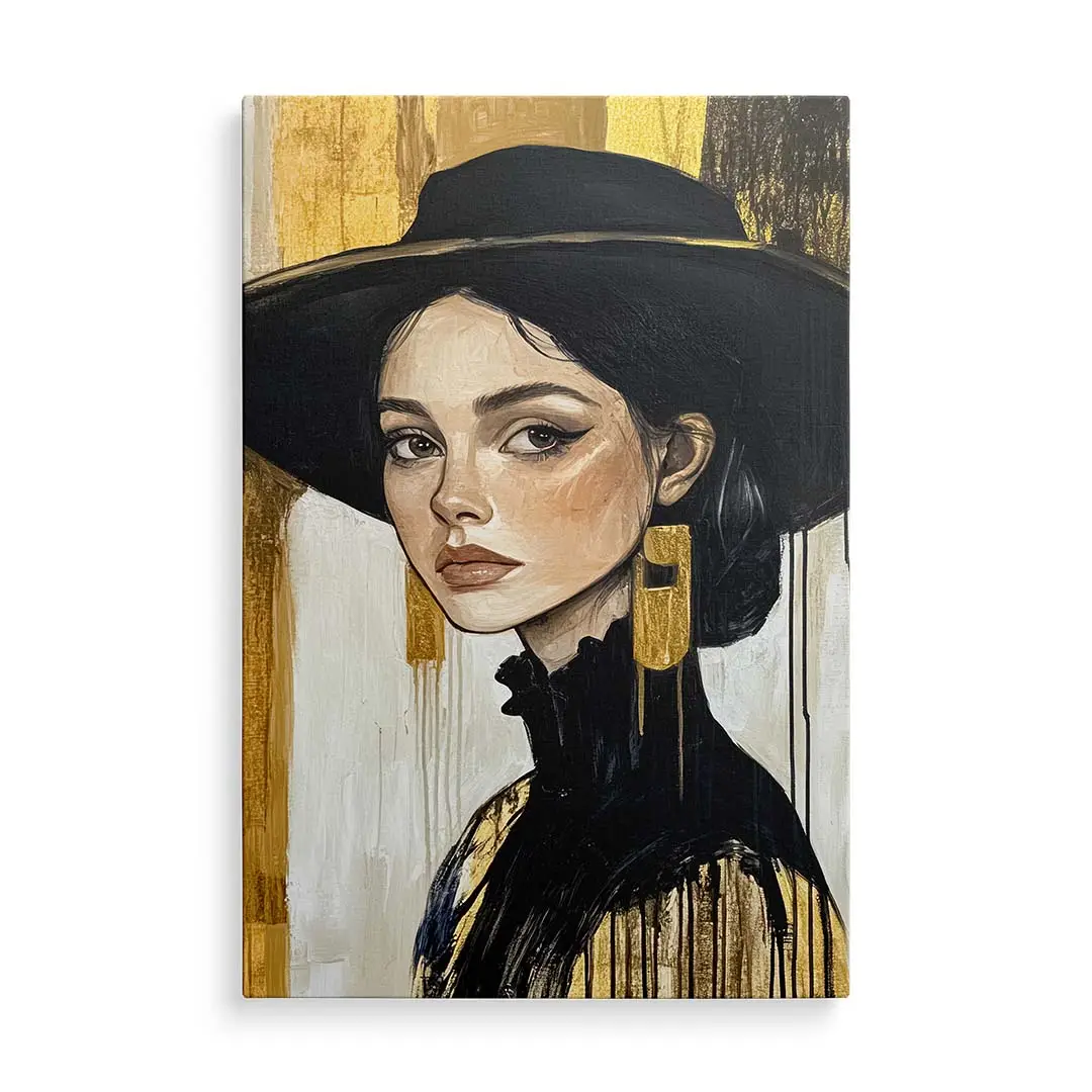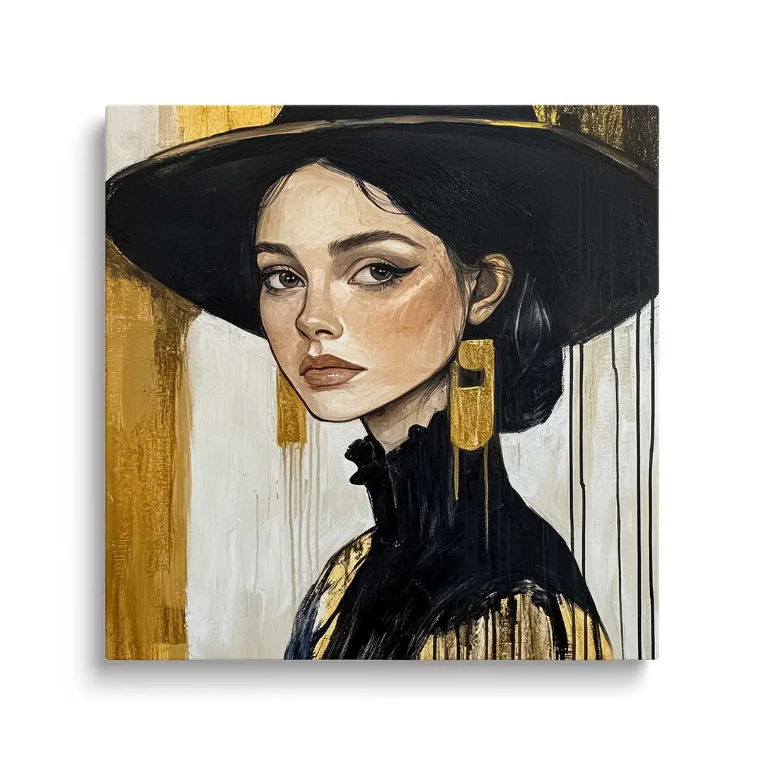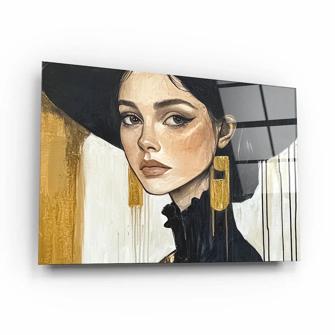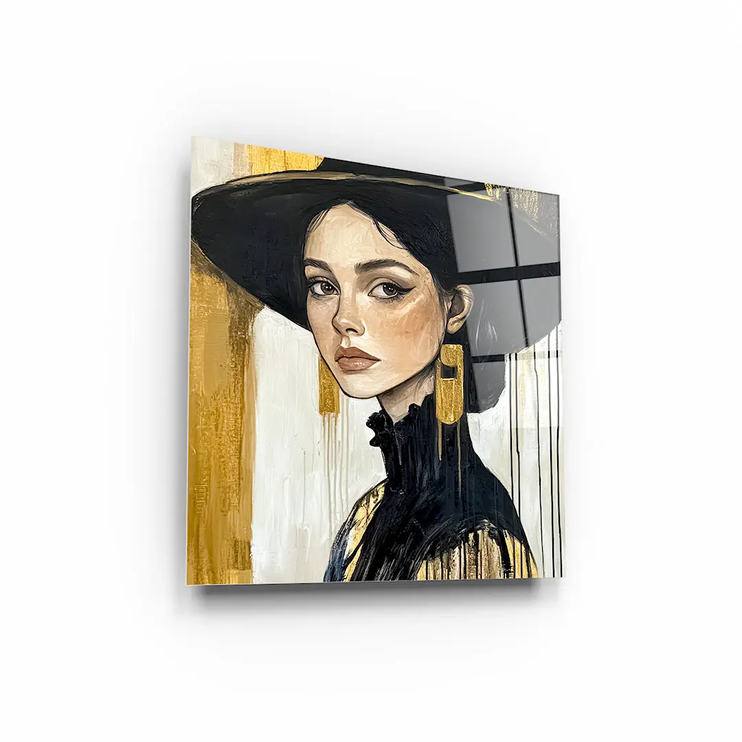 Obraz na szkle - Złota Elegancja – Portret kobiety w czarnym kapeluszu