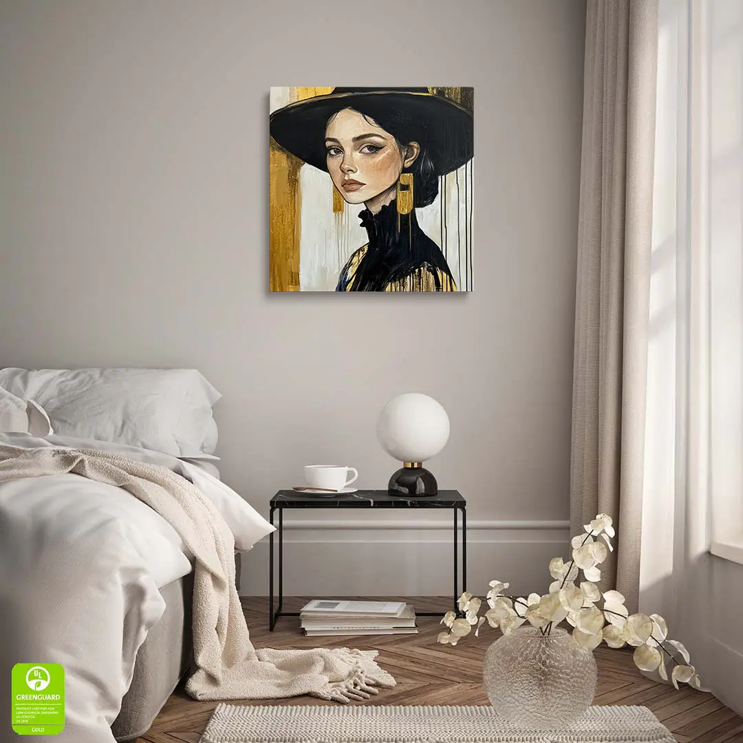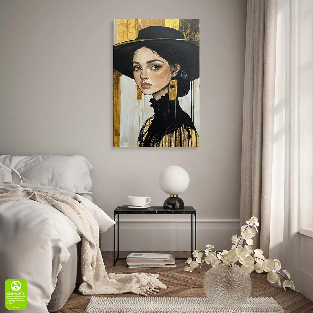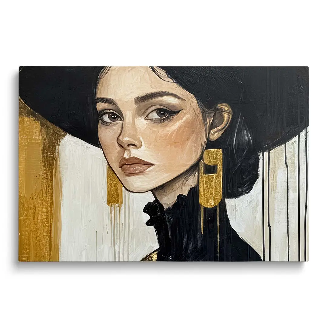 Obraz na szkle - Złota Elegancja – Portret kobiety w czarnym kapeluszu