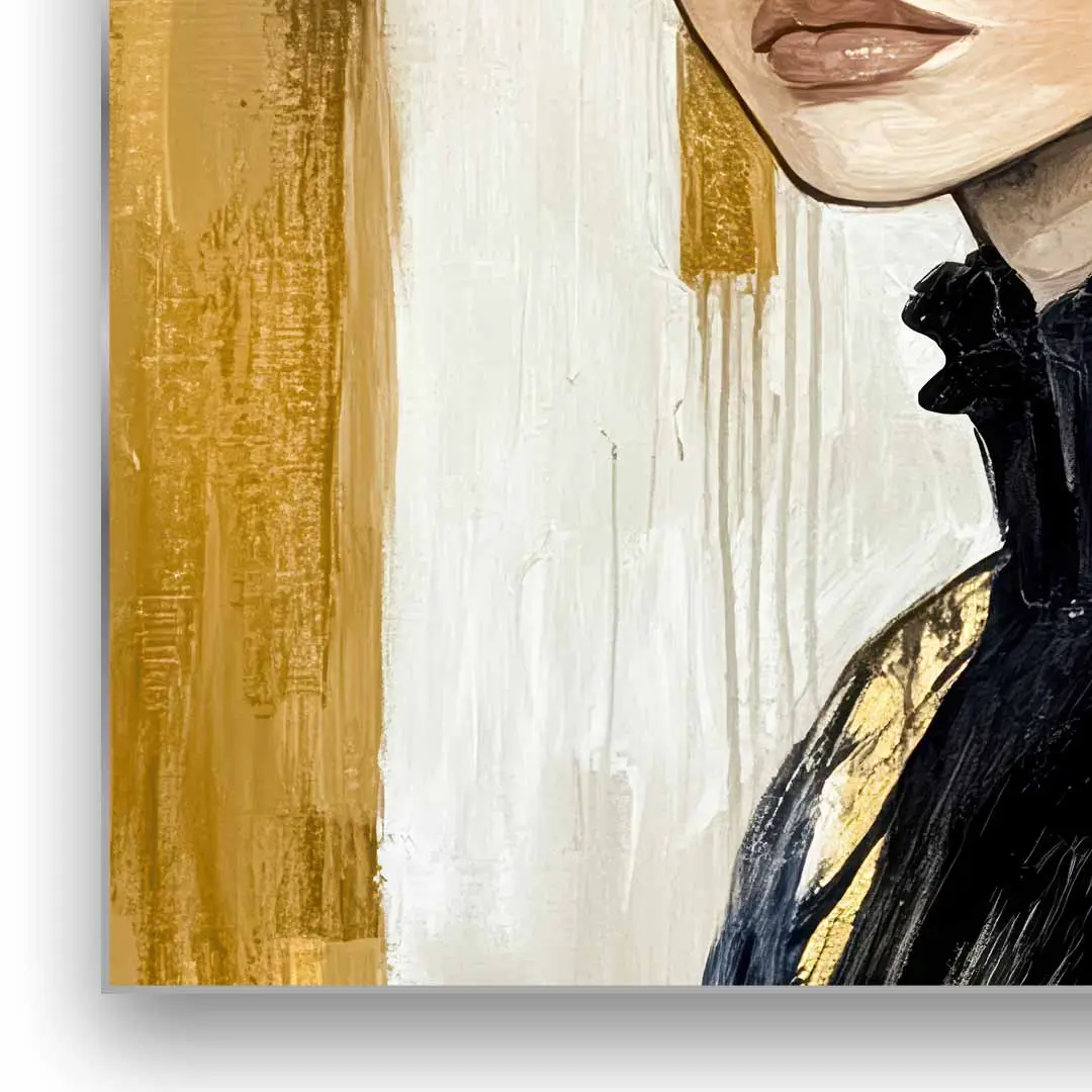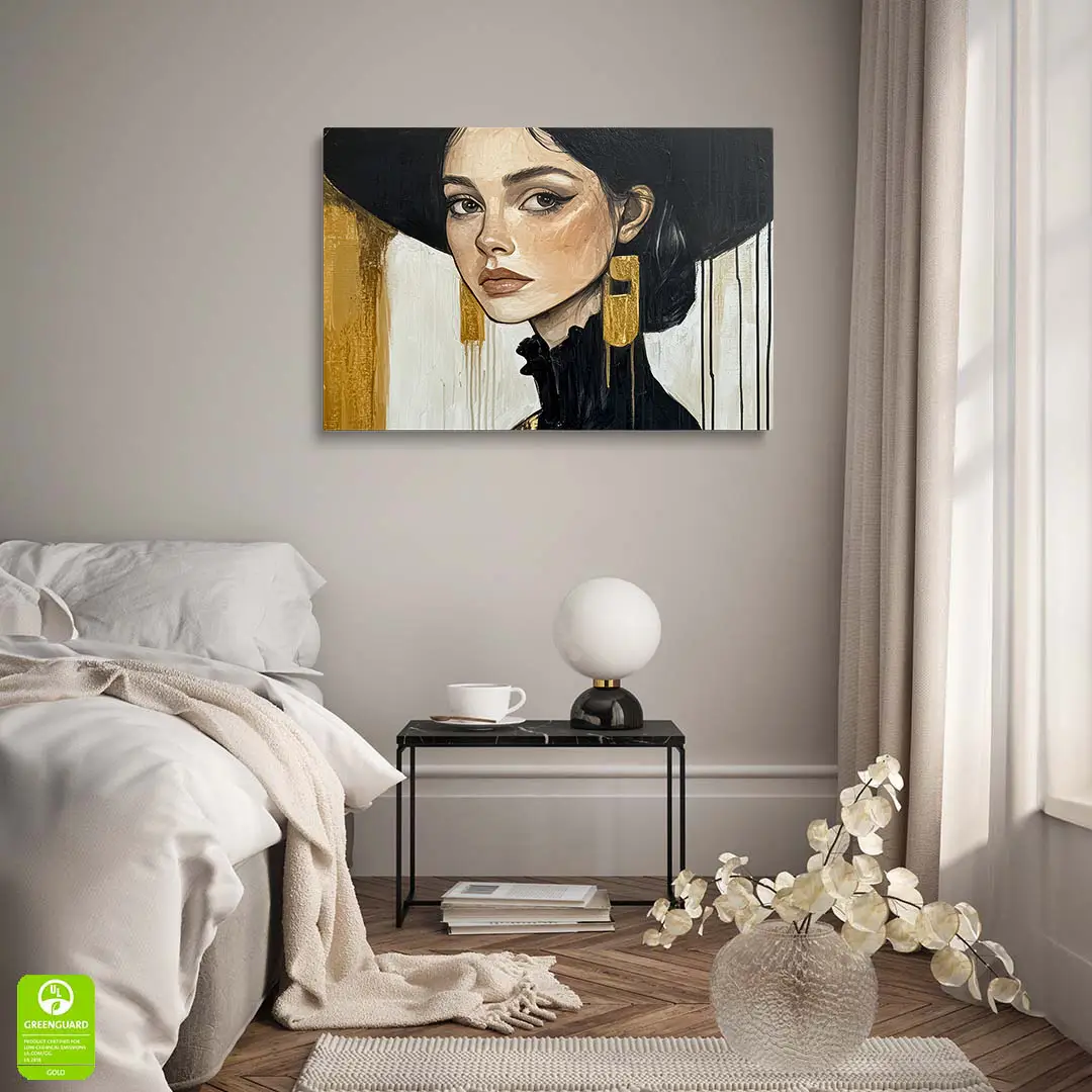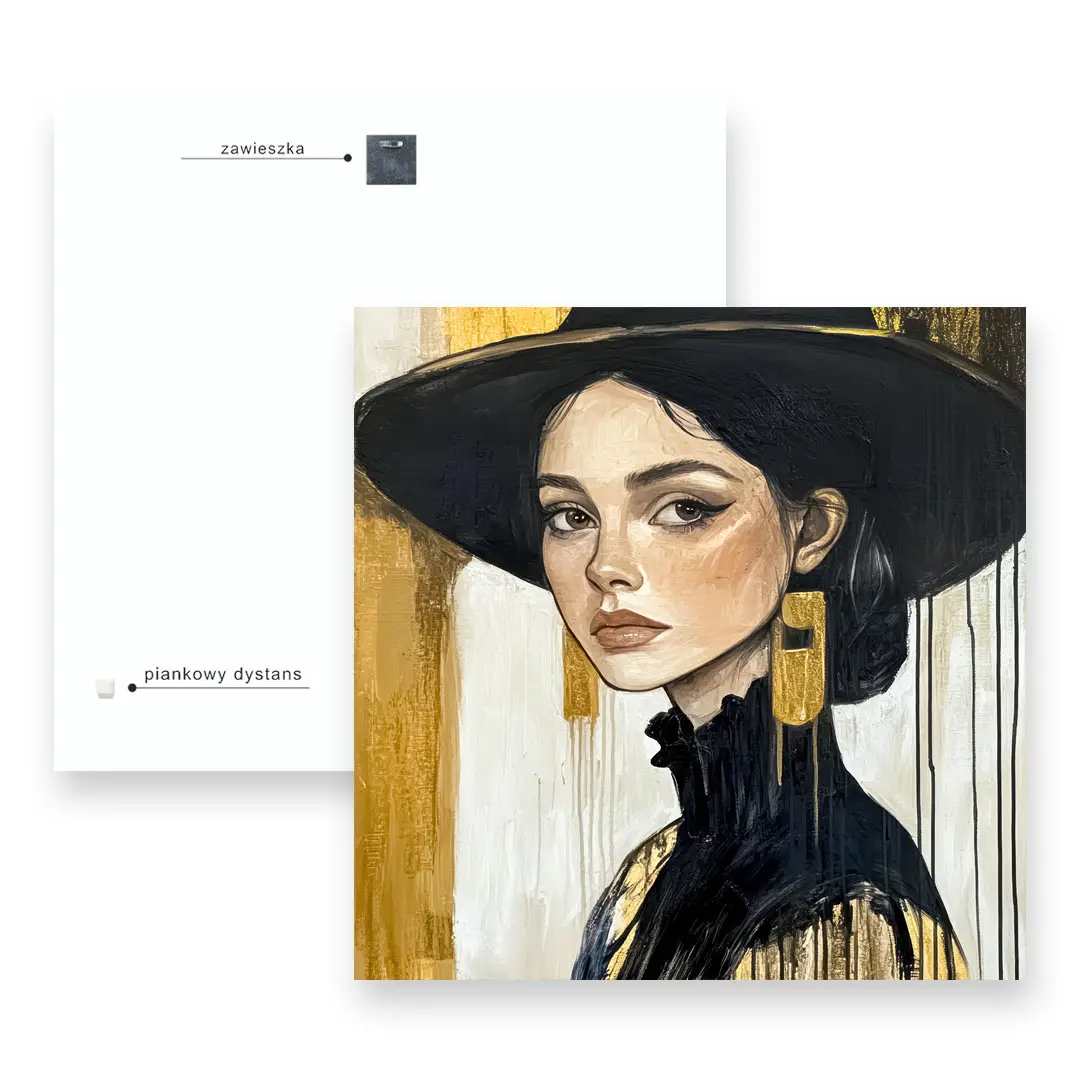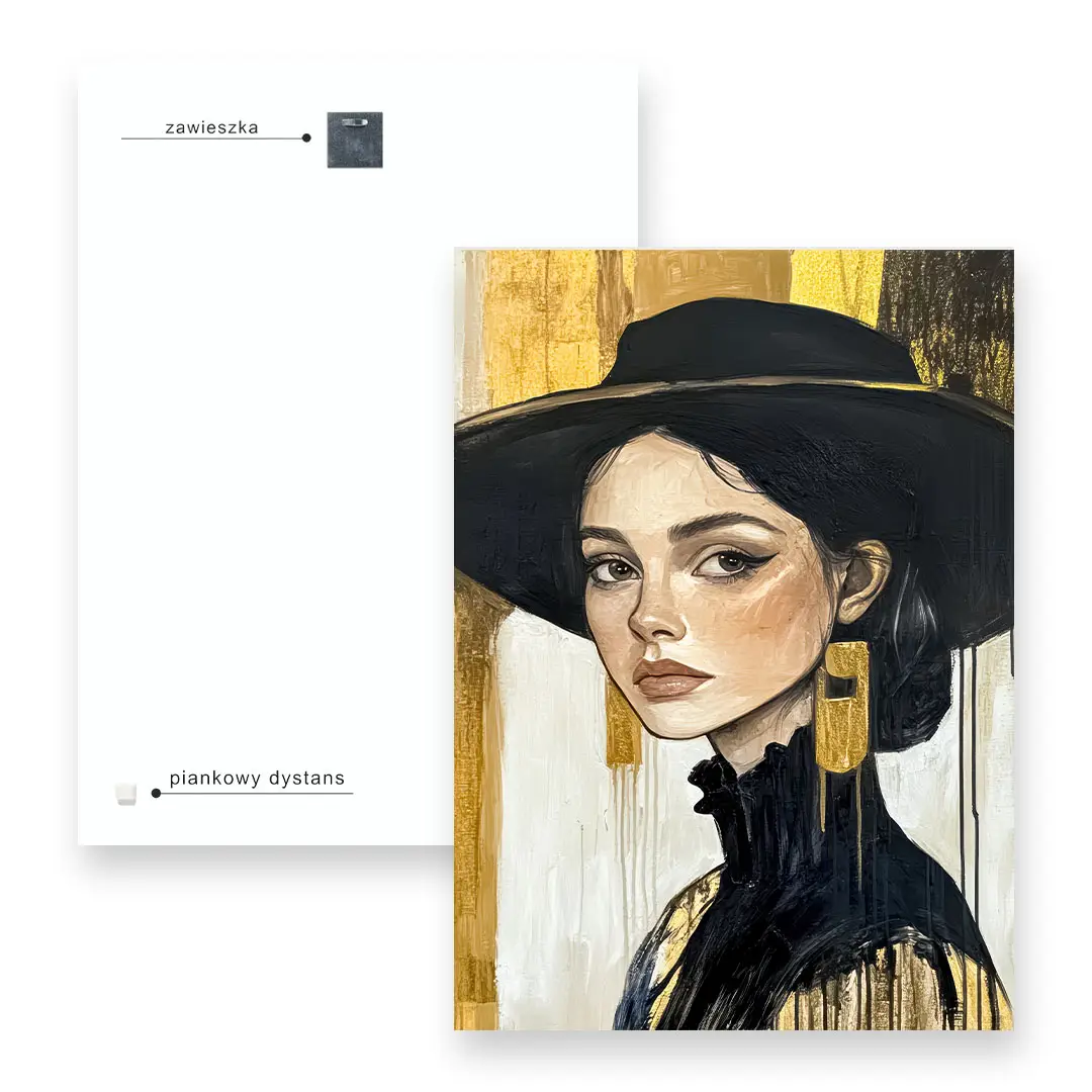 Obraz na szkle - Złota Elegancja – Portret kobiety w czarnym kapeluszu