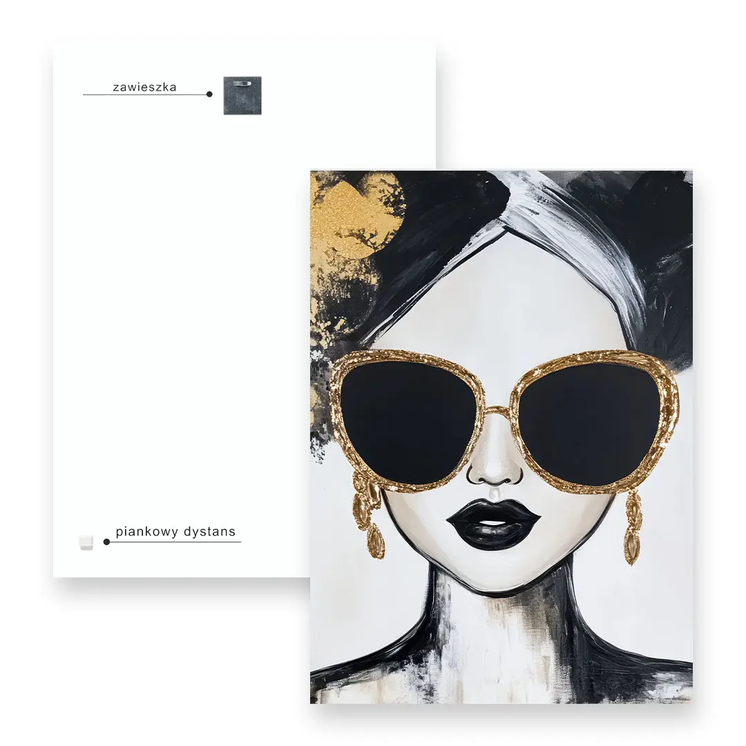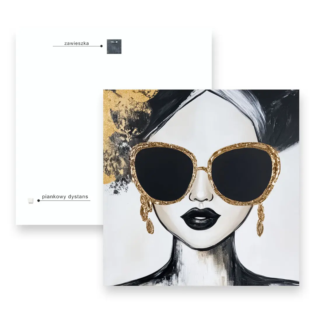 - techniką druku - proces drukowania wykorzystuje inne metody tworzenia kolorów (tzw. "przestrzeń barw") niż te, które stosowane są na ekranach komputera; kolory drukowane mogą wyglądać również nieco inaczej na różnych materiałach (np. canvasie, flizelinie, papierze czy szkle itp.) i przy użyciu różnych tuszy, w naszym przypadku tuszy do druku UV; złote elementy nie są wybiórczo metalizowane - efekt uzyskany jest poprzez wydruk tekstury w kolorze złota;