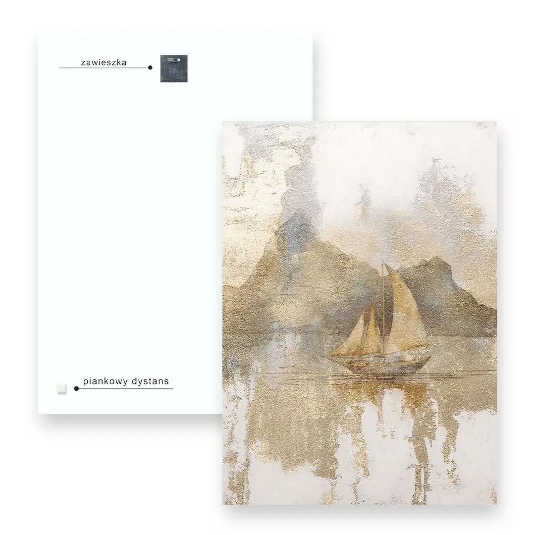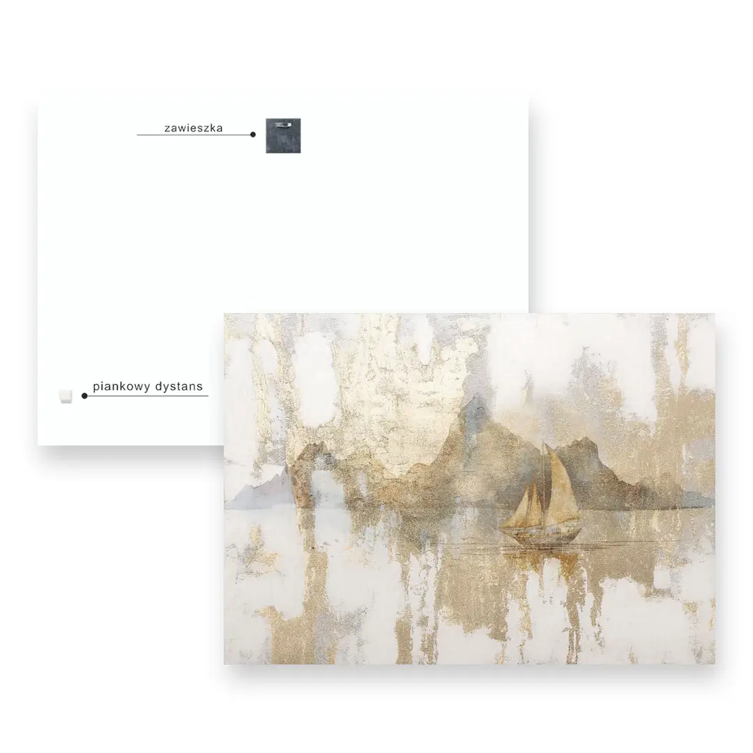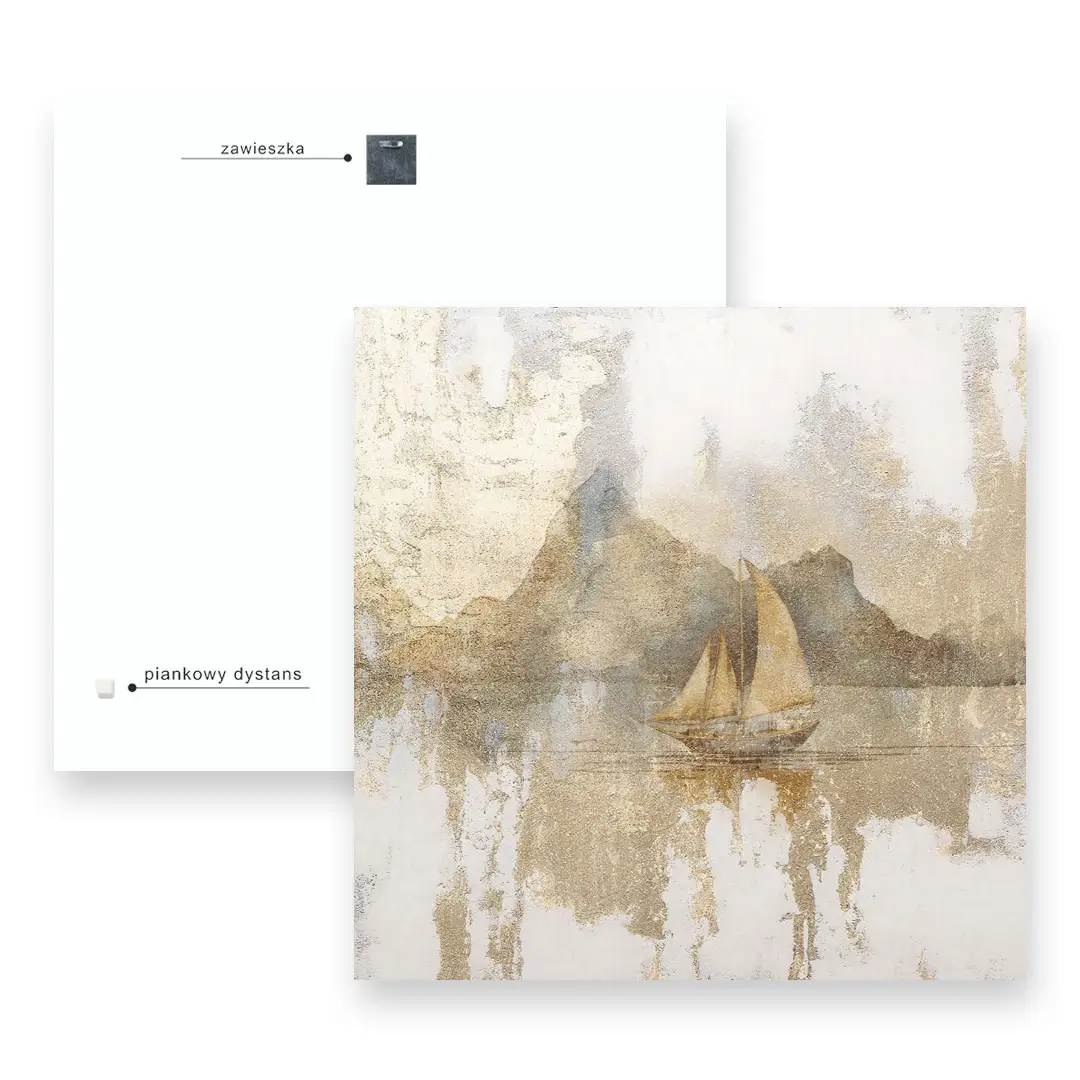 - techniką druku - proces drukowania wykorzystuje inne metody tworzenia kolorów (tzw. "przestrzeń barw") niż te, które stosowane są na ekranach komputera; kolory drukowane mogą wyglądać również nieco inaczej na różnych materiałach (np. canvasie, flizelinie, papierze czy szkle itp.) i przy użyciu różnych tuszy, w naszym przypadku tuszy do druku UV; złote elementy nie są wybiórczo metalizowane - efekt uzyskany jest poprzez wydruk tekstury w kolorze złota;