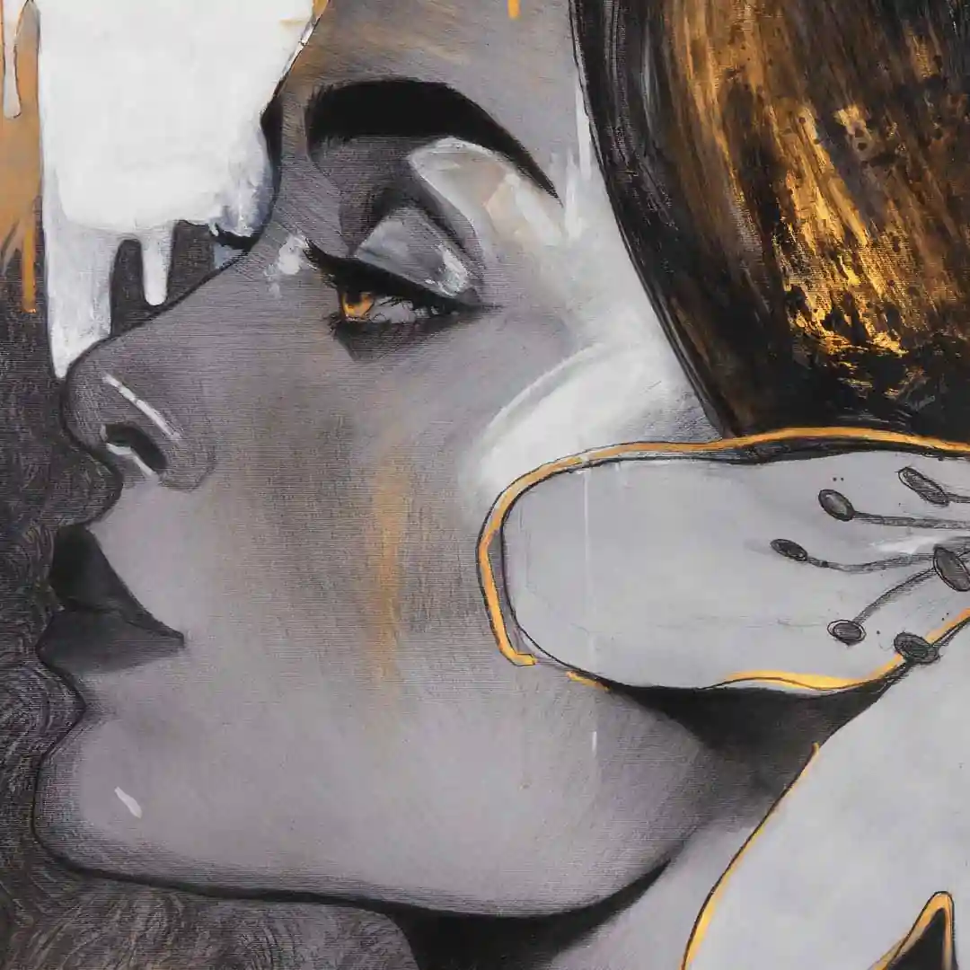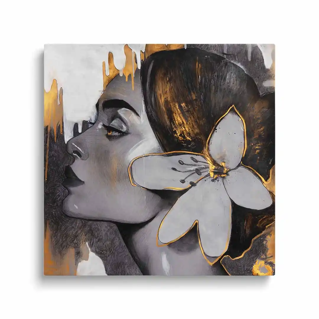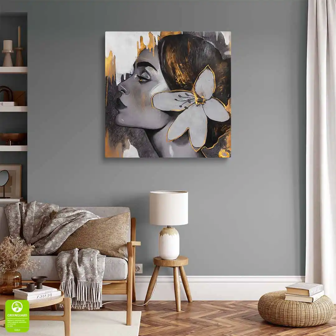 - techniką druku - proces drukowania wykorzystuje inne metody tworzenia kolorów (tzw. "przestrzeń barw") niż te, które stosowane są na ekranach komputera; kolory drukowane mogą wyglądać również nieco inaczej na różnych materiałach (np. canvasie, flizelinie, papierze czy szkle itp.) i przy użyciu różnych tuszy, w naszym przypadku tuszy do druku UV; złote elementy nie są wybiórczo metalizowane - efekt uzyskany jest poprzez wydruk tekstury w kolorze złota;