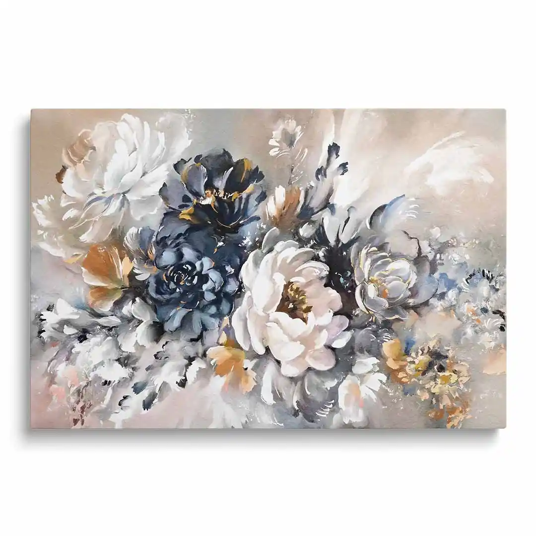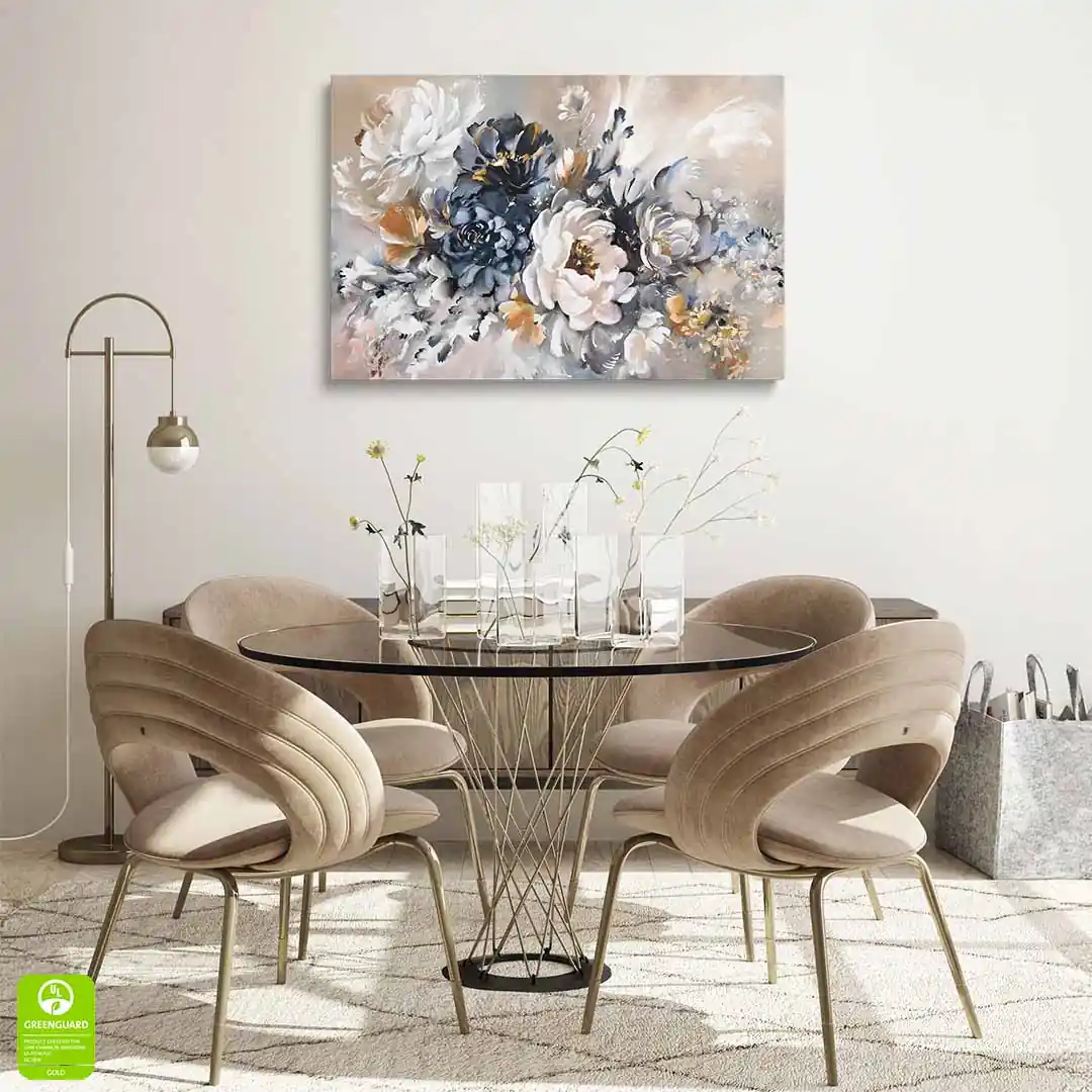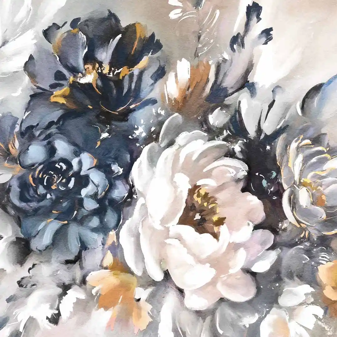 - techniką druku - proces drukowania wykorzystuje inne metody tworzenia kolorów (tzw. "przestrzeń barw") niż te, które stosowane są na ekranach komputera; kolory drukowane mogą wyglądać również nieco inaczej na różnych materiałach (np. canvasie, flizelinie, papierze czy szkle itp.) i przy użyciu różnych tuszy, w naszym przypadku tuszy do druku UV; złote elementy nie są wybiórczo metalizowane - efekt uzyskany jest poprzez wydruk tekstury w kolorze złota;