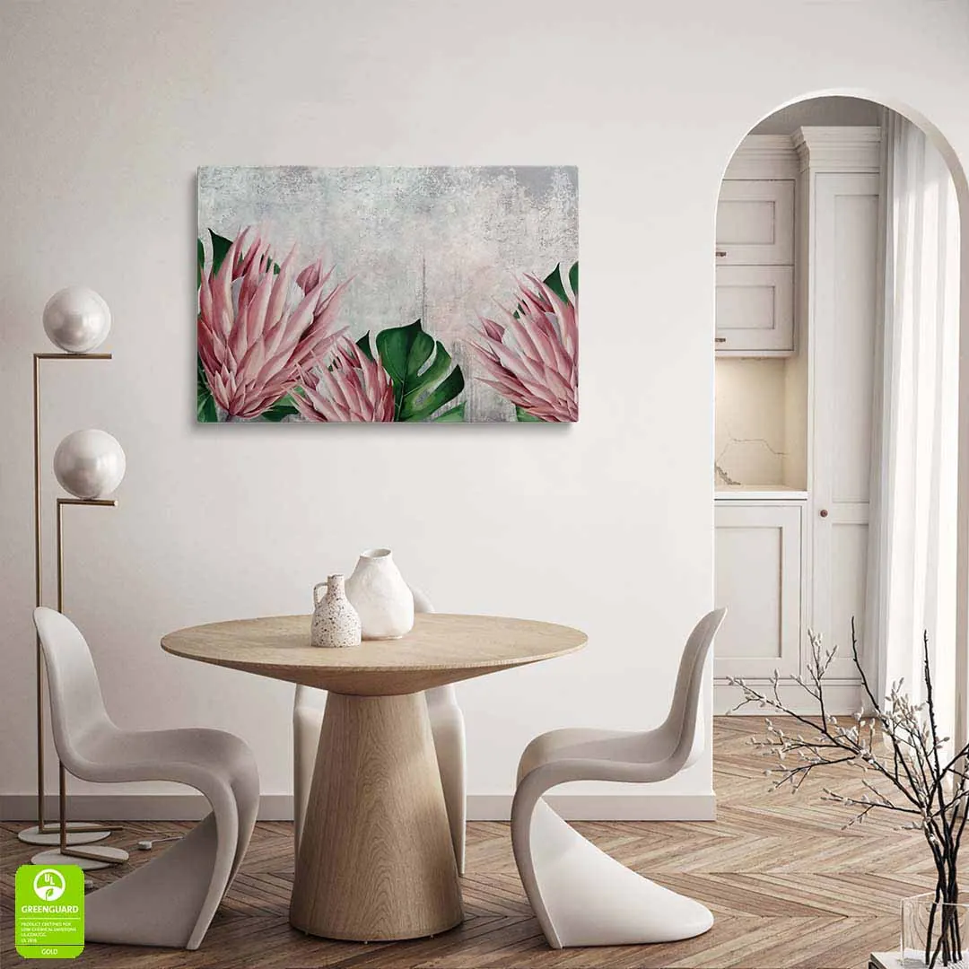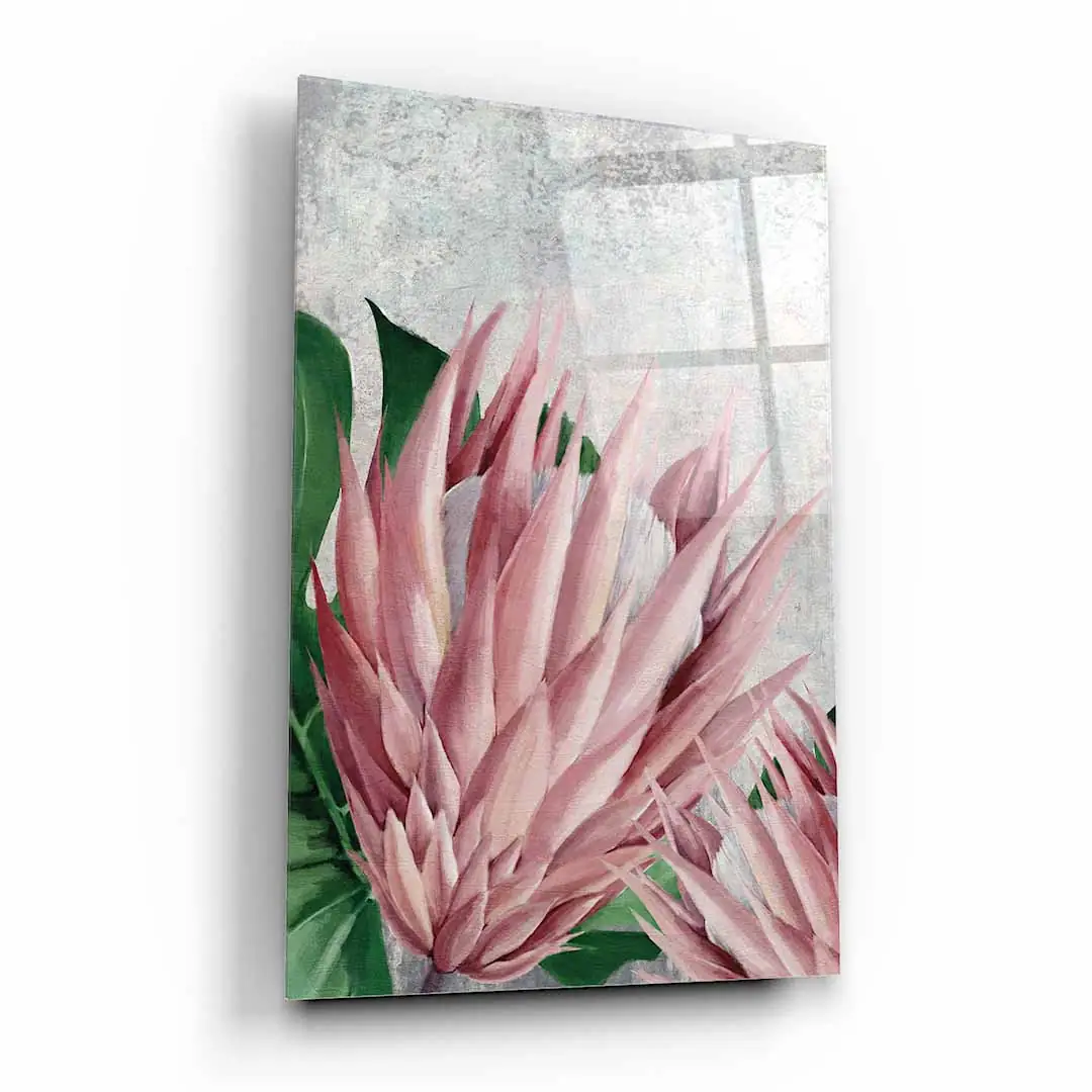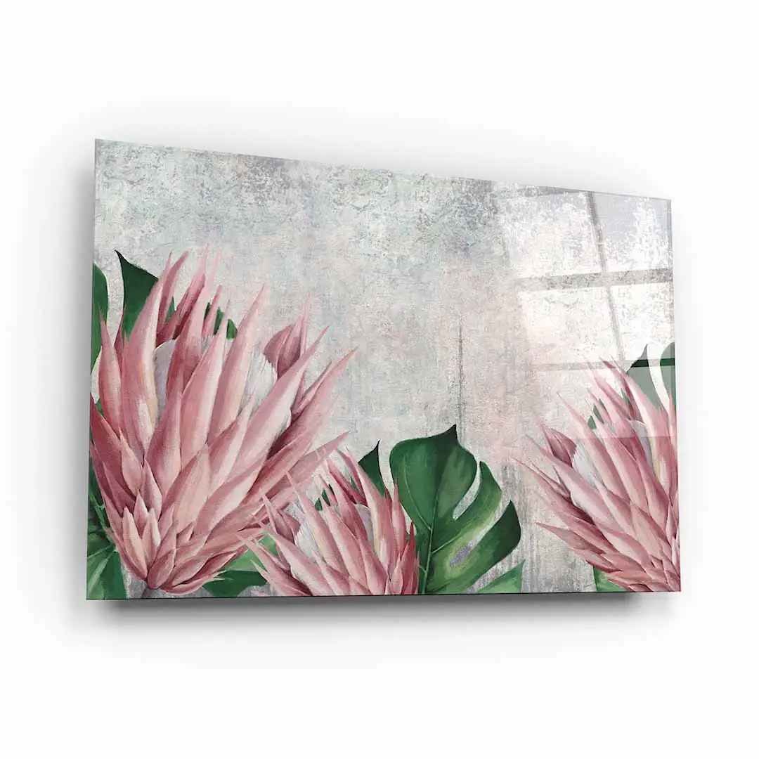 Obraz na szkle akrylowym - Botaniczny motyw z różowych kwiatów i tropikalnych liści do salonu, jadalni czy sypialni