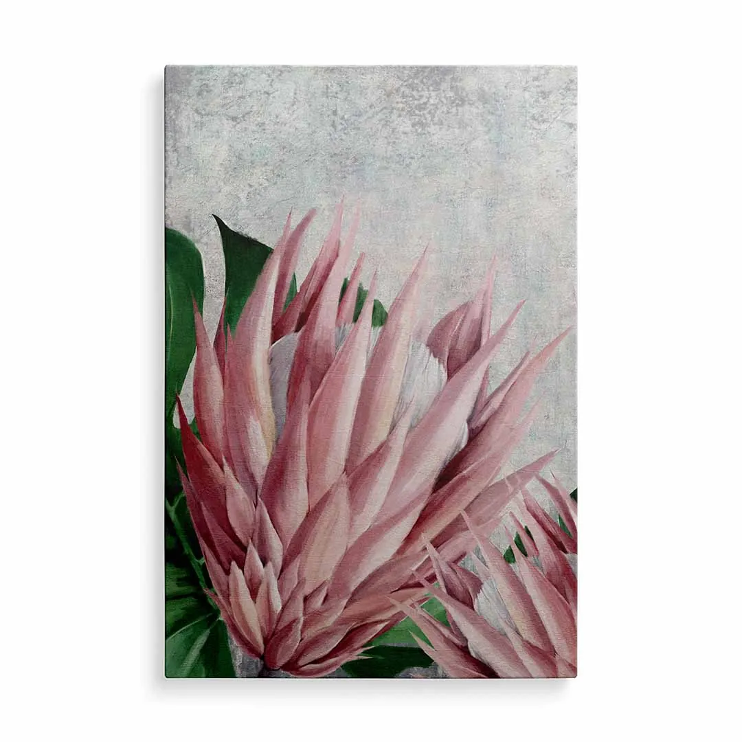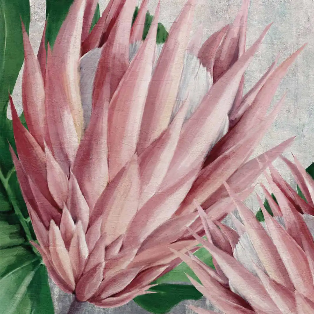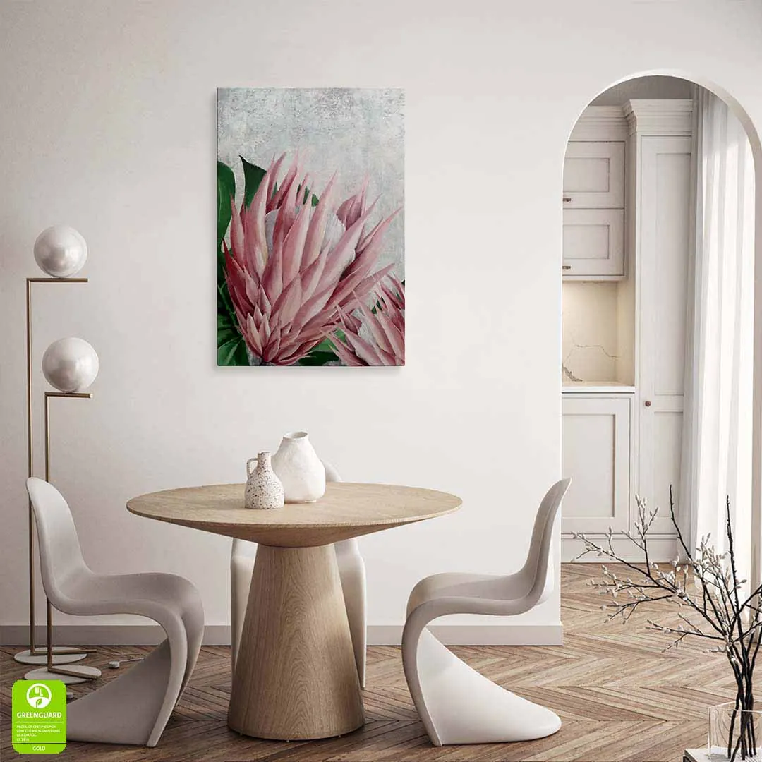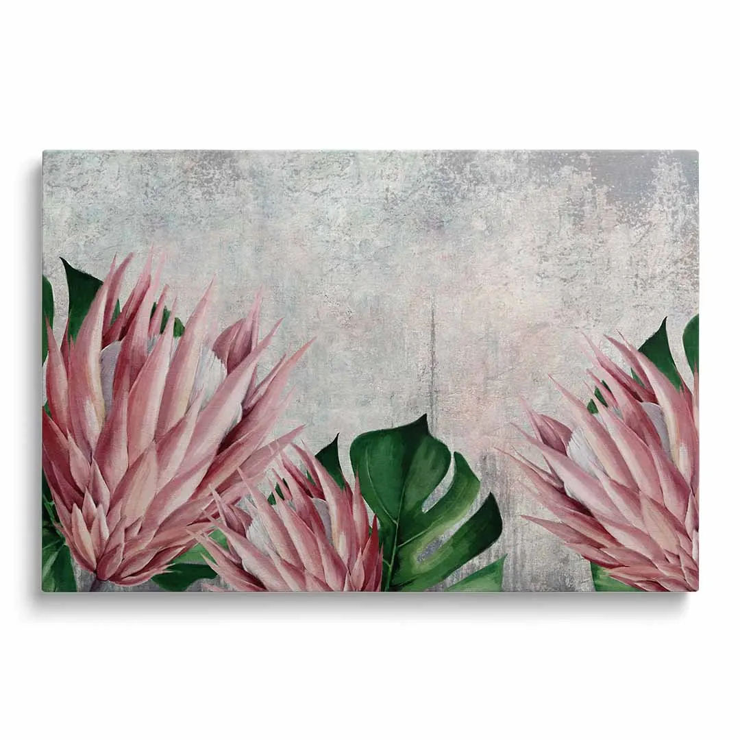 Obraz na szkle akrylowym - Botaniczny motyw z różowych kwiatów i tropikalnych liści do salonu, jadalni czy sypialni
