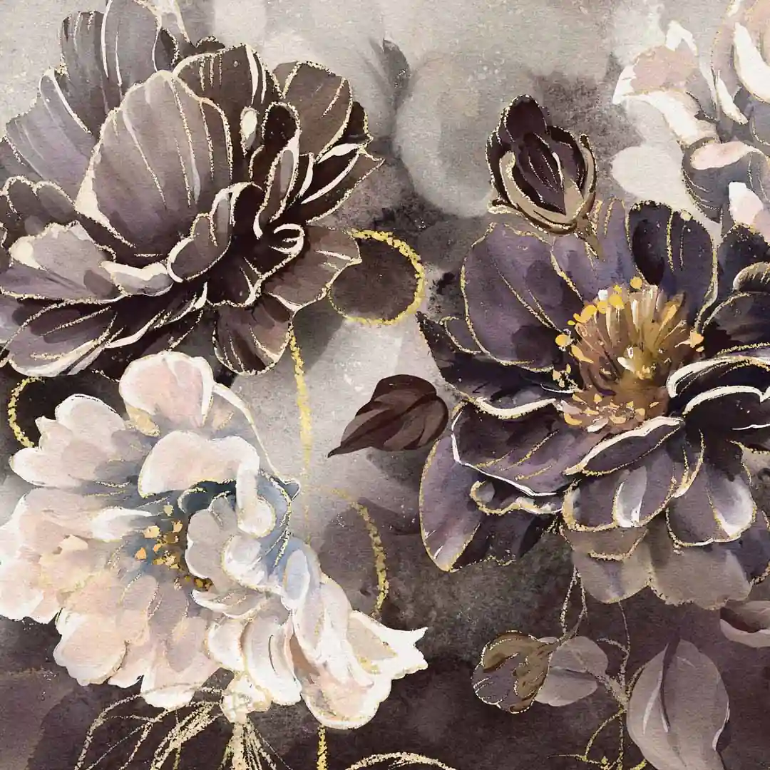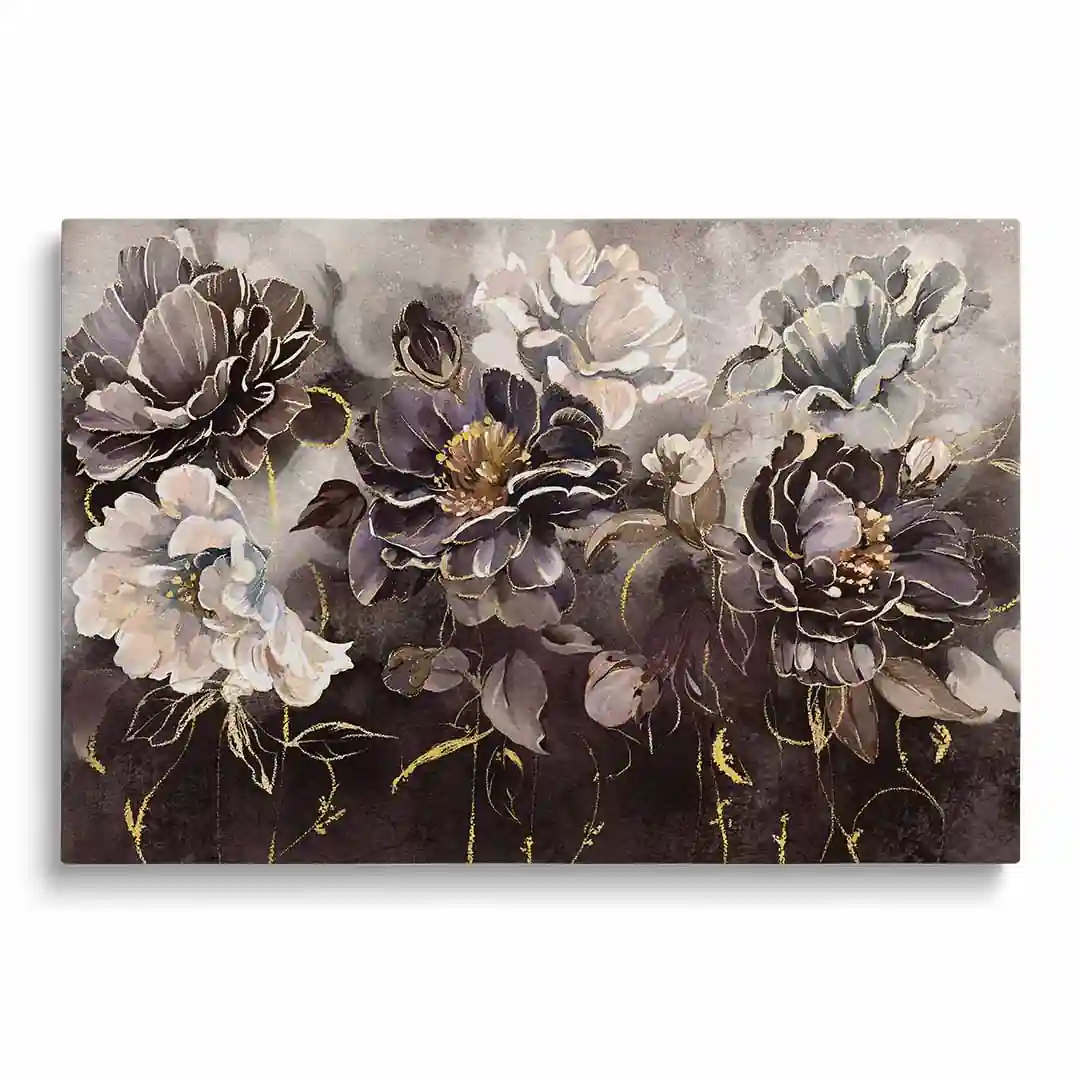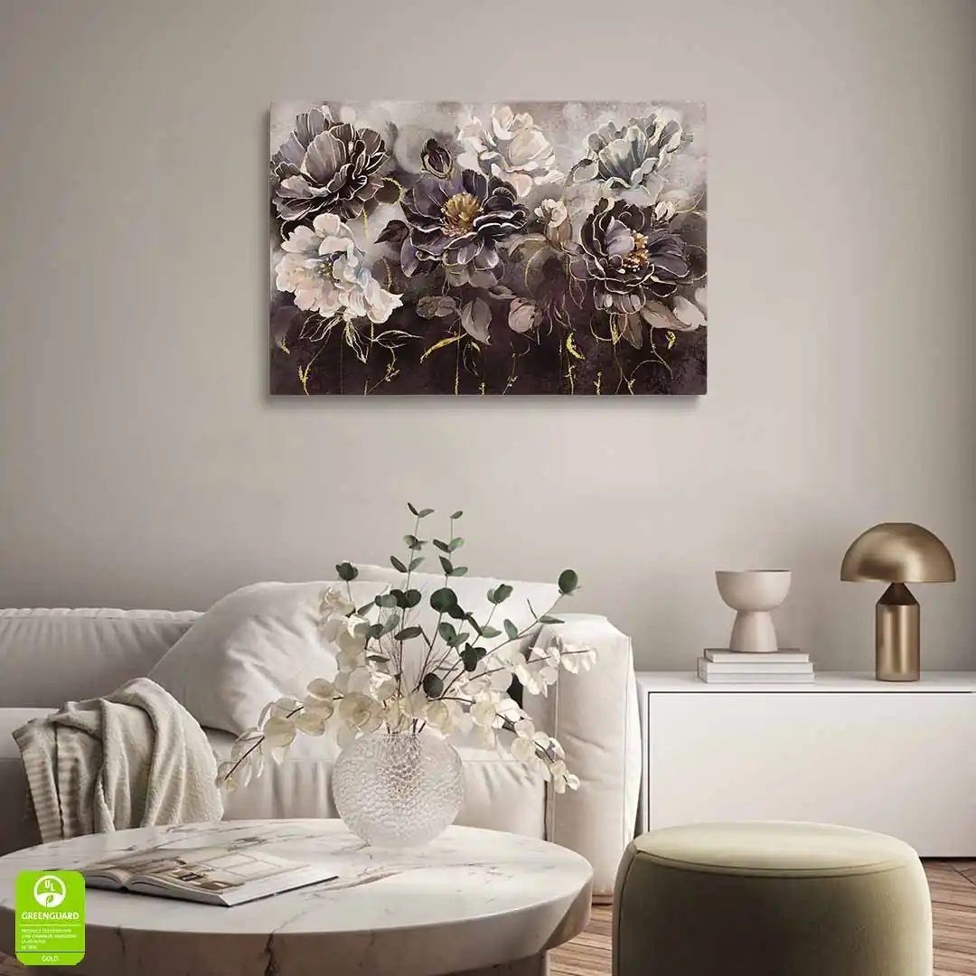 - techniką druku - proces drukowania wykorzystuje inne metody tworzenia kolorów (tzw. "przestrzeń barw") niż te, które stosowane są na ekranach komputera; kolory drukowane mogą wyglądać również nieco inaczej na różnych materiałach (np. canvasie, flizelinie, papierze czy szkle itp.) i przy użyciu różnych tuszy, w naszym przypadku tuszy do druku UV; złote elementy nie są wybiórczo metalizowane - efekt uzyskany jest poprzez wydruk tekstury w kolorze złota;