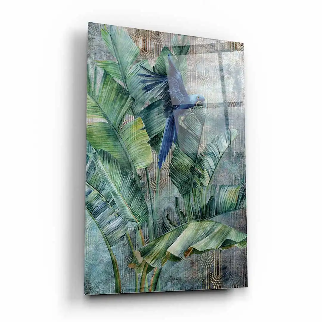 Obraz na szkle akrylowym - Cudownie niebieska papuga w liściach