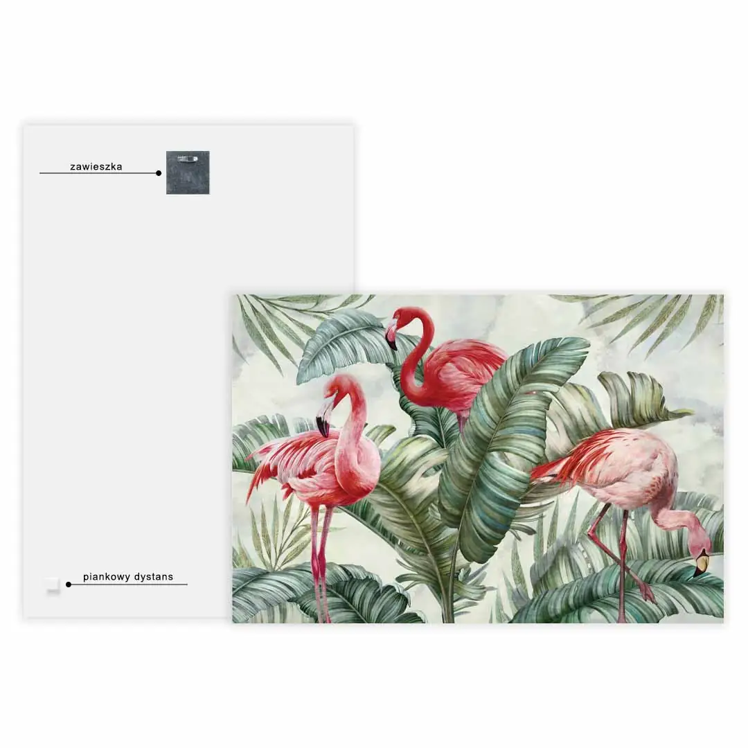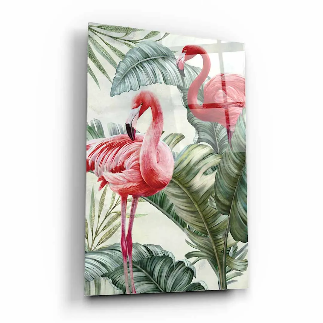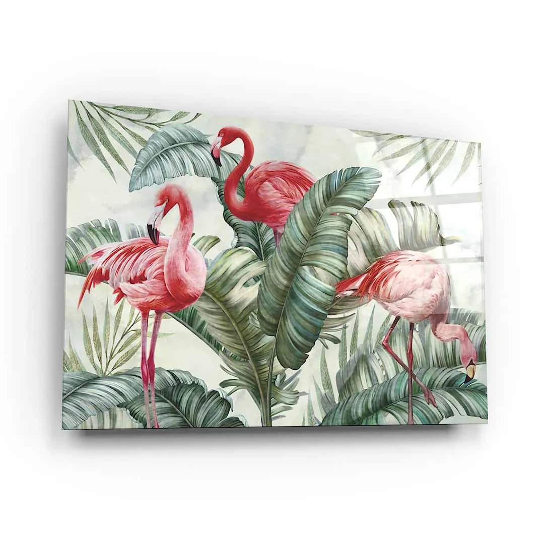 Obraz na szkle akrylowym - Flamingi w zielonych liściach