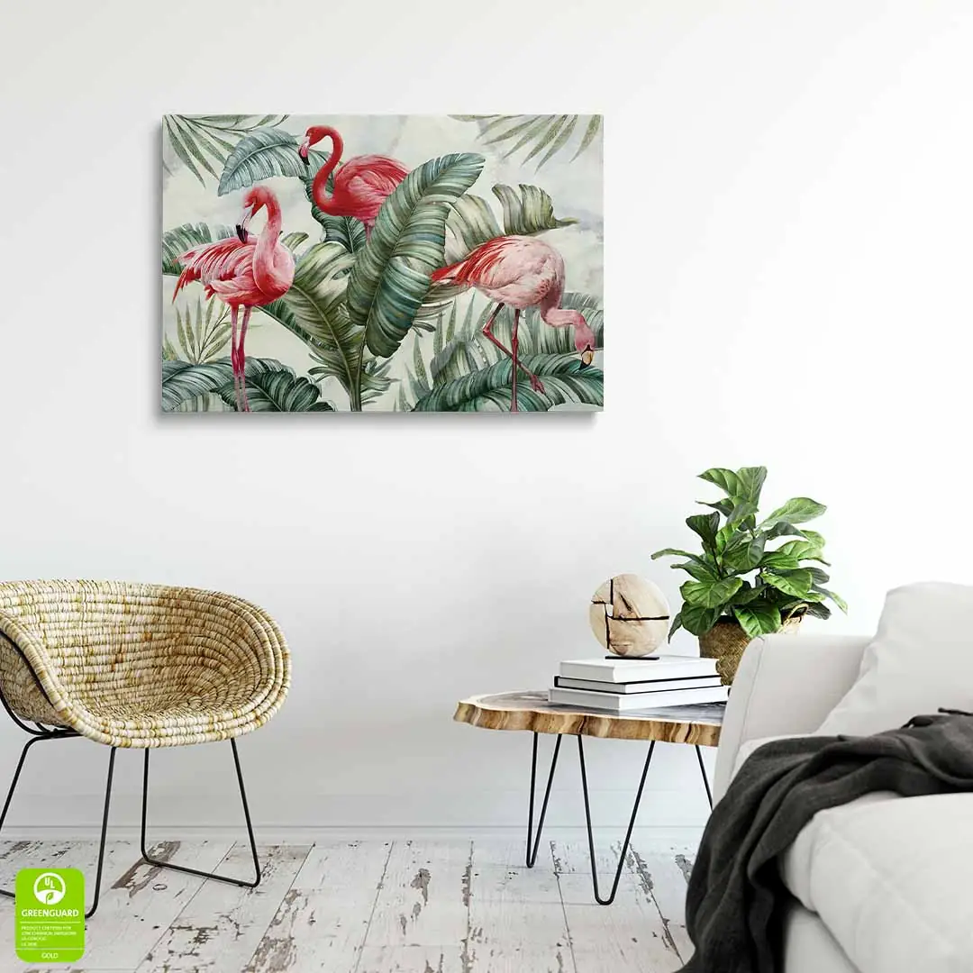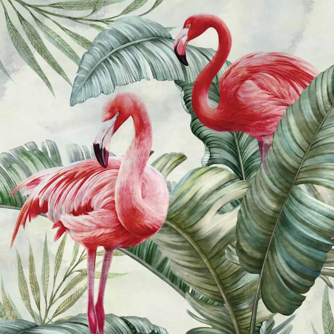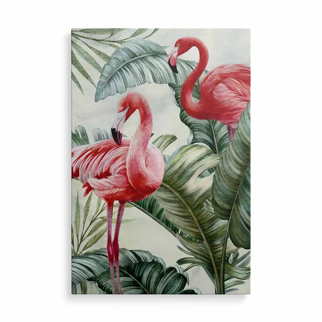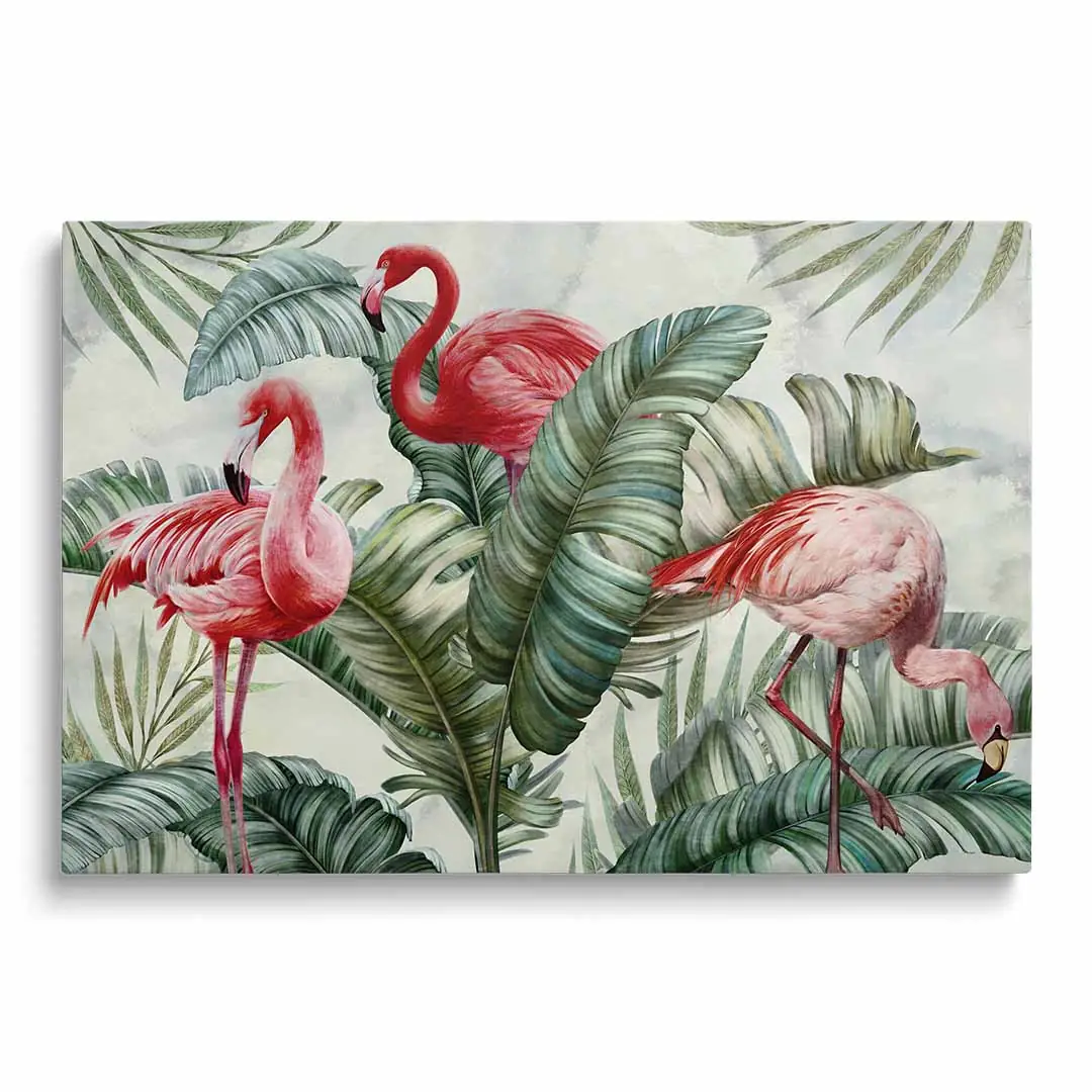 Obraz na szkle akrylowym - Flamingi w zielonych liściach