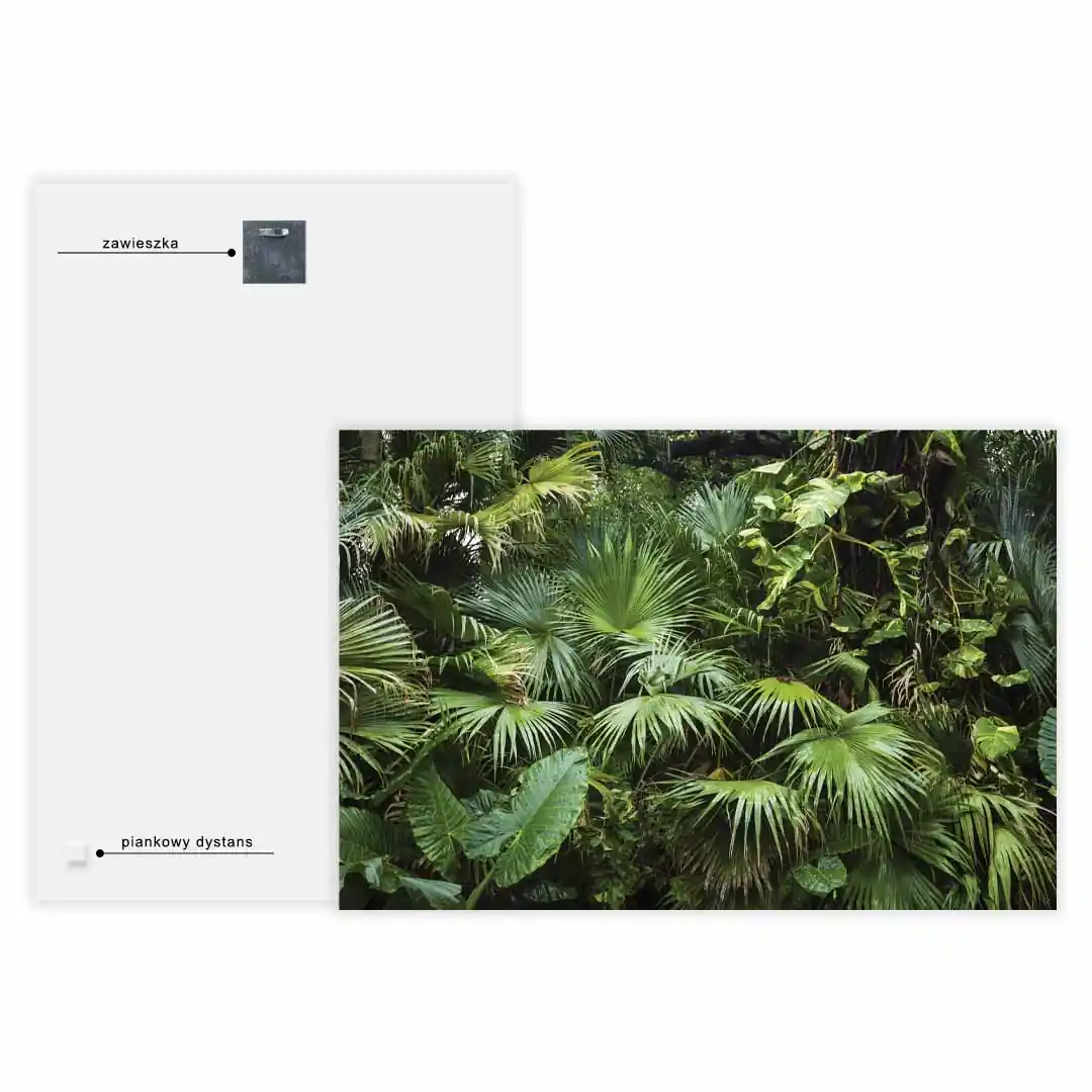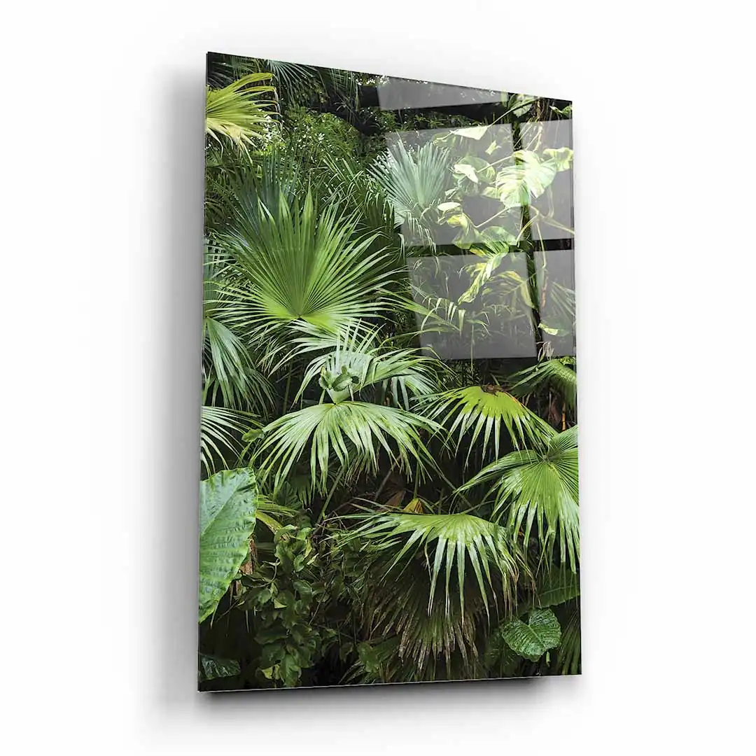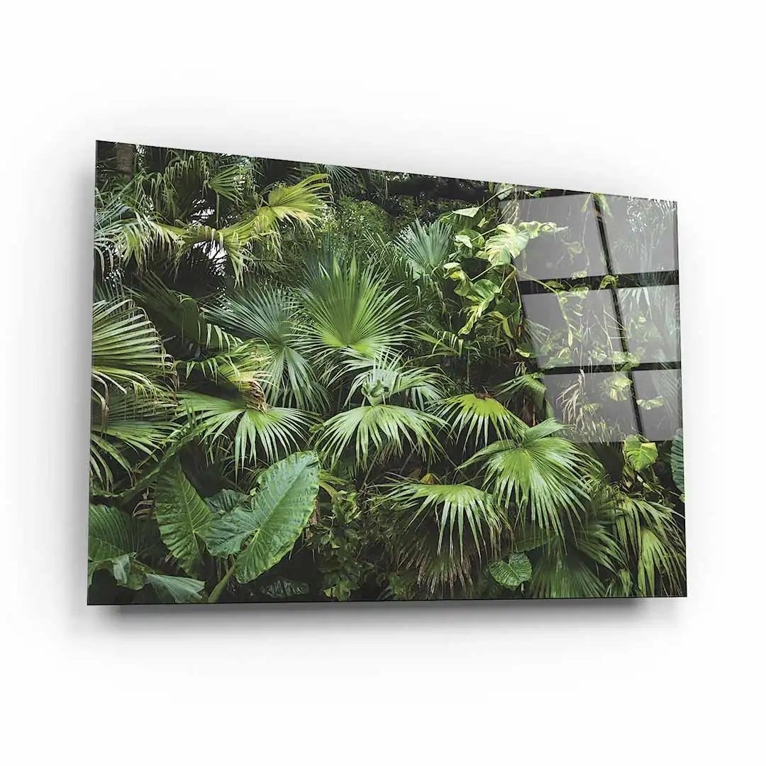 Obraz na szkle akrylowym - Gęsta dżungla, zielone liście palmy 3D do Salonu i Sypialni