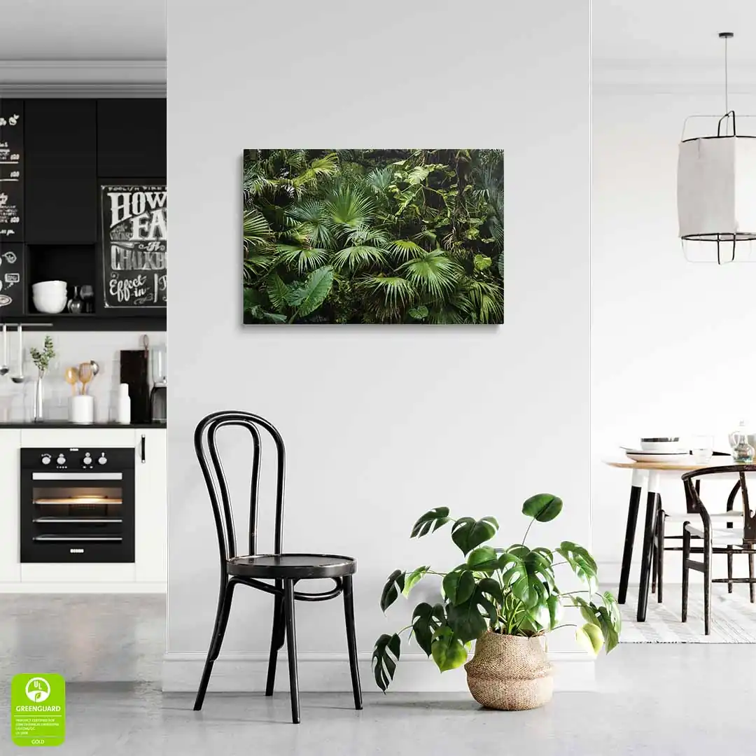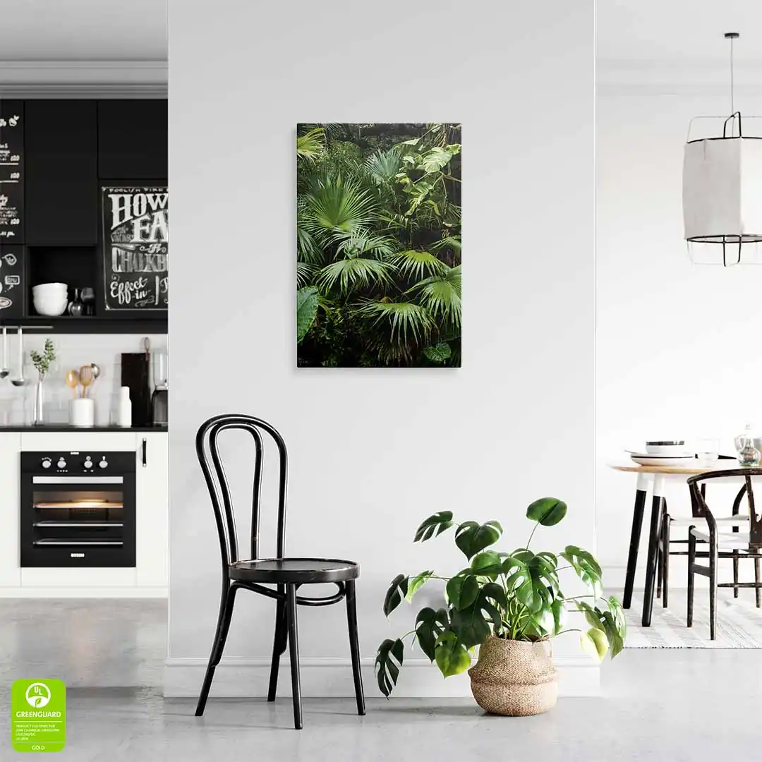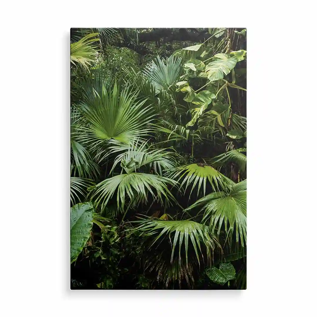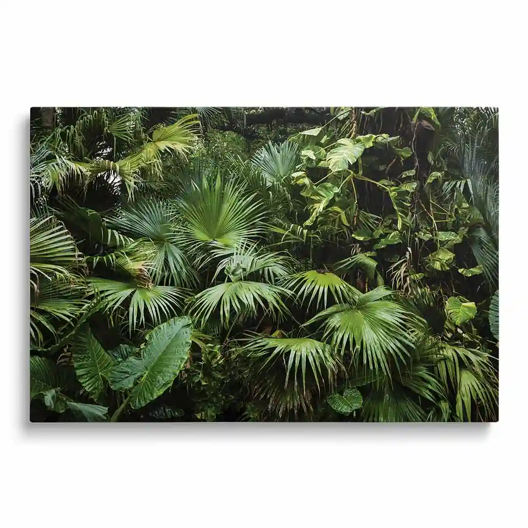 Obraz na szkle akrylowym - Gęsta dżungla, zielone liście palmy 3D do Salonu i Sypialni