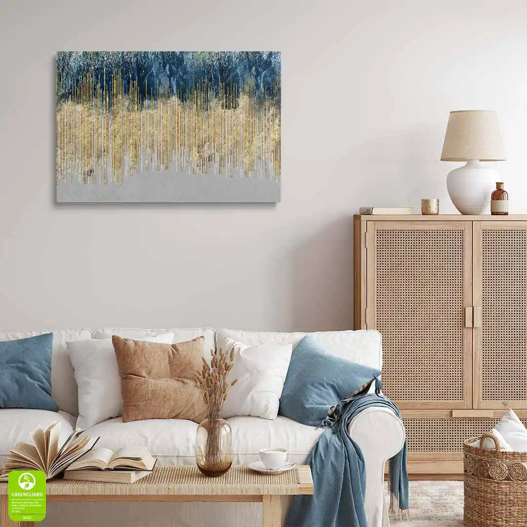 - techniką druku - proces drukowania wykorzystuje inne metody tworzenia kolorów (tzw. "przestrzeń barw") niż te, które stosowane są na ekranach komputera; kolory drukowane mogą wyglądać również nieco inaczej na różnych materiałach (np. canvasie, flizelinie, papierze czy szkle itp.) i przy użyciu różnych tuszy, w naszym przypadku tuszy do druku UV; złote elementy nie są wybiórczo metalizowane - efekt uzyskany jest poprzez wydruk tekstury w kolorze złota;