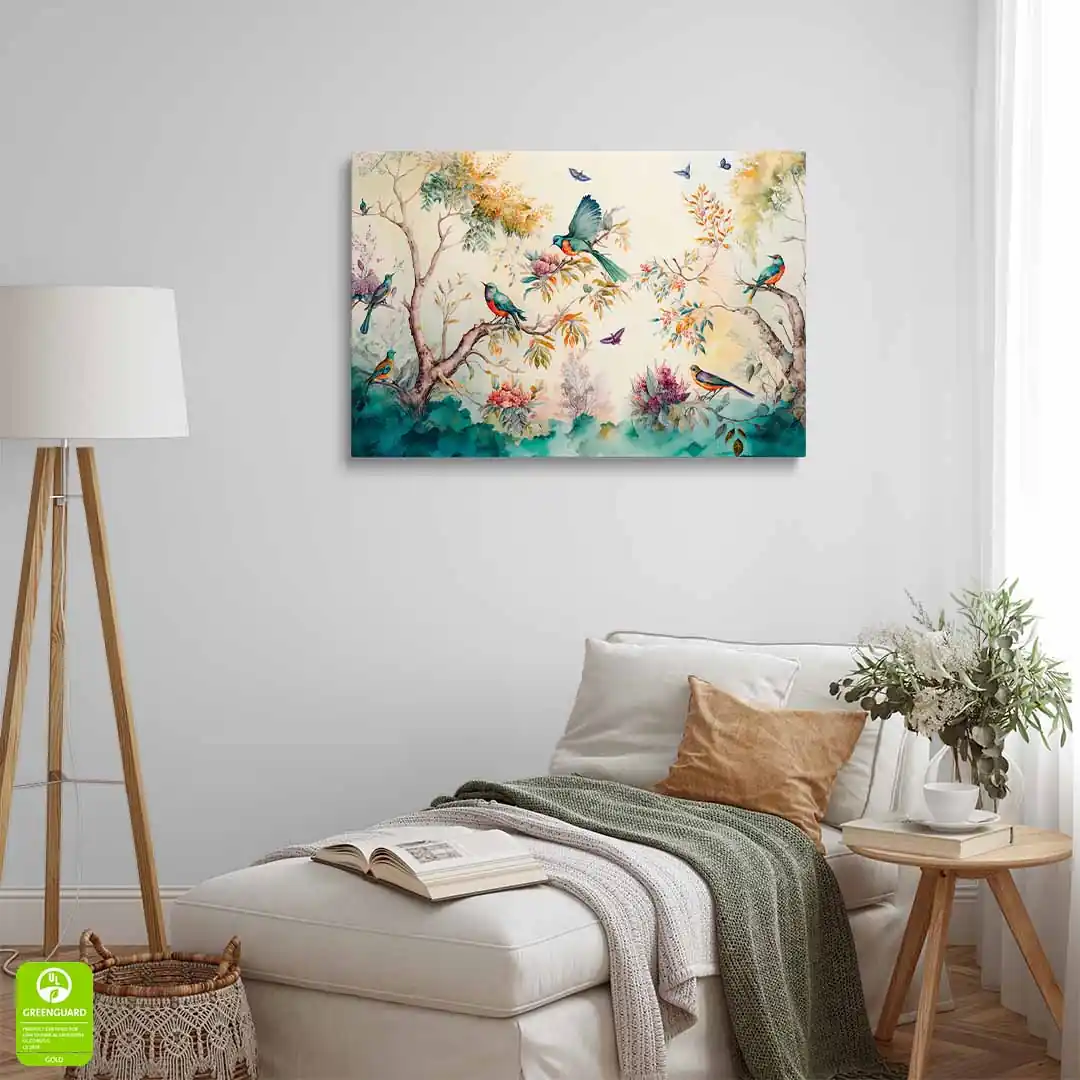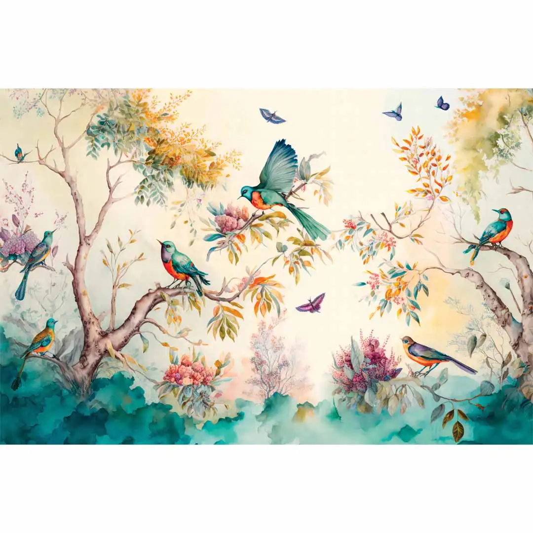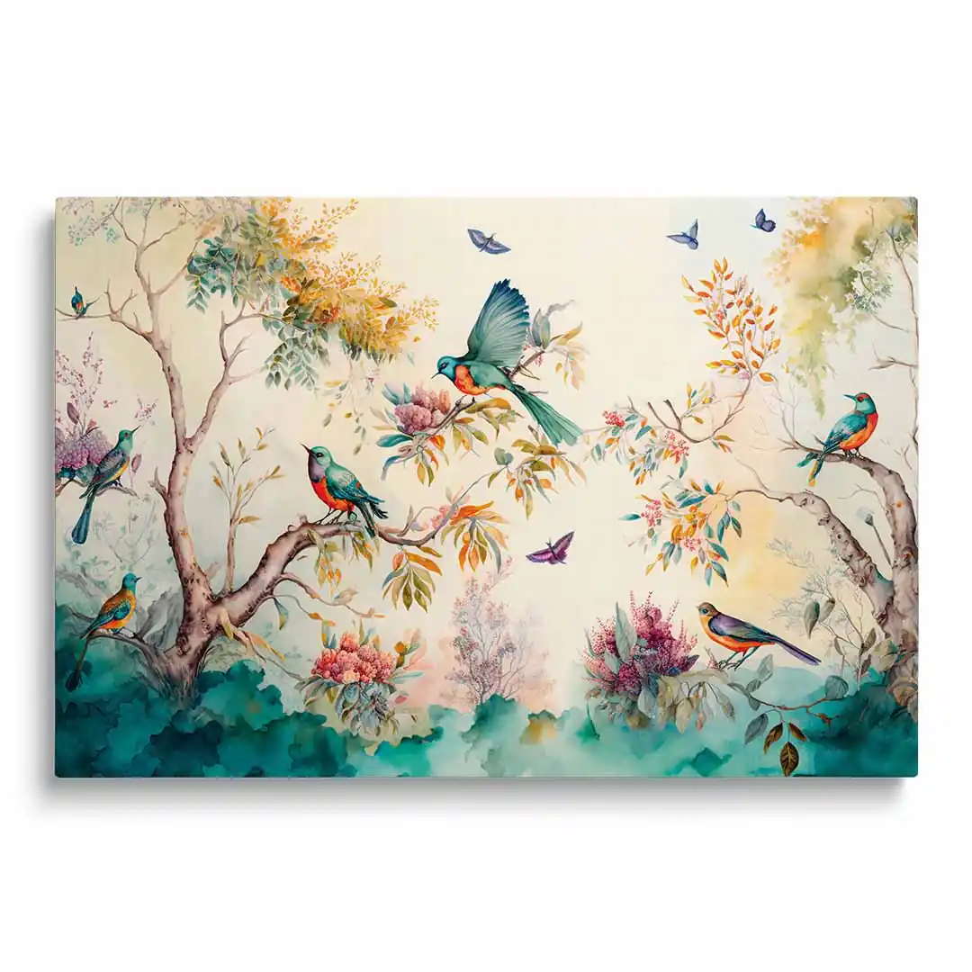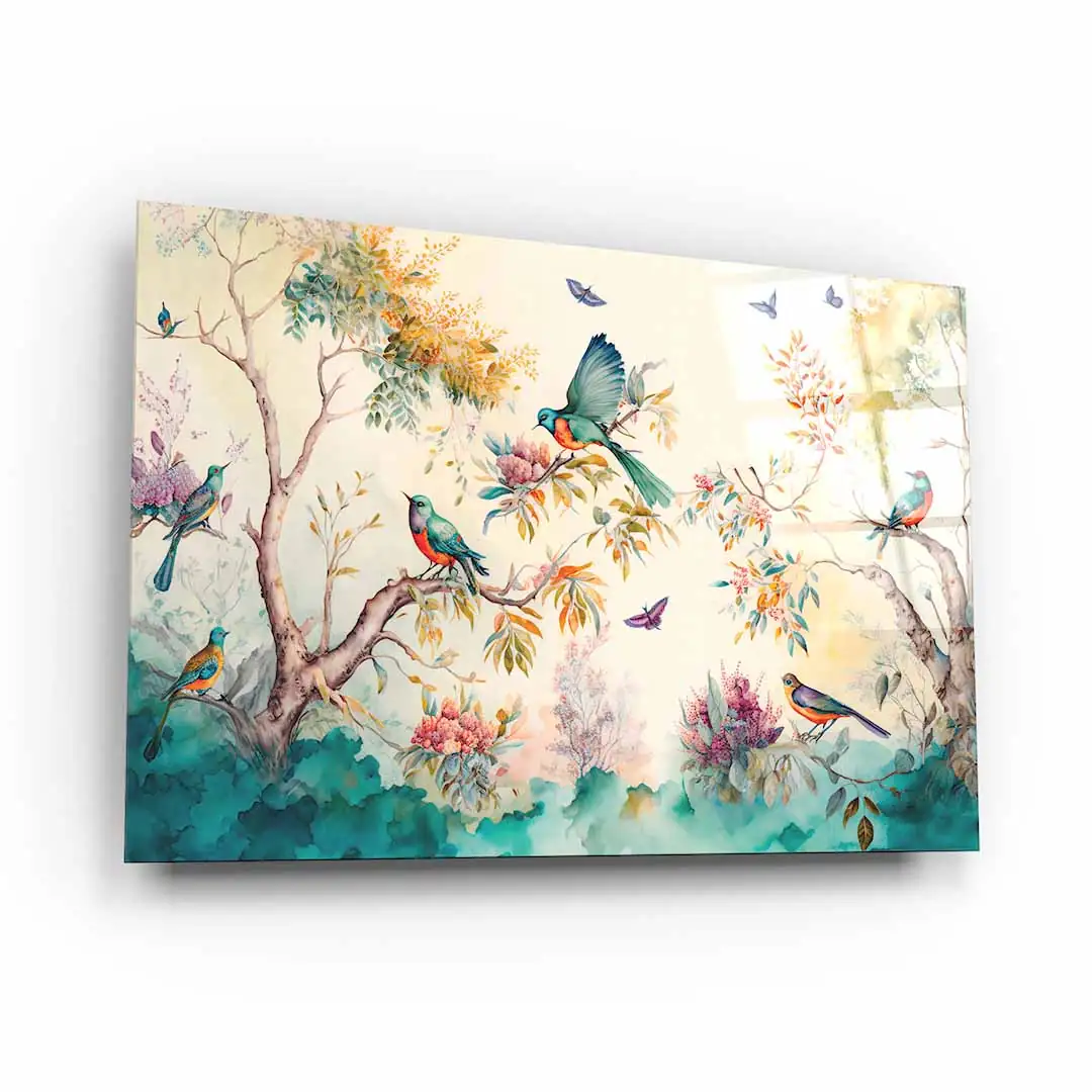 Obraz na szkle akrylowym - Las z kolorowymi ptakami