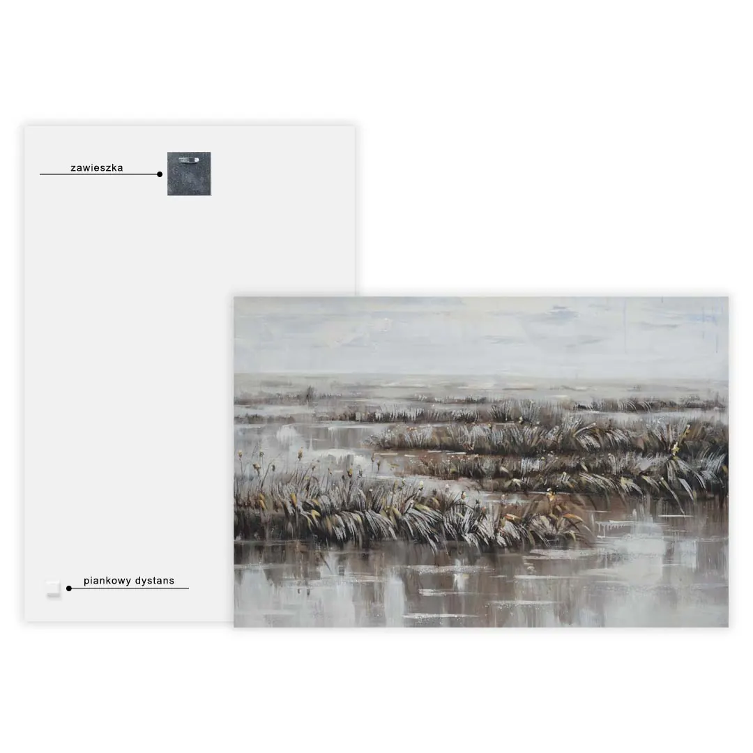 Montaż obrazu to szybki i bezproblemowy proces, ponieważ w zestawie znajdują się wszystkie niezbędne akcesoria mocujące. Narożniki obrazu są odpowiednio zabezpieczone na czas transportu, aby chronić krawędzie przed uszkodzeniem.